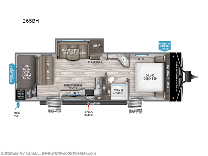 Are you ready to camp in comfort with your family or friends? This travel trailer allows you to do just that! There are double-size bunks in the back with step storage for books or board games. There is also a closet here to keep clothes wrinkle-free. The U-shaped dinette within the slide out can be switched out for the optional theatre seats, and the jackknife sofa will be the perfect spot to visit with your crew. This model features a walk-through bath that leads to the front master bedroom. You'll love the queen bed here, overhead storage, and your own exterior entry door for convenience.