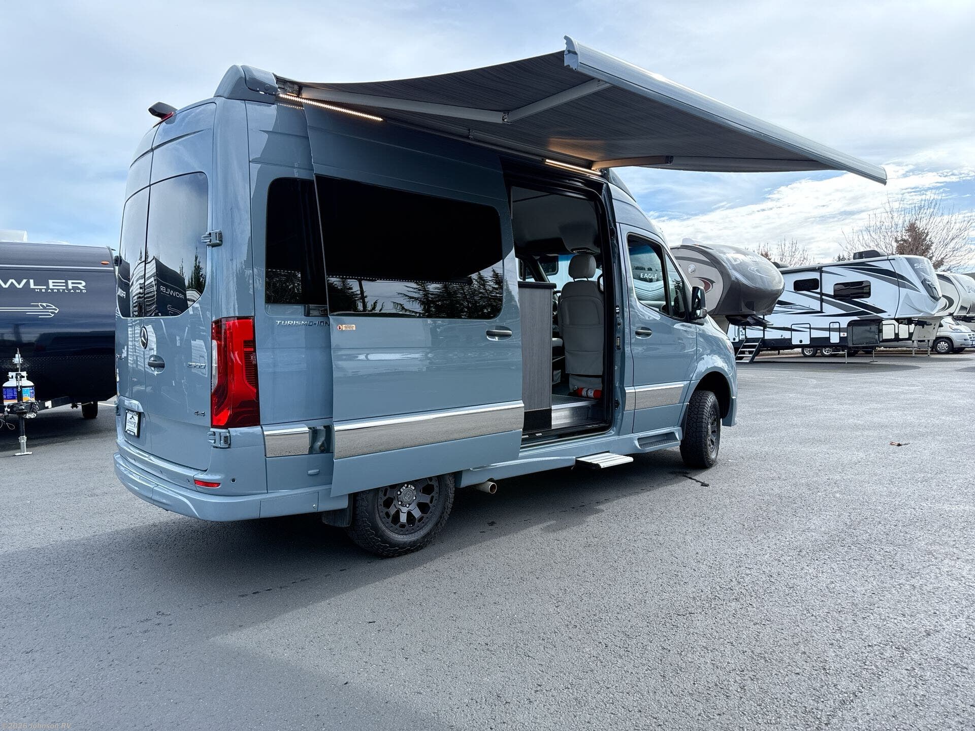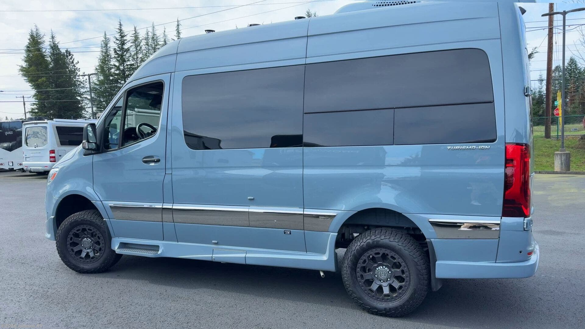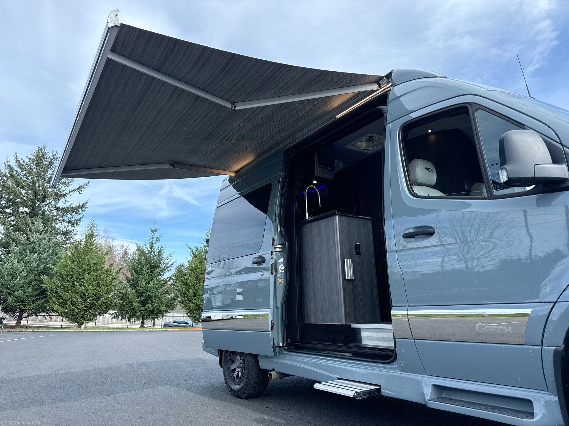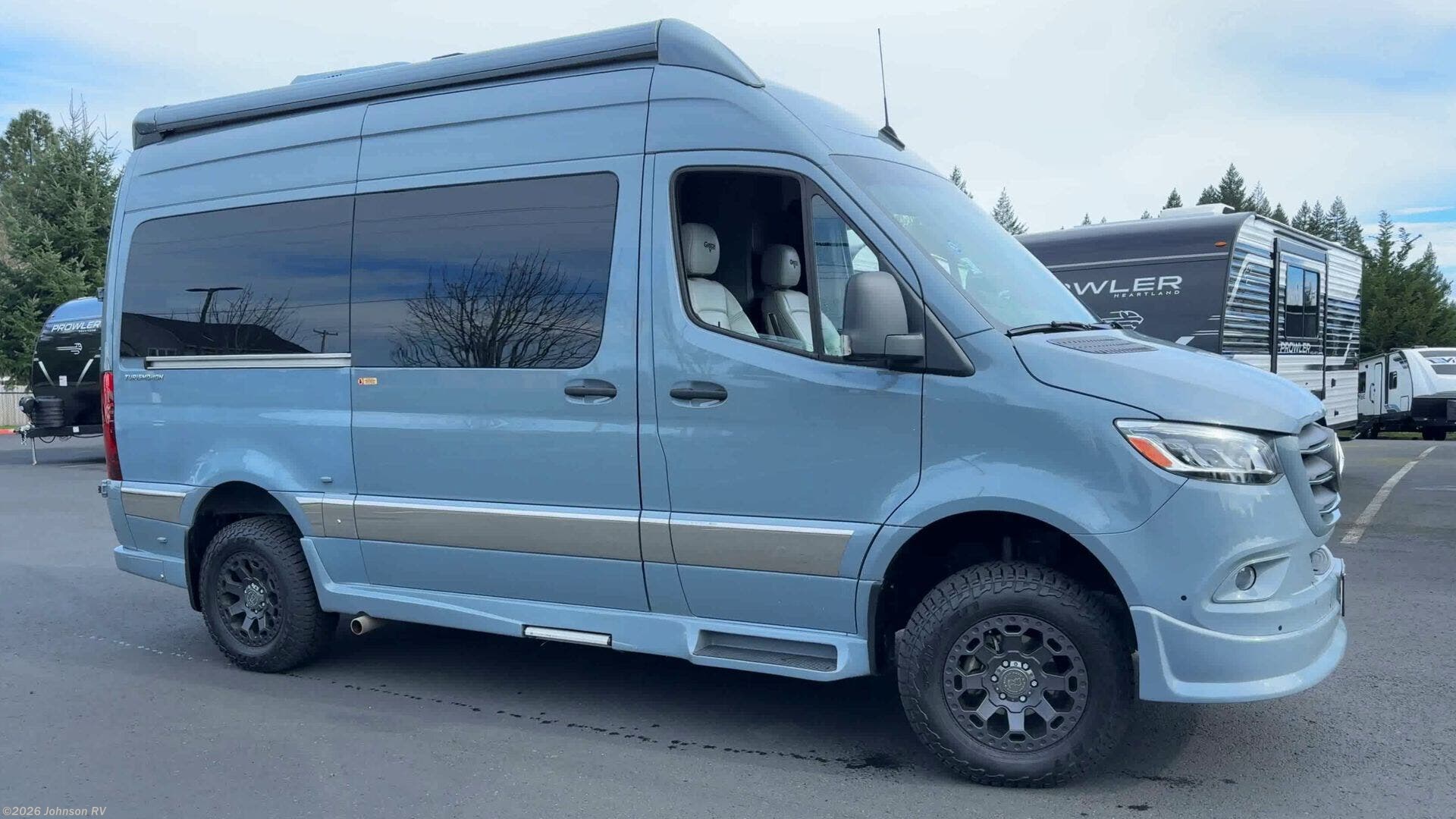 The 2023 Grech RV Turismo-ion 4x4 is a premium Class B diesel motorhome that combines luxury, innovation, and off-road capability. Built on the Mercedes-Benz Sprinter 2500 144" chassis with a 3.0L V6 turbodiesel engine producing 190 horsepower and 324 lb-ft of torque, paired with a 7-speed automatic transmission, it ensures reliable performance across diverse terrains. Inside, the Turismo-ion offers a thoughtfully designed living space featuring Ultraleather seating, Swiss Chrono hardwood cabinets, soft-touch walls and headliner, and LED ambient accent lighting. The memory foam power sofa bed provides comfortable sleeping arrangements, while the wet bath includes a ceramic toilet with foot flush, a retractable clothesline, a handheld showerhead, and a molded sink with vanity mirror. The van's advanced off-grid capabilities are powered by a 12V lithium-ion battery system, a 3,000-watt Xantrex inverter, and a 200W Zamp solar panel, allowing for extended trips without the need for a generator. The Timberline System provides continuous hot water and heat using diesel fuel.