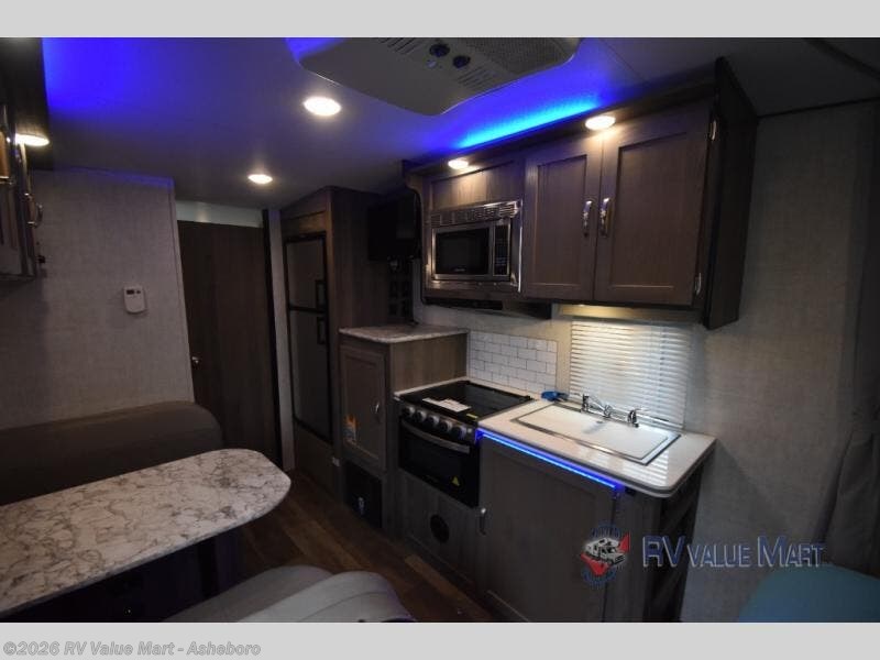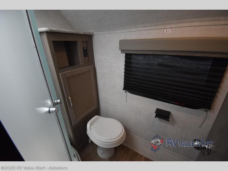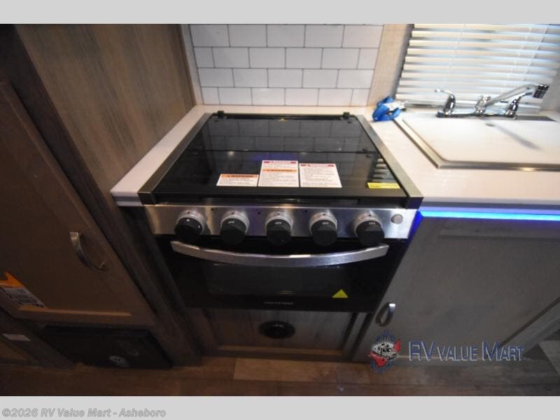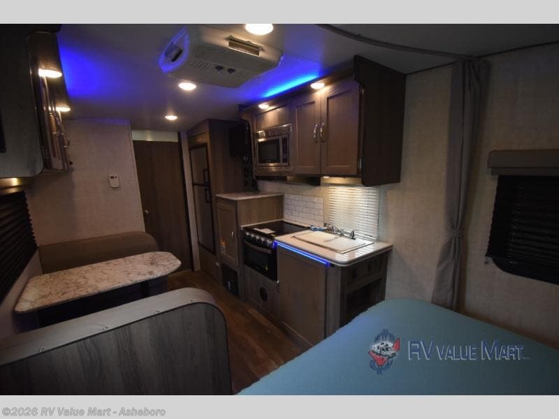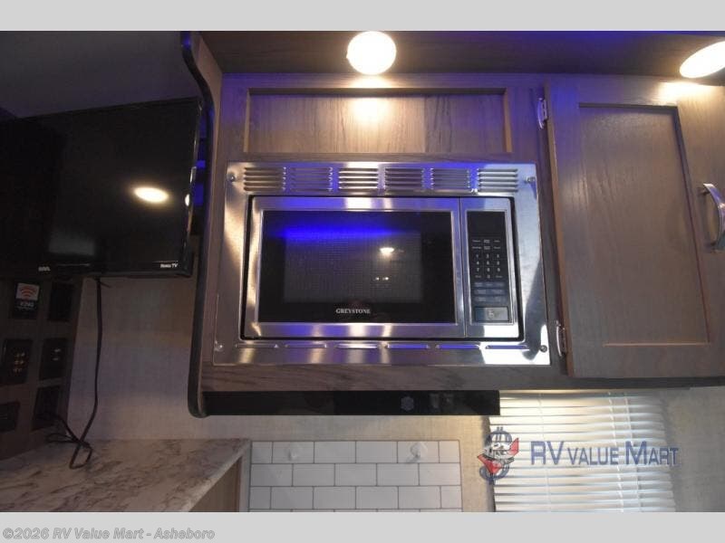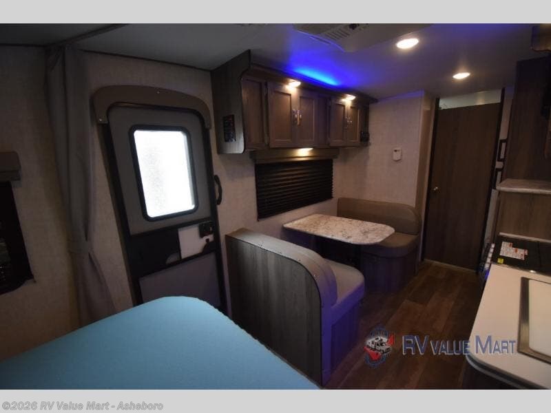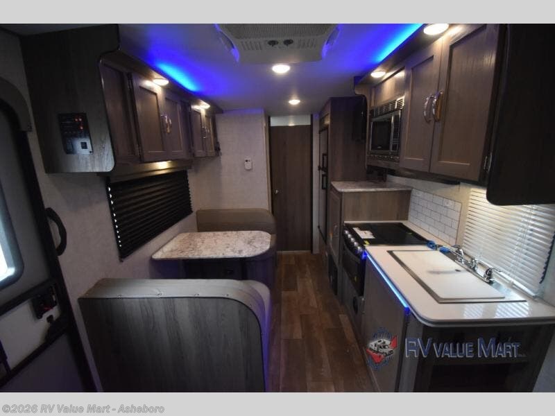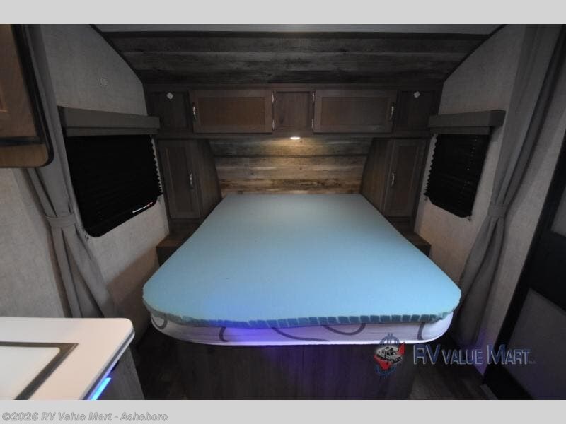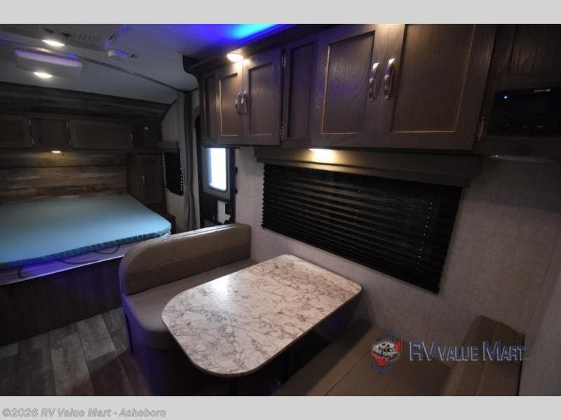 Enjoy a relaxing getaway with your spouse in this travel trailer! The front 60" x 74" bed ensures you will have a good night's rest each night, and the shirt closets on either side will keep your clothes looking nice. The rear full bathroom has a radius shower with a high velocity vent to eliminate any unwanted steam and a deluxe wood medicine cabinet with mirror. The pantry has a TV mount location by it and the three burner cooktop is just waiting for you to prepare a delicious home cooked meal that you can enjoy at the booth dinette!