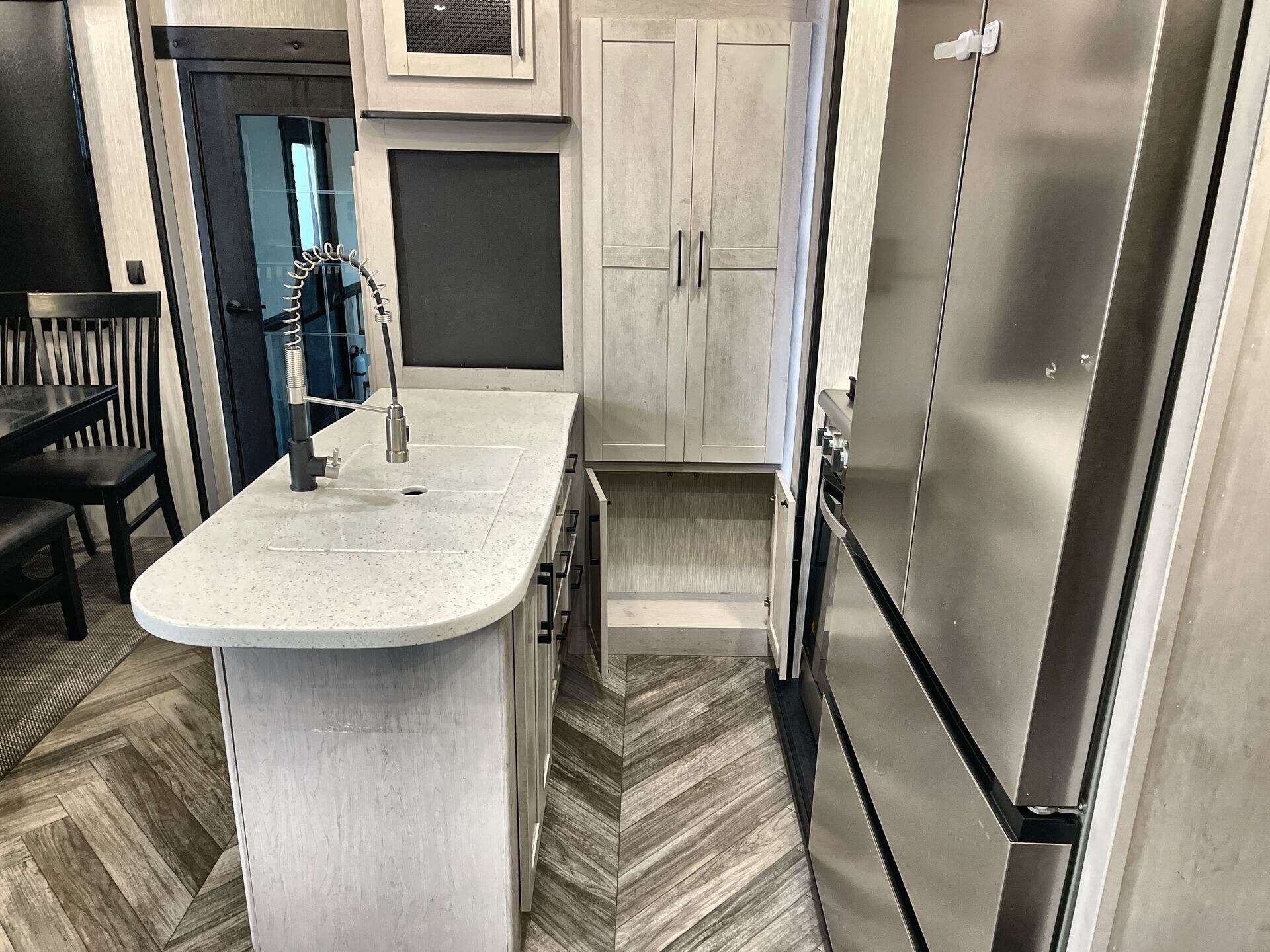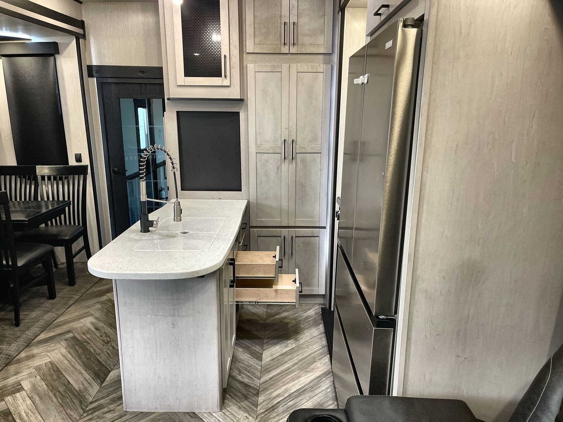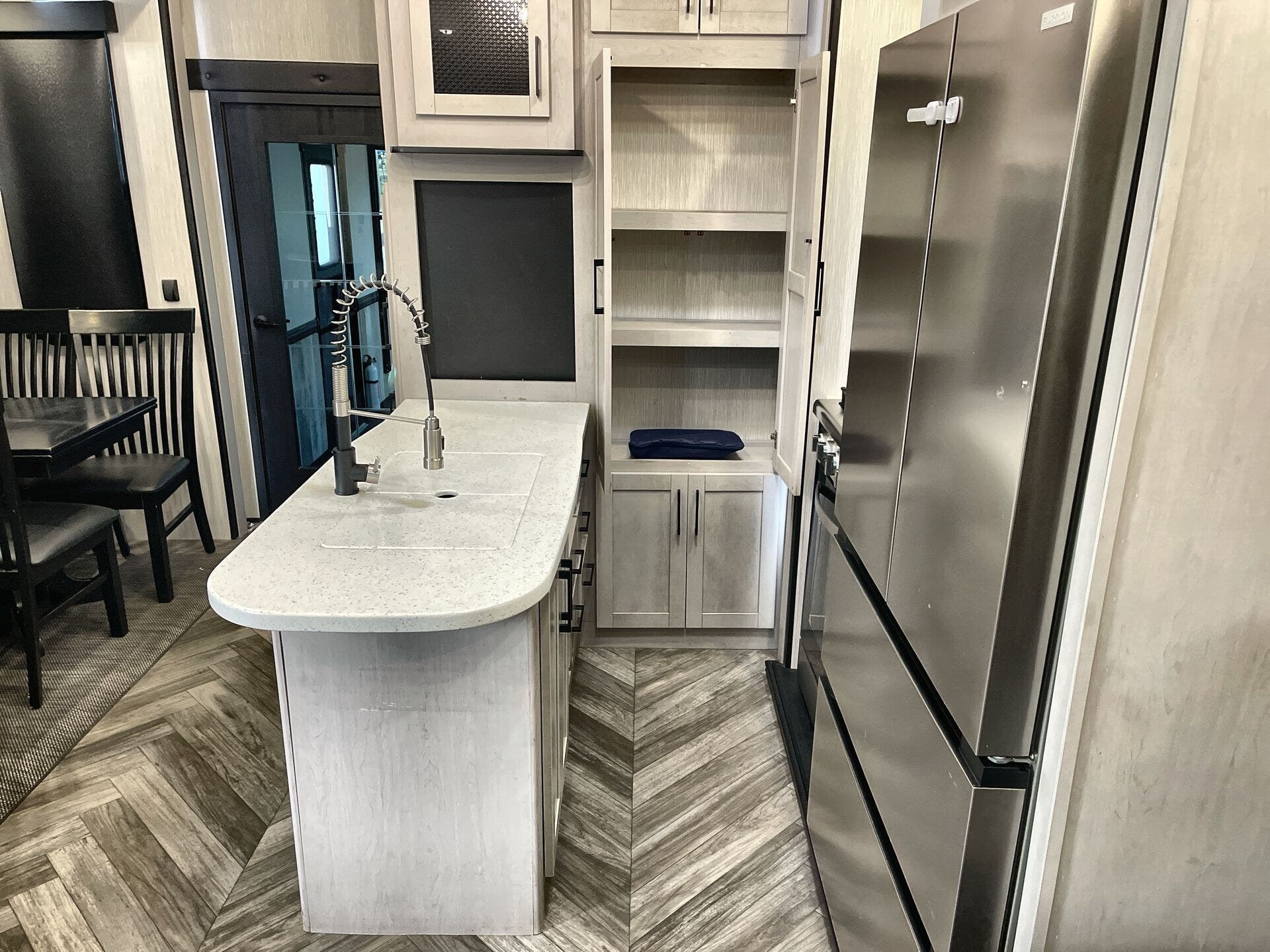Free Standing Dinette w/Chairs, King Size Bed, Kitchen Sink, Medicine Cabinet, Overhead Cabinetry, Pantry, Shower, Theater Seating, Toilet, Two Full Baths