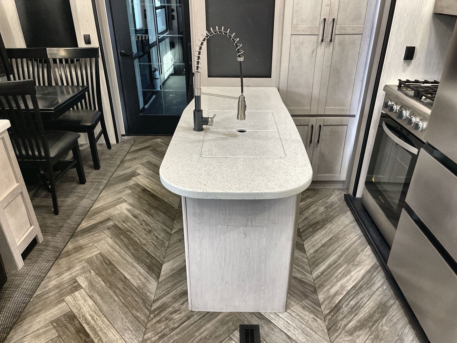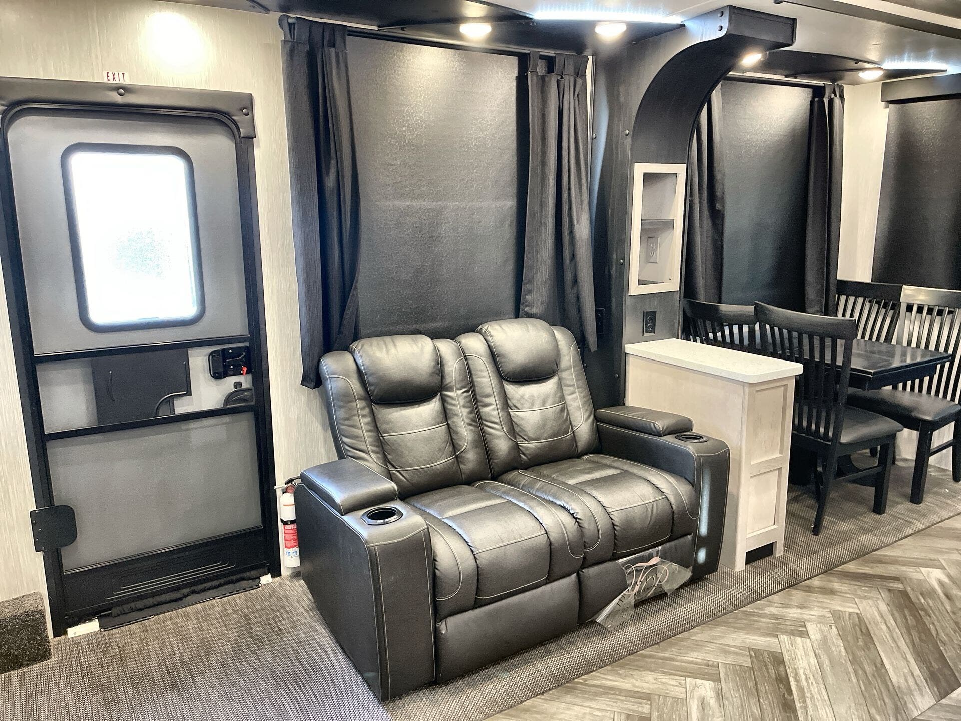 The 4014C floor plan maximizes livability with a Front Bedroom, Mid Bunk, Mid Kitchen, and Mid Living Area. It features two entry/exit doors and two full baths, delivering convenient access and ultimate privacy for guests and family members. Inside, you’ll find a well-appointed living zone with theater seating and a free-standing dinette with chairs, creating a welcoming area for movie nights, meals, and family gatherings.