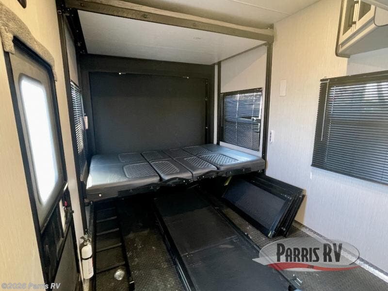 This Torque toy hauler is one of the best! It offers you an amazing front master suite which contains a tilting king-size bed that rests on a double slide giving you even more space, and the bedroom offers you a private entrance into the dual-entry bathroom. This bathroom contains a dual-sink vanity, so you and your loved one can brush your teeth together. Since there is a convenient half bath and an electric queen bed in the 14' garage, you'll have a great guest suite that you can offer to your friends. There are also two entry doors on this unit, so you can choose to access the garage without having to open up the ramp door.