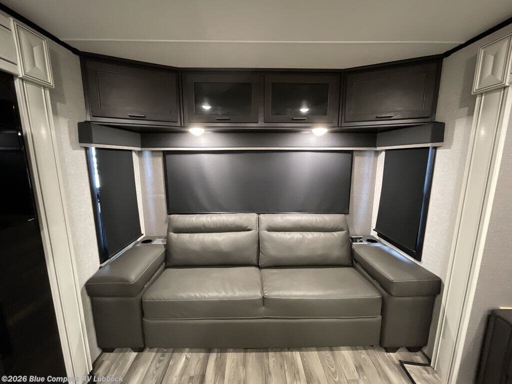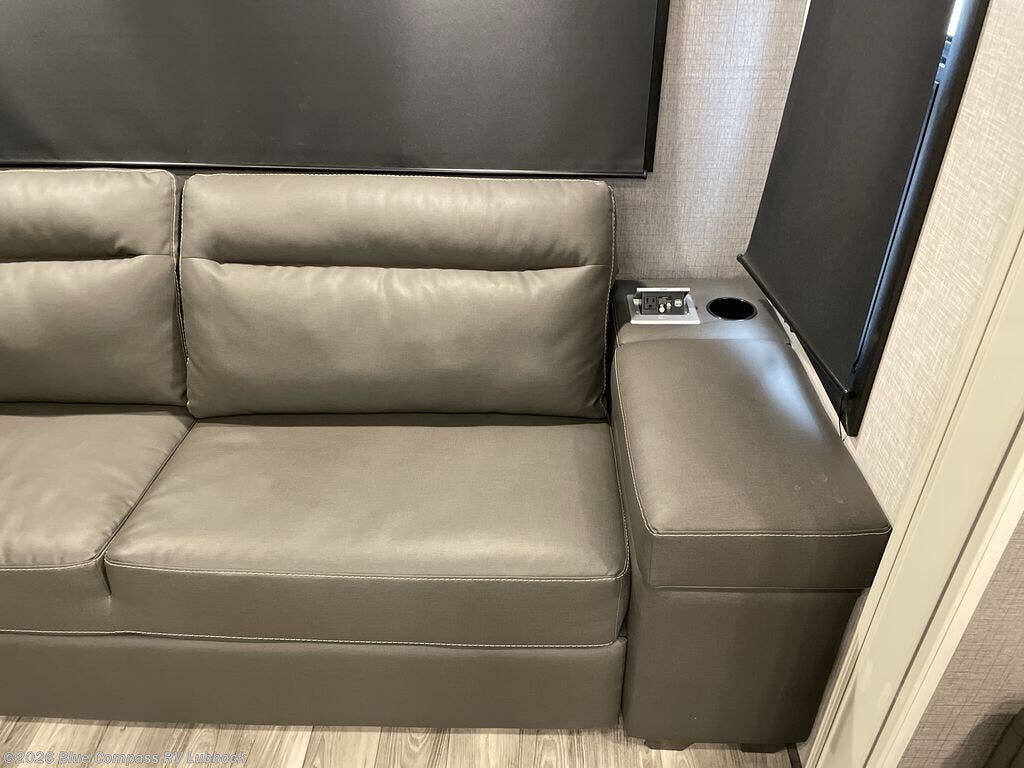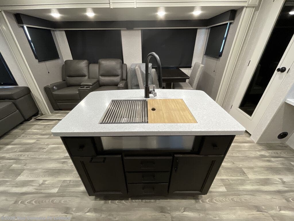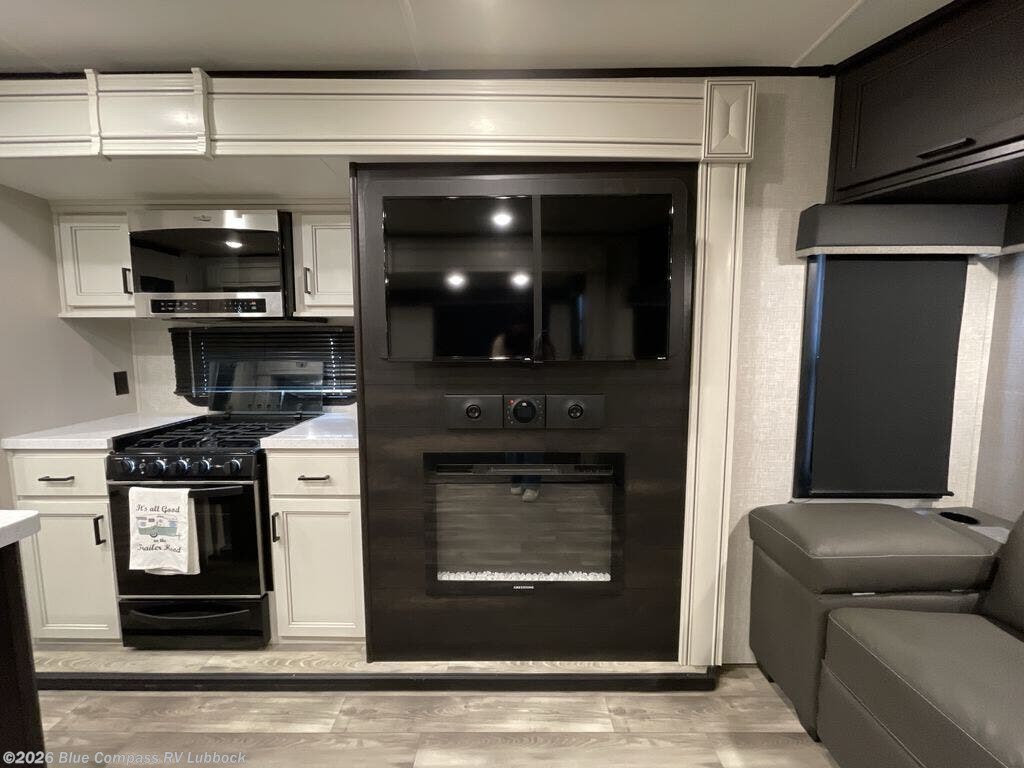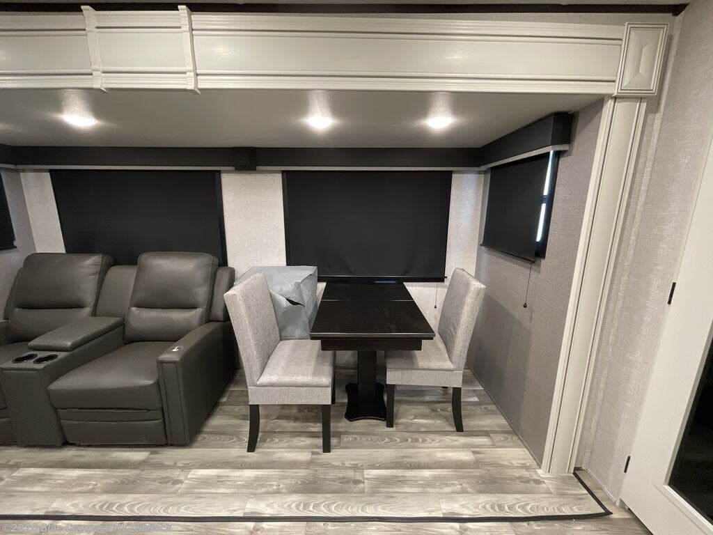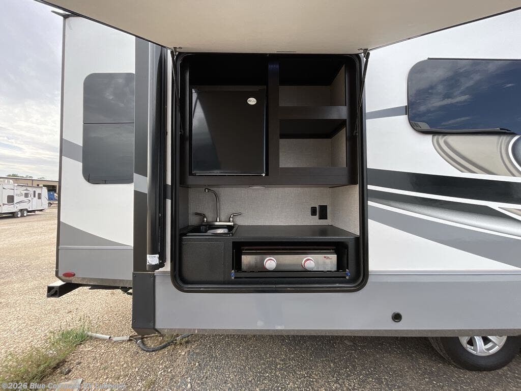 Living in this trailer is made easy with all the conveniences and comforts found throughout! So pick your destination, hitch up and head out! The private bedroom is up front and includes a mirrored wardrobe, a queen bed slide, or choose the king option, a dresser, a space prepped for a washer/dryer option plus access to the double entry full bath. The main living and kitchen area is spacious with dual opposing slides and offers the cook full amenities including a kitchen island and large pantry, plus you can dine at the booth dinette or choose a free standing table and chairs in its place. The theater seats and tri-fold sofa with adjustable headrests allow you to relax while watching the 39" LED HDTV with a fireplace below. And don't forget about the outside kitchen when making meals and the two power awnings providing protection from the elements.