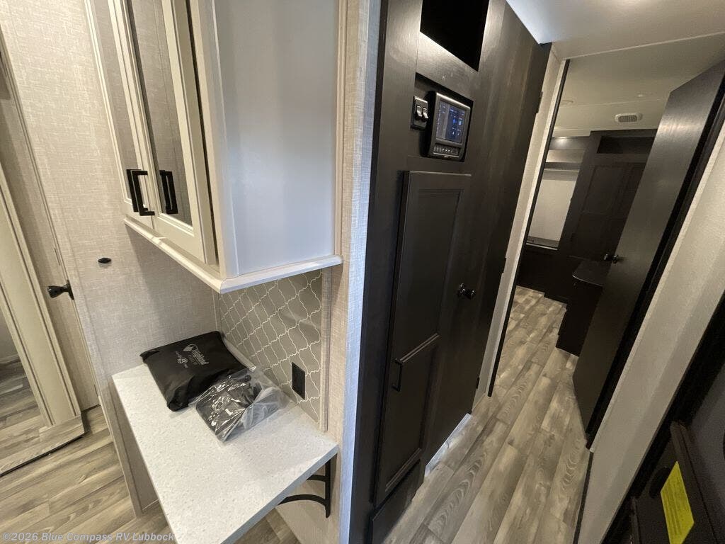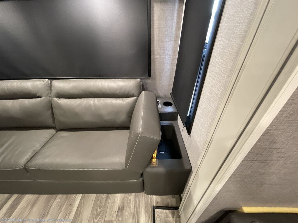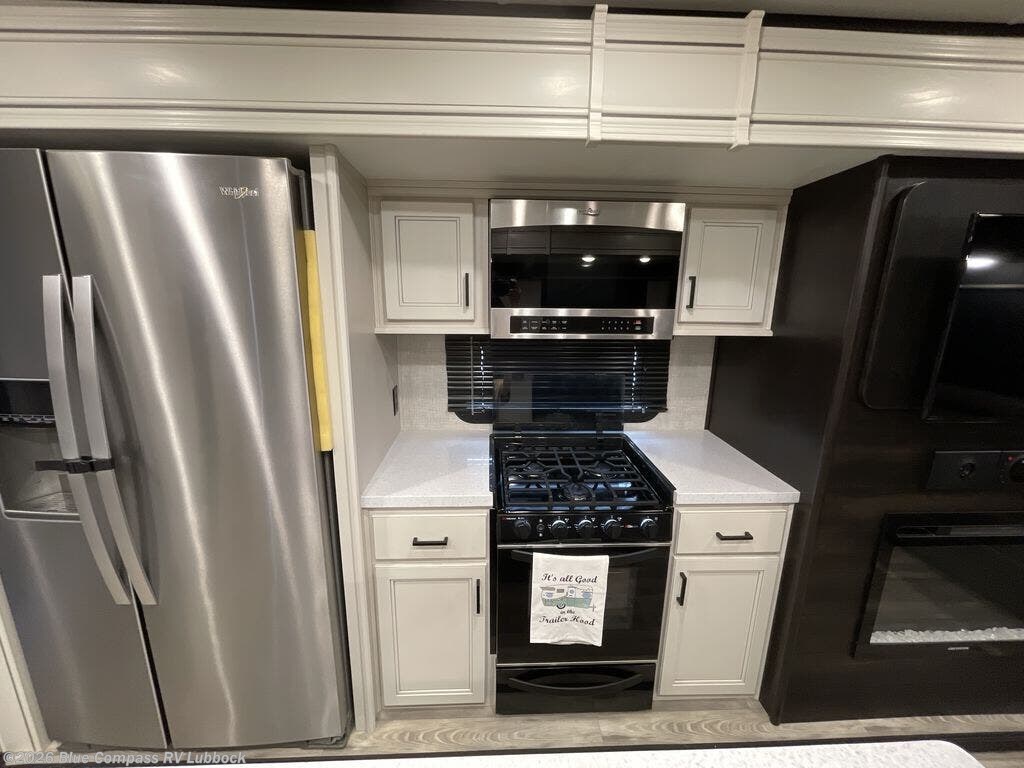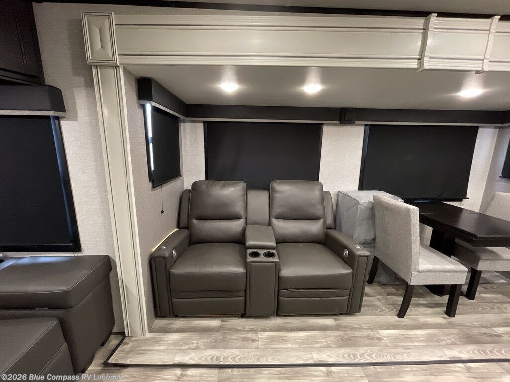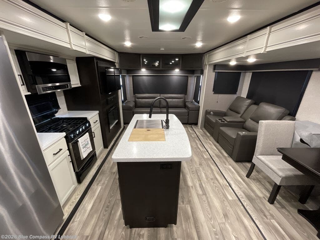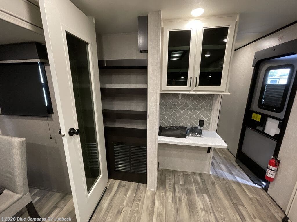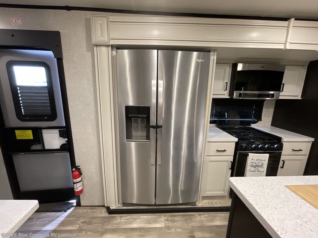 Living in this trailer is made easy with all the conveniences and comforts found throughout! So pick your destination, hitch up and head out! The private bedroom is up front and includes a mirrored wardrobe, a queen bed slide, or choose the king option, a dresser, a space prepped for a washer/dryer option plus access to the double entry full bath. The main living and kitchen area is spacious with dual opposing slides and offers the cook full amenities including a kitchen island and large pantry, plus you can dine at the booth dinette or choose a free standing table and chairs in its place. The theater seats and tri-fold sofa with adjustable headrests allow you to relax while watching the 39" LED HDTV with a fireplace below. And don't forget about the outside kitchen when making meals and the two power awnings providing protection from the elements.