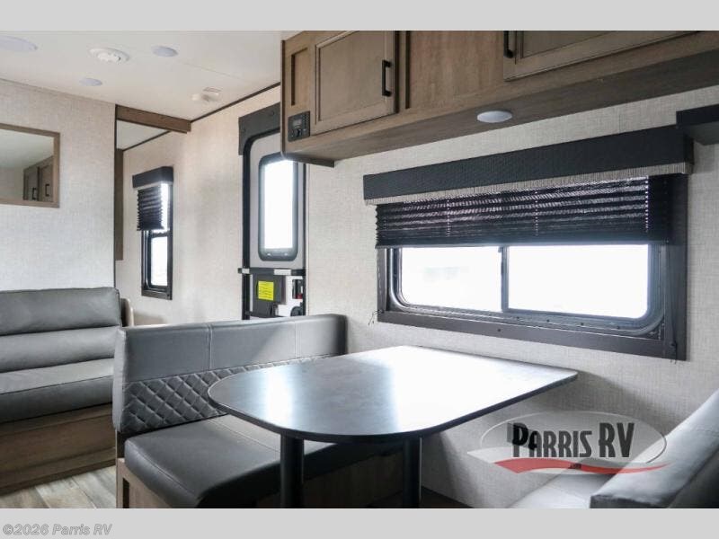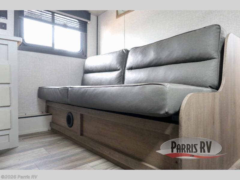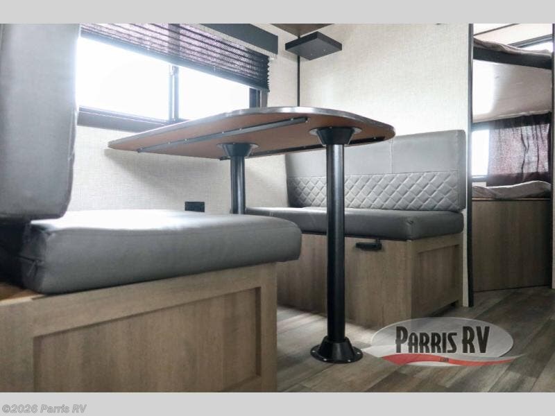 This dual-axle travel trailer can sleep eight people each night, so invite your family or friends along. You will enjoy the front private bedroom up front with dual wardrobes to keep your clothes tidy, and an easy lift bed with storage. While the chef of your group is preparing lunch on the three burner cooktop, everyone else can visit on the jack-knife sofa or play a game at the booth dinette. You will also find a large 19' power awning with LED lights outdoors which is where you may usually find everyone. The private tub/shower and toilet is right next to the double-size bunks for convenience, and the sink is just outside of this room so two people can freshen up at once.