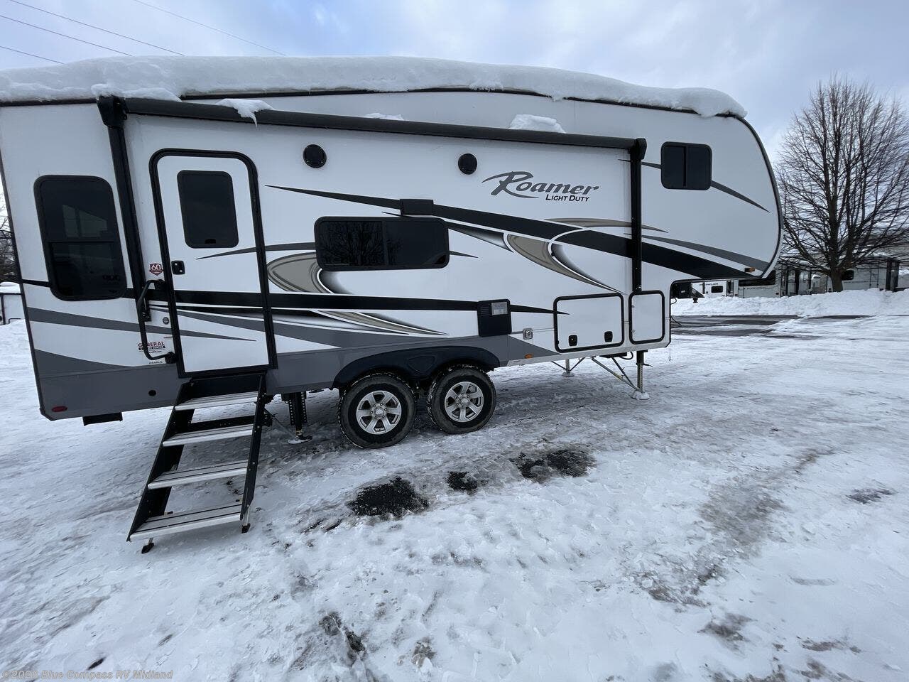 You will have the perfect couple coach in this Roamer Light Duty fifth wheel! With a bi-fold sofa you could easy sleep one or two more if needed. Cook and dine just like home with a table and two chairs, or opt for the table with two chairs and bench seat so you could easily seat four. You will love the modern interior with hardwood cabinet doors, 75 lb. ball bearing drawer glides, LED lighting, stainless steel appliances, and a flush floor slide. The front private bedroom features a comfortable queen bed with storage overhead, plus nightstands and shirt wardrobes on either side, an extra closet along the interior wall features hanging storage plus two drawers as well. The bathroom offers a shower with skylight for more natural lighting, plus a vanity with sink and two mirrored medicine cabinets so you each have one! Outside, a 16' power awning provides a space to relax with camp chairs protected from the elements both day and night, and there is TV hook-up available as well as hook-up for a griddle, plus LP quick connect too. Outside storage is also available, as well as an outside shower to quickly rinse off dirty feet before heading inside.