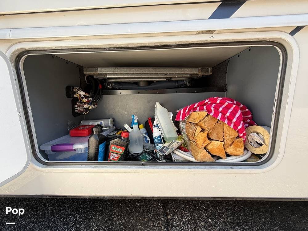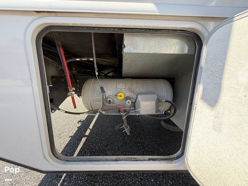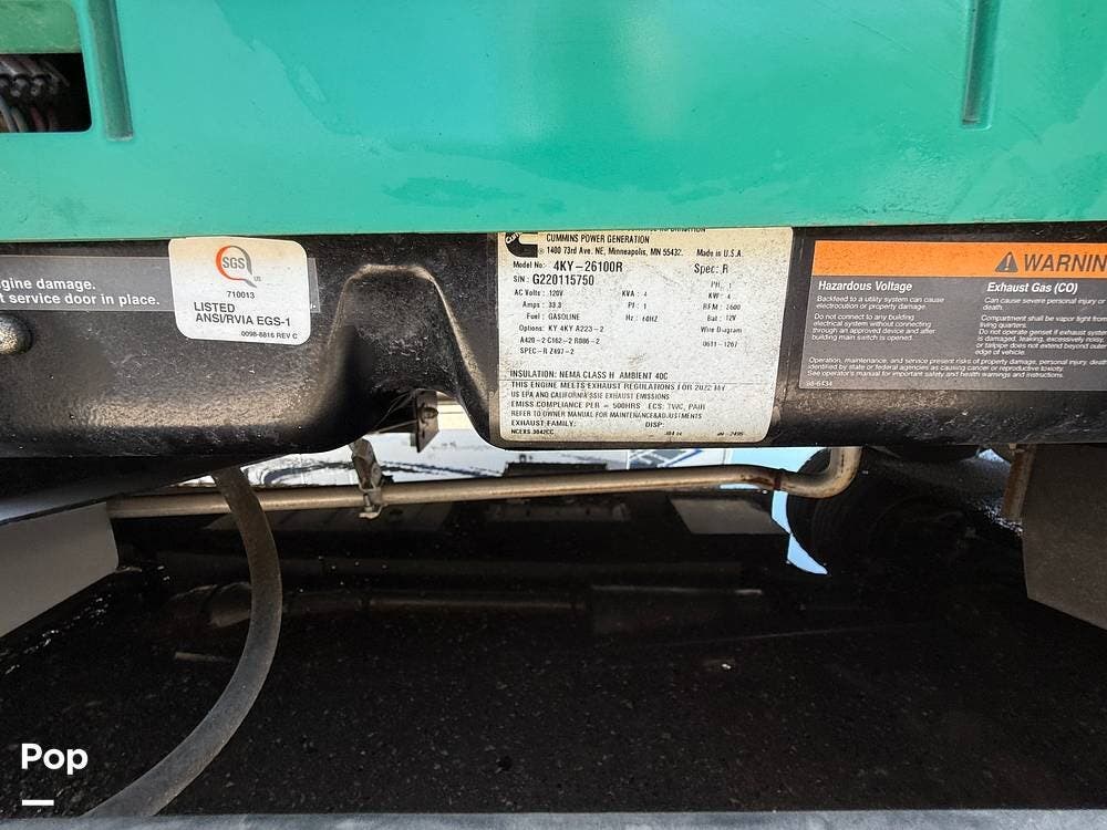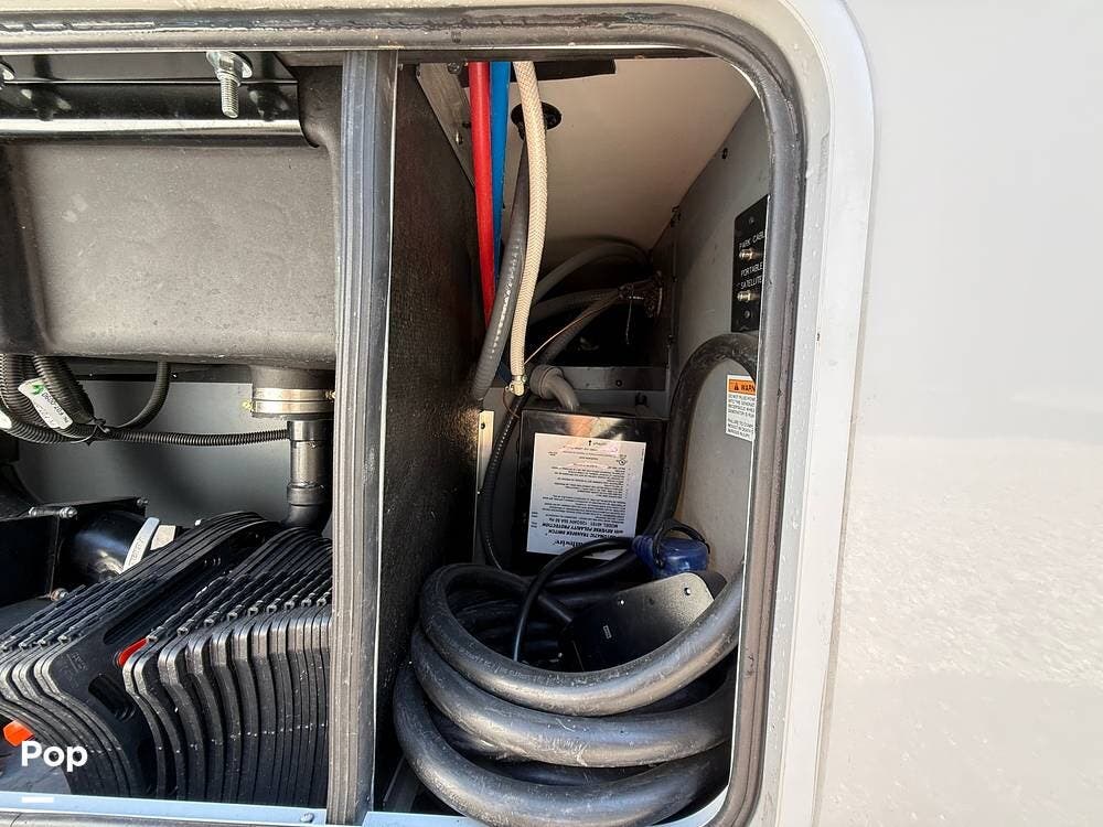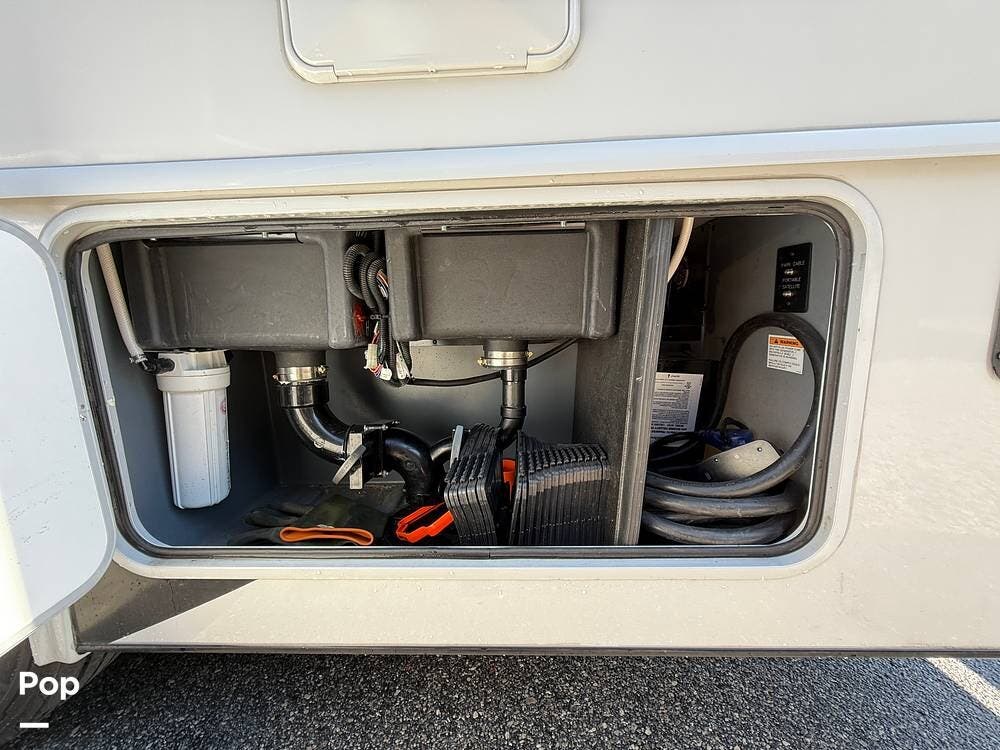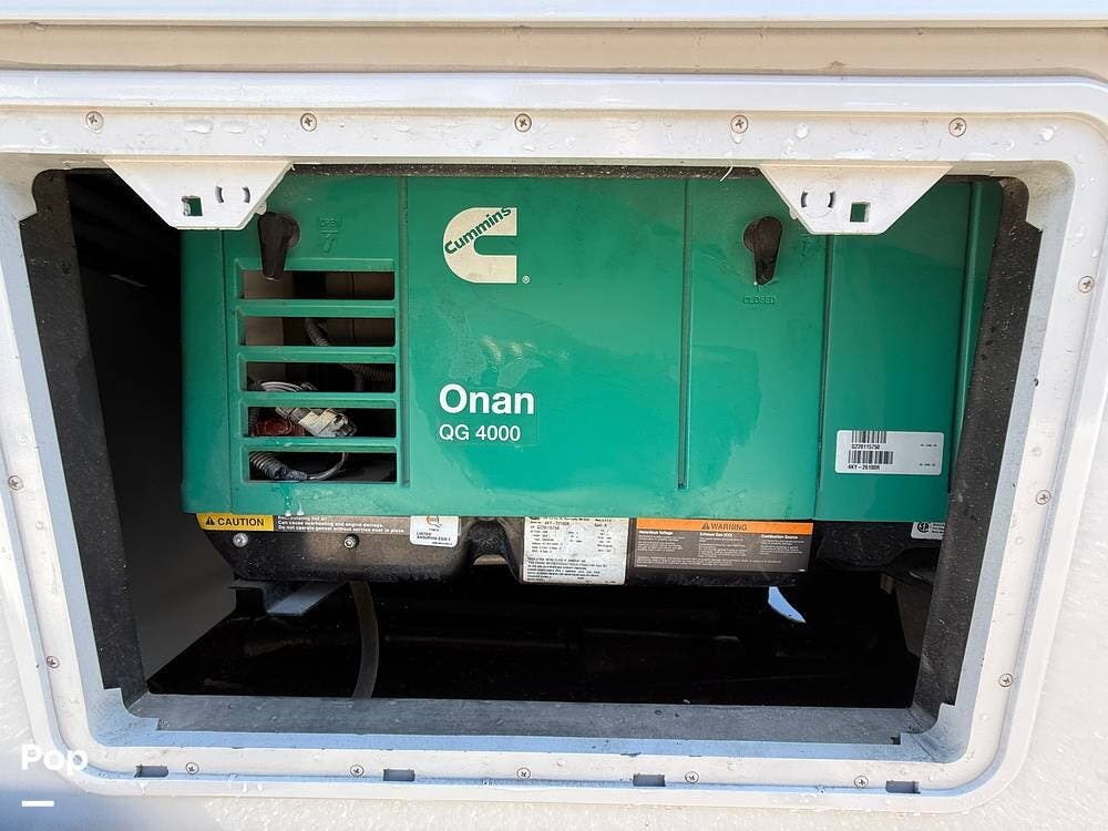 The exterior of the RV has plenty of storage, a full patio awning, and self-leveling jacks. It has a Cummins Onan generator and a 59-lb. propane tank.