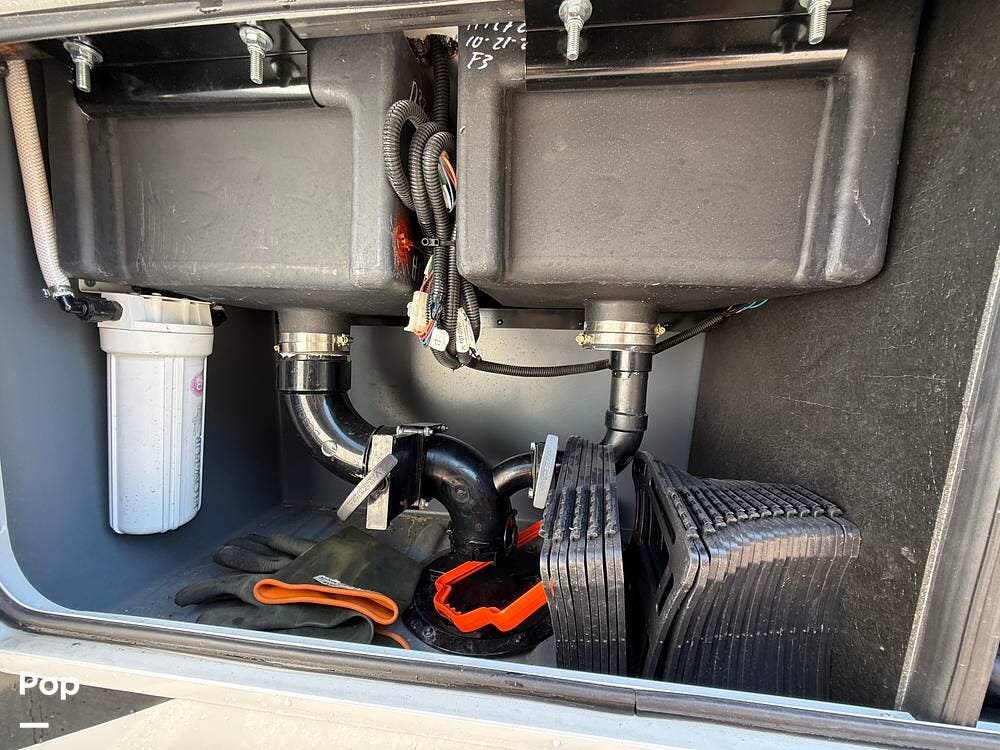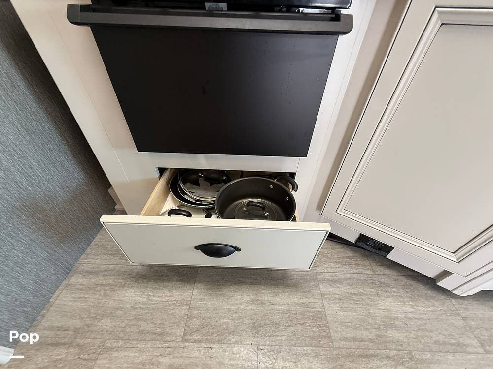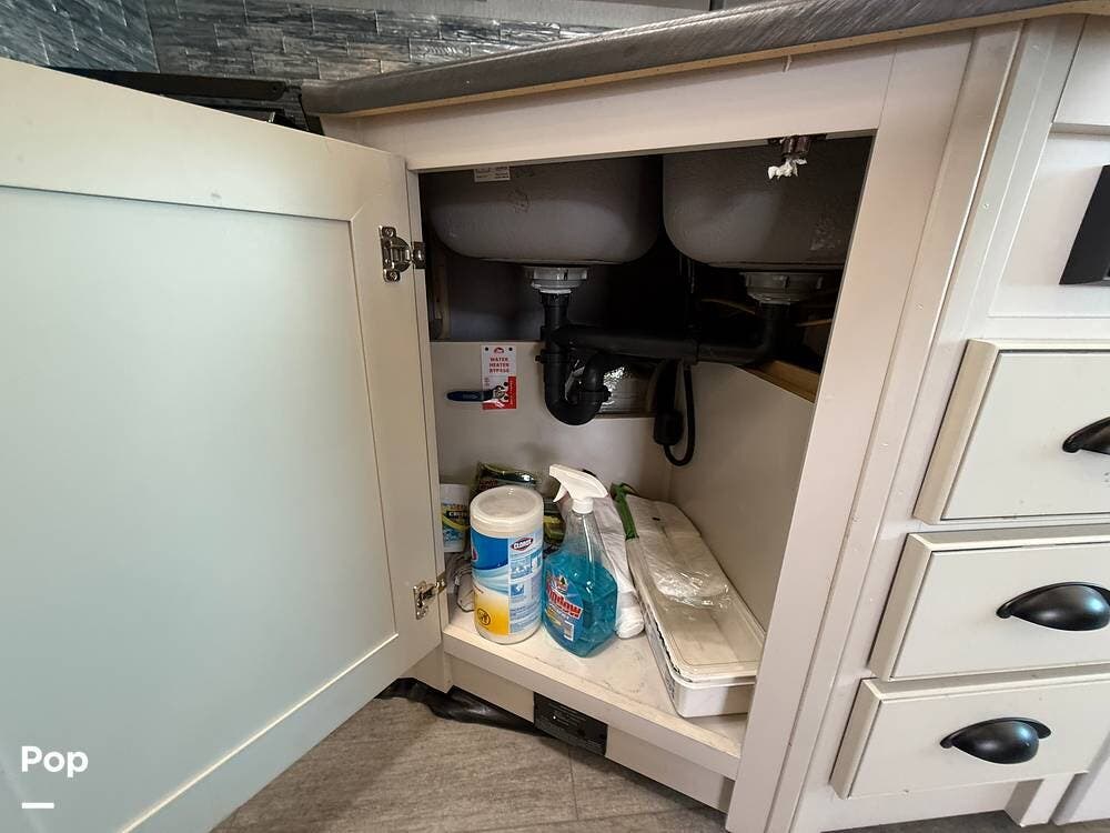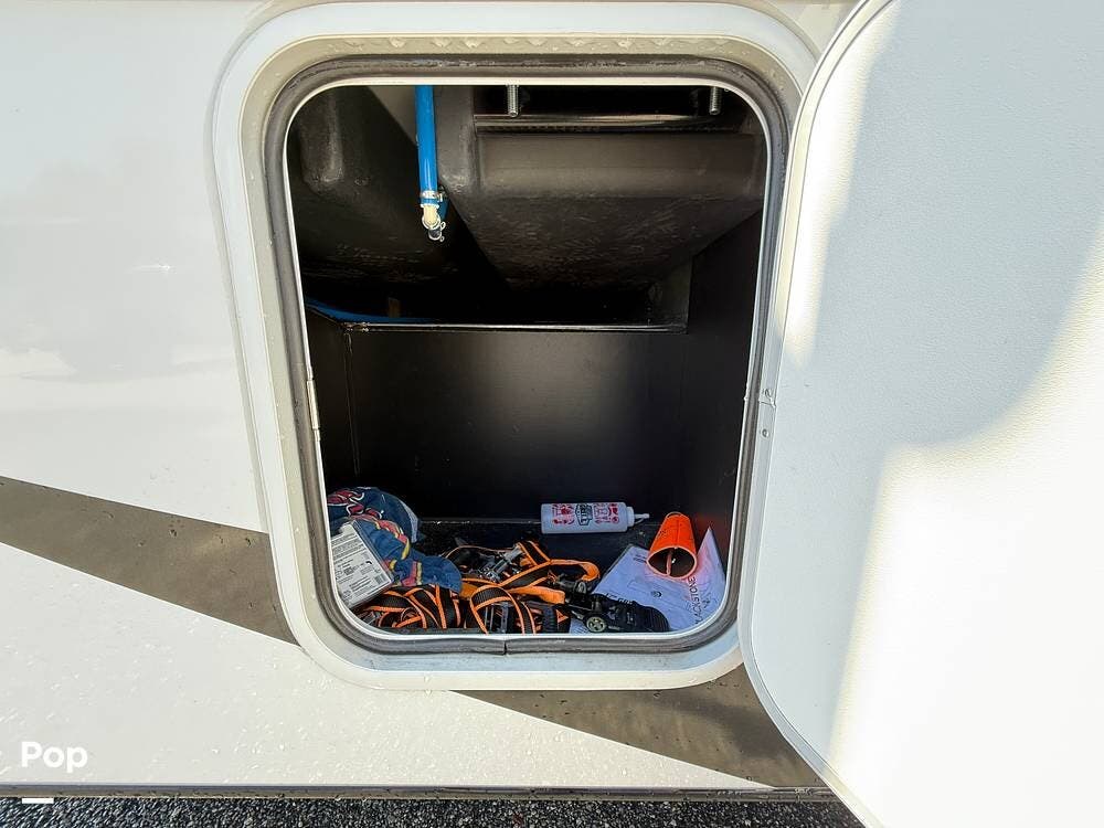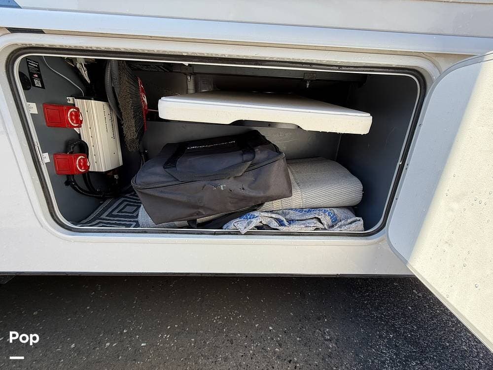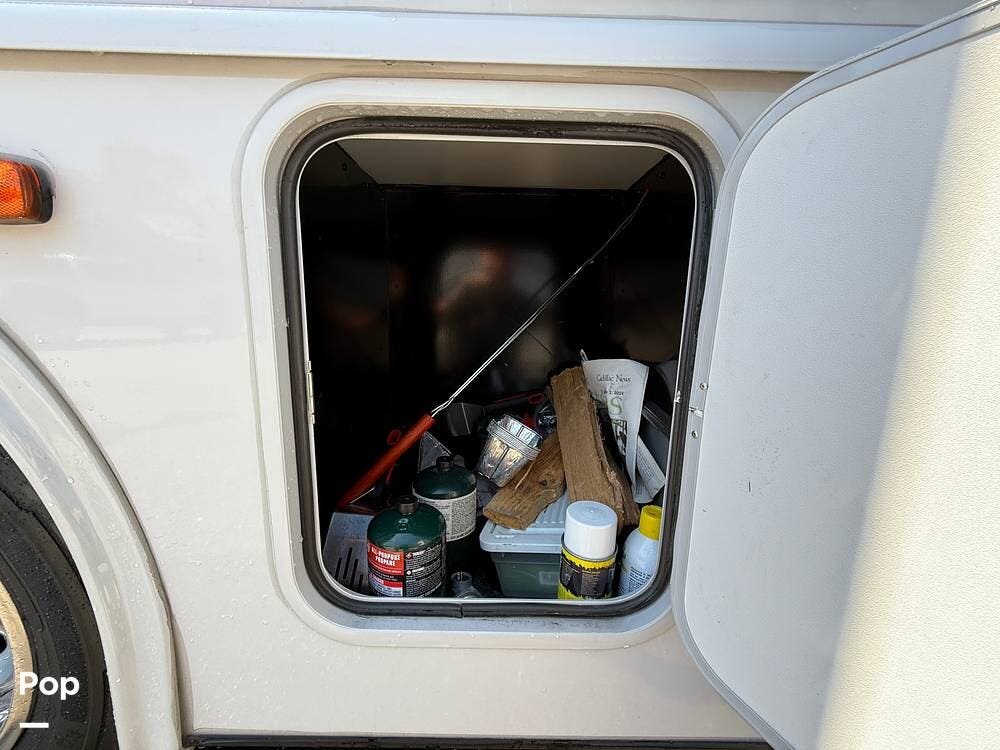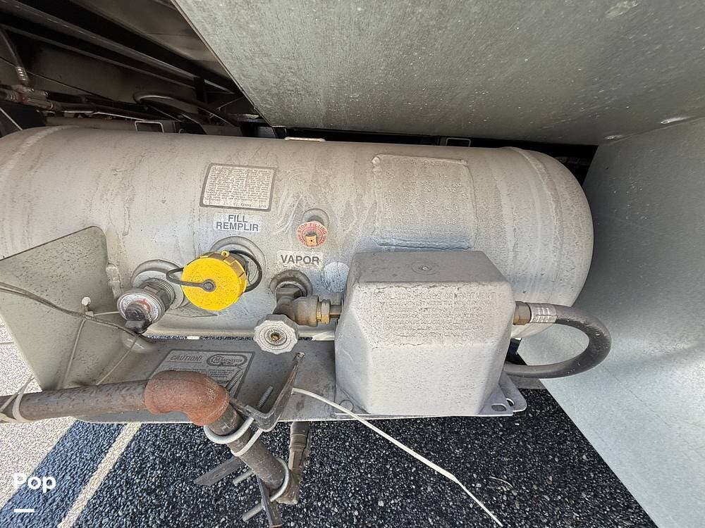The exterior of the RV has plenty of storage, a full patio awning, and self-leveling jacks. It has a Cummins Onan generator and a 59-lb. propane tank.