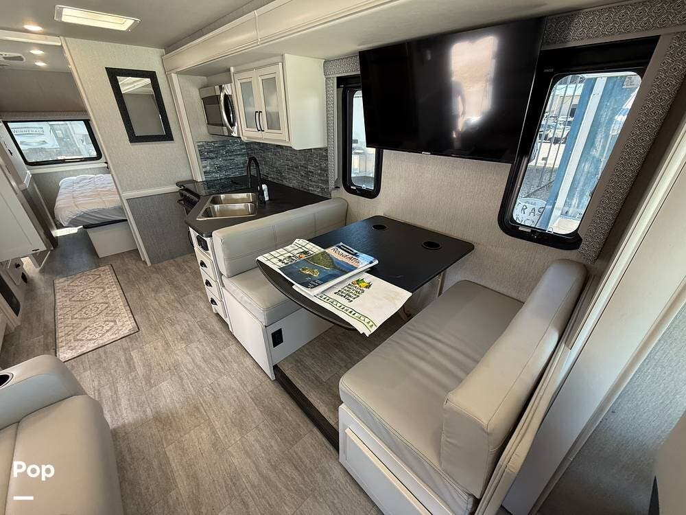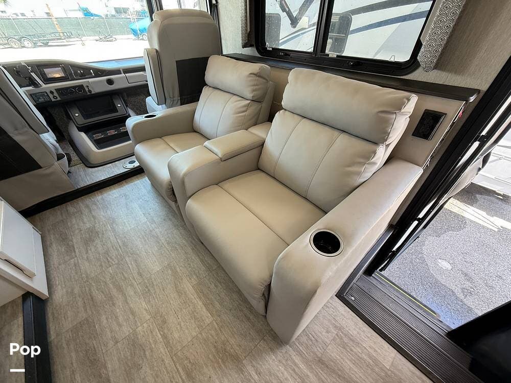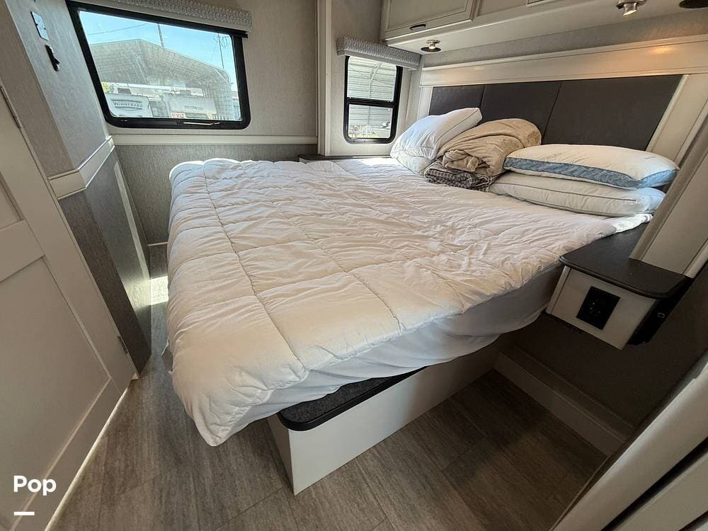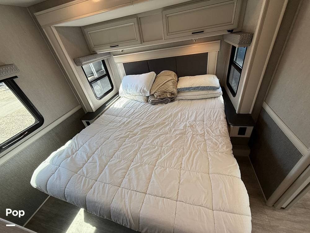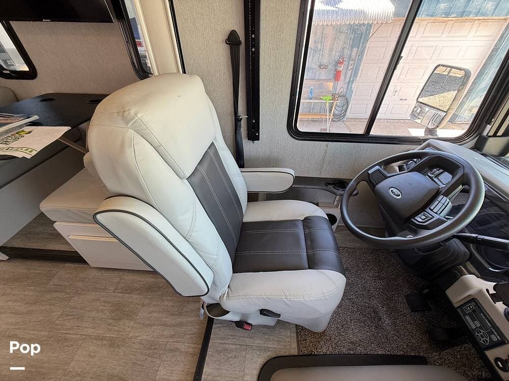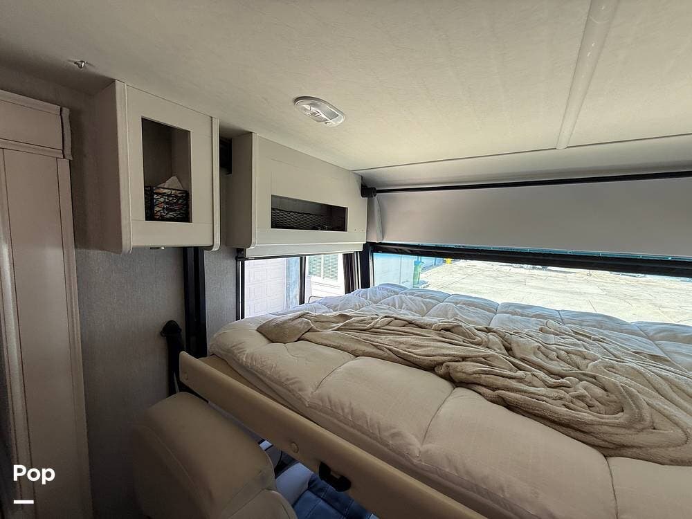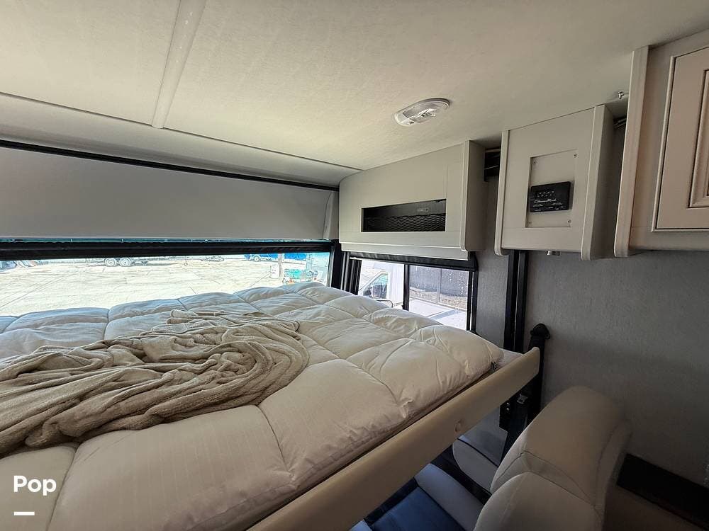 The interior is super spacious and has a light-colored design, making the RV feel larger. It is equipped with an electric drop-down over-cab bed, convertible dream dinette sleeper, king master bed, and stadium recliner.