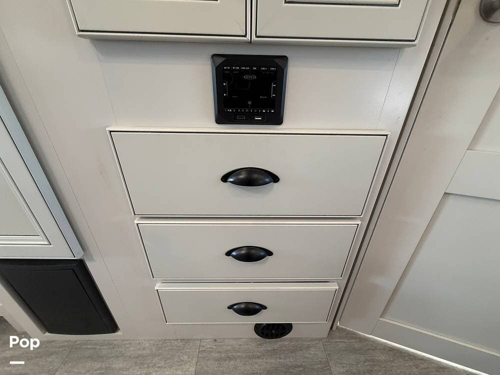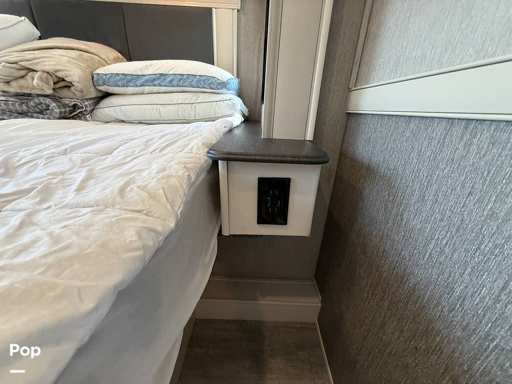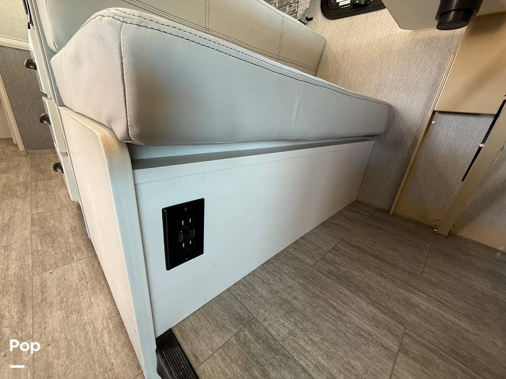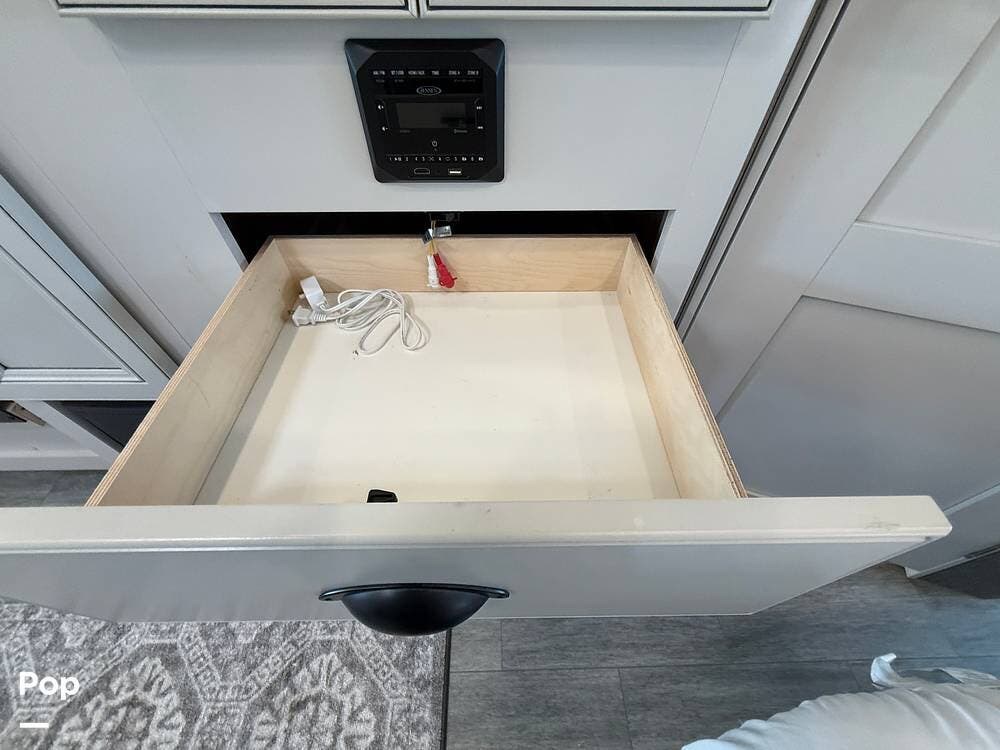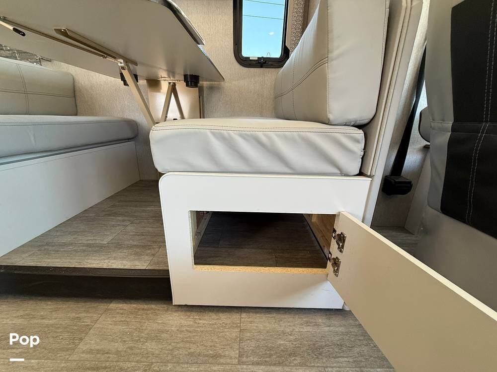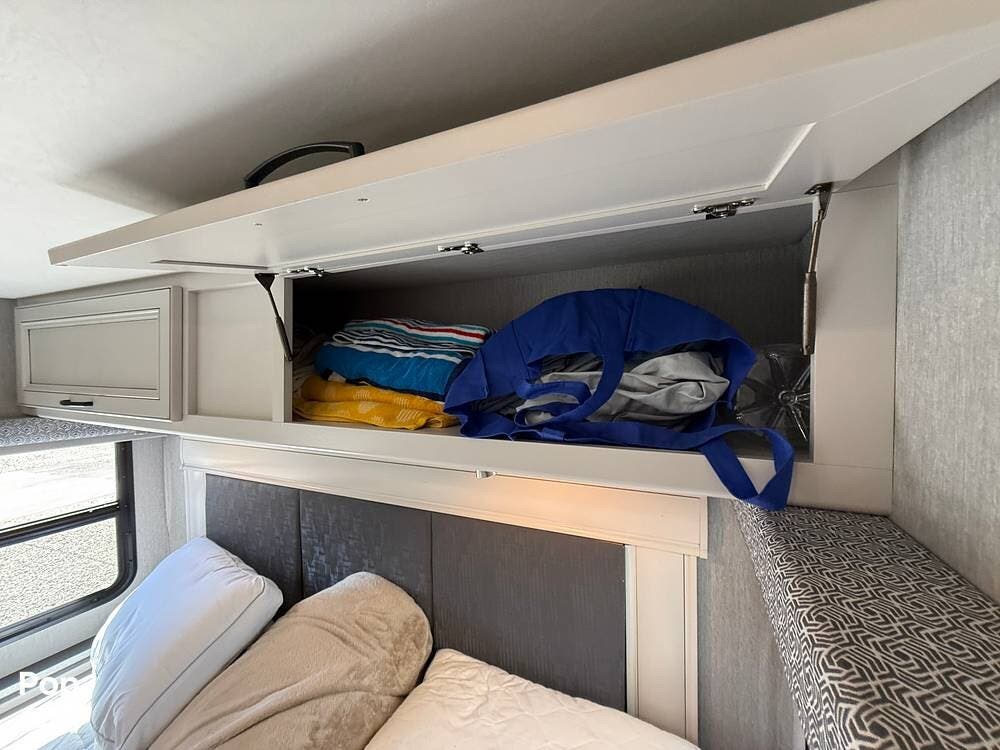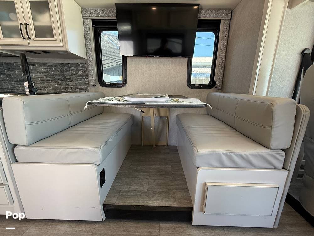 The interior is super spacious and has a light-colored design, making the RV feel larger. It is equipped with an electric drop-down over-cab bed, convertible dream dinette sleeper, king master bed, and stadium recliner.