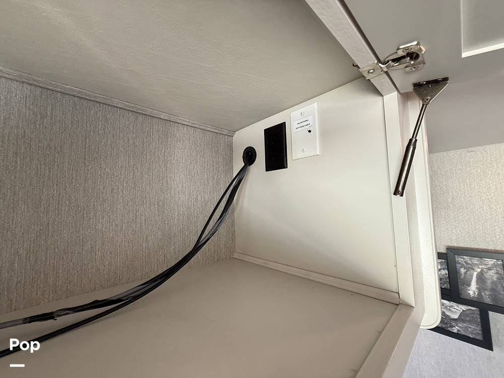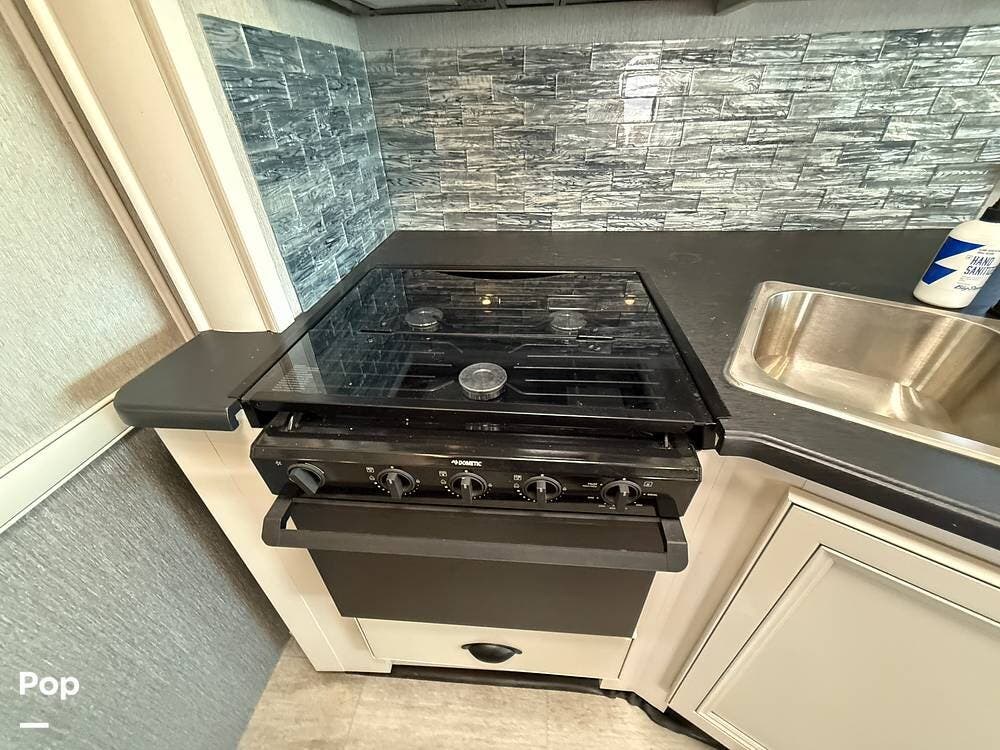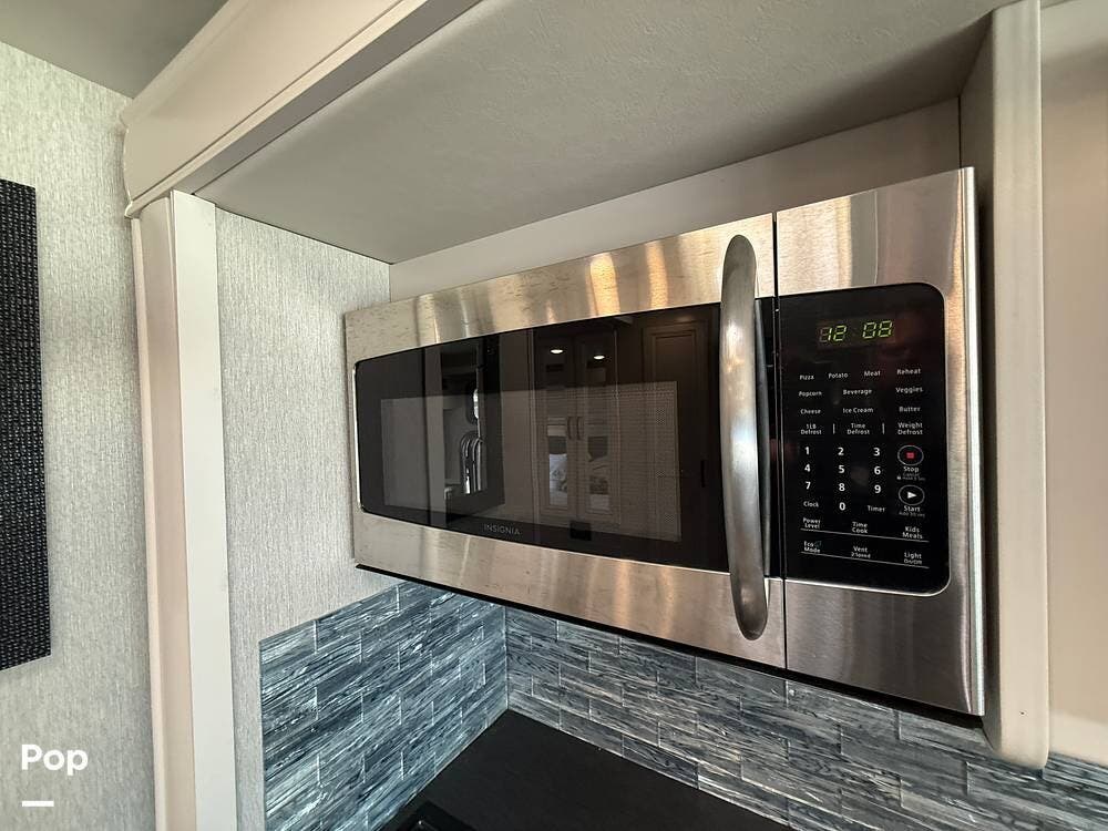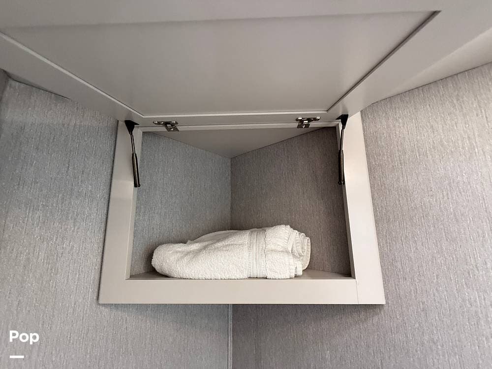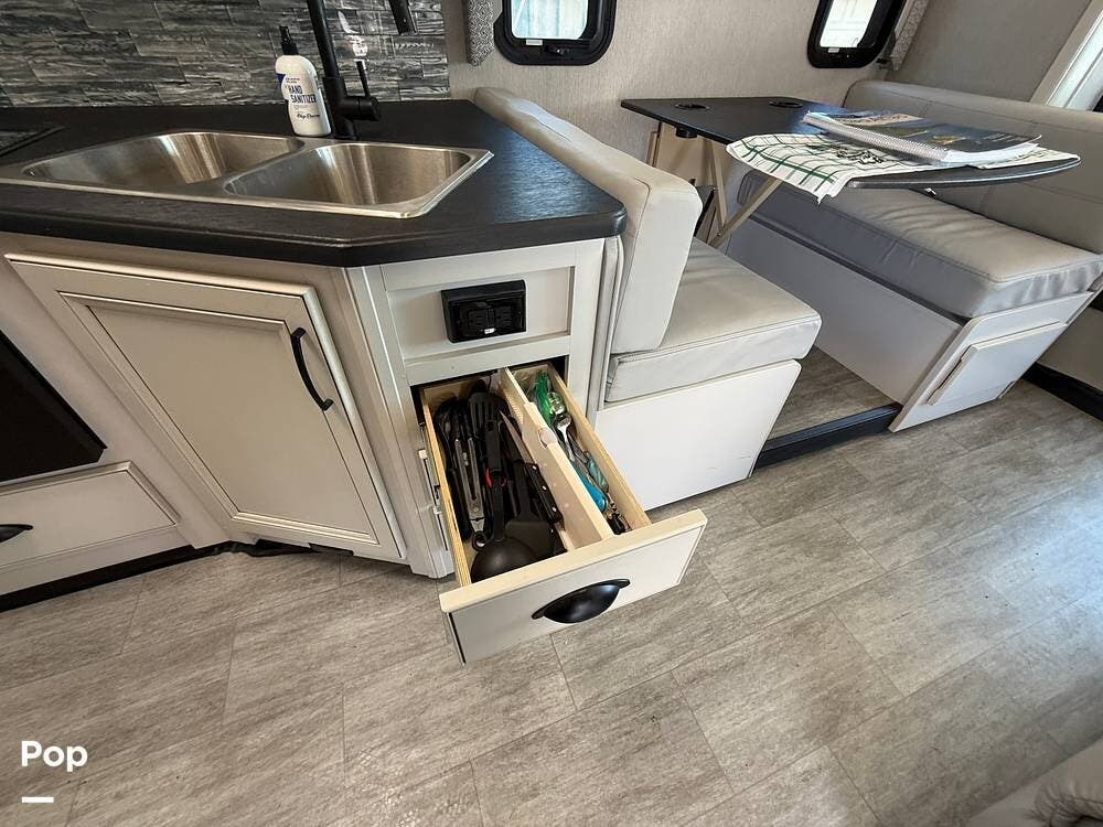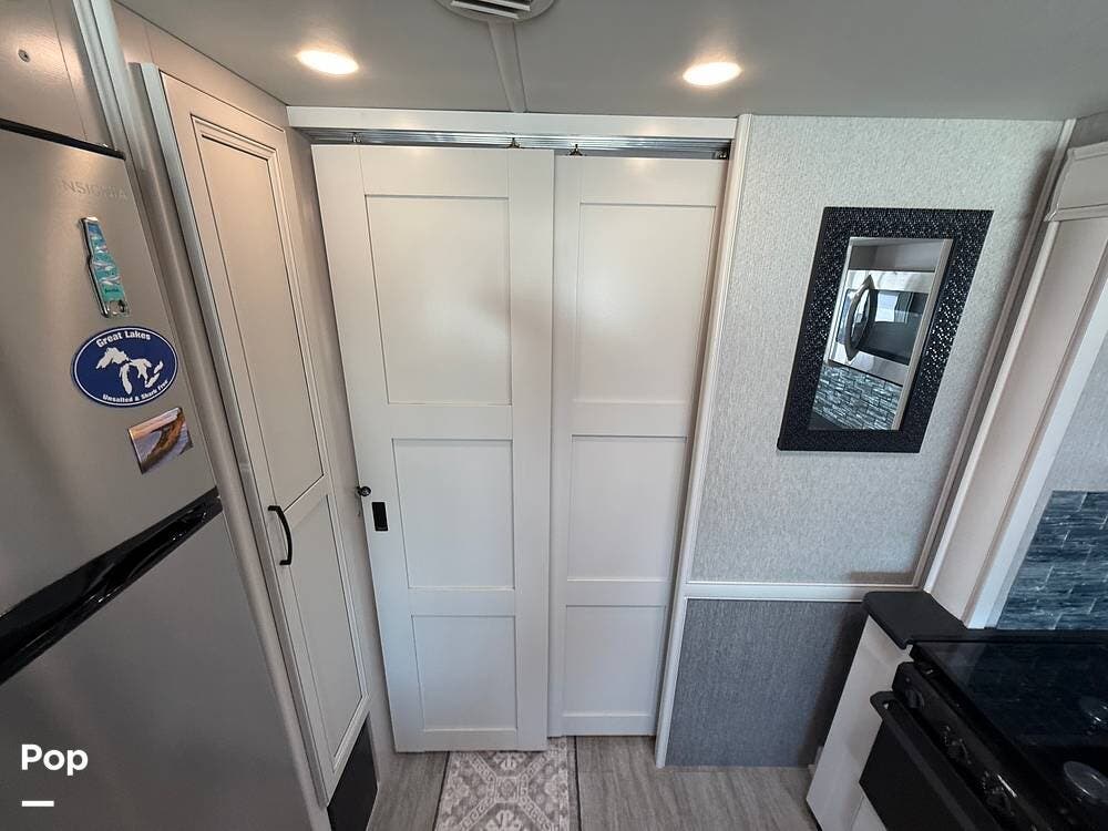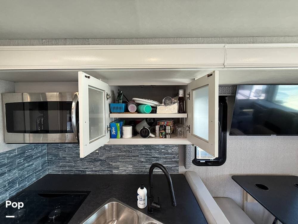 The interior is super spacious and has a light-colored design, making the RV feel larger. It is equipped with an electric drop-down over-cab bed, convertible dream dinette sleeper, king master bed, and stadium recliner.