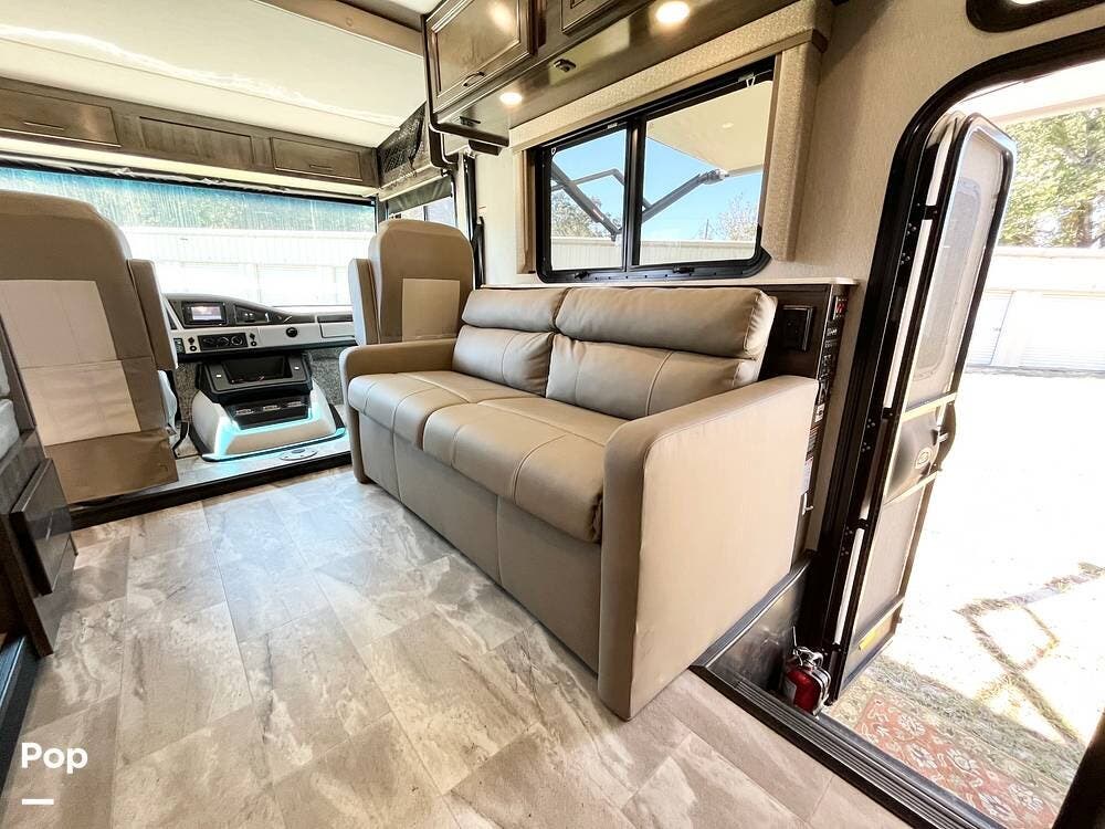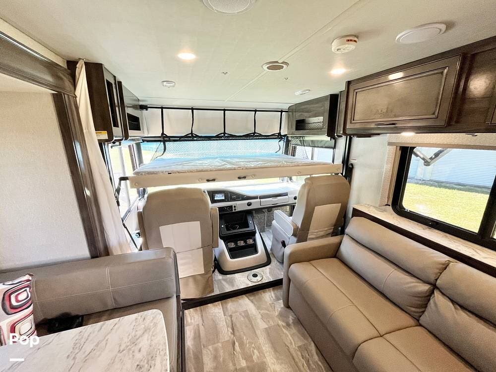 The centrally located entry door makes easy entry. No more climbing around the driver's area to get in and out of your motorhome. Driver and passenger seats swivel for additional seating when needed. And, this one is set up with a dinette sleeper and a sleeper sofa.