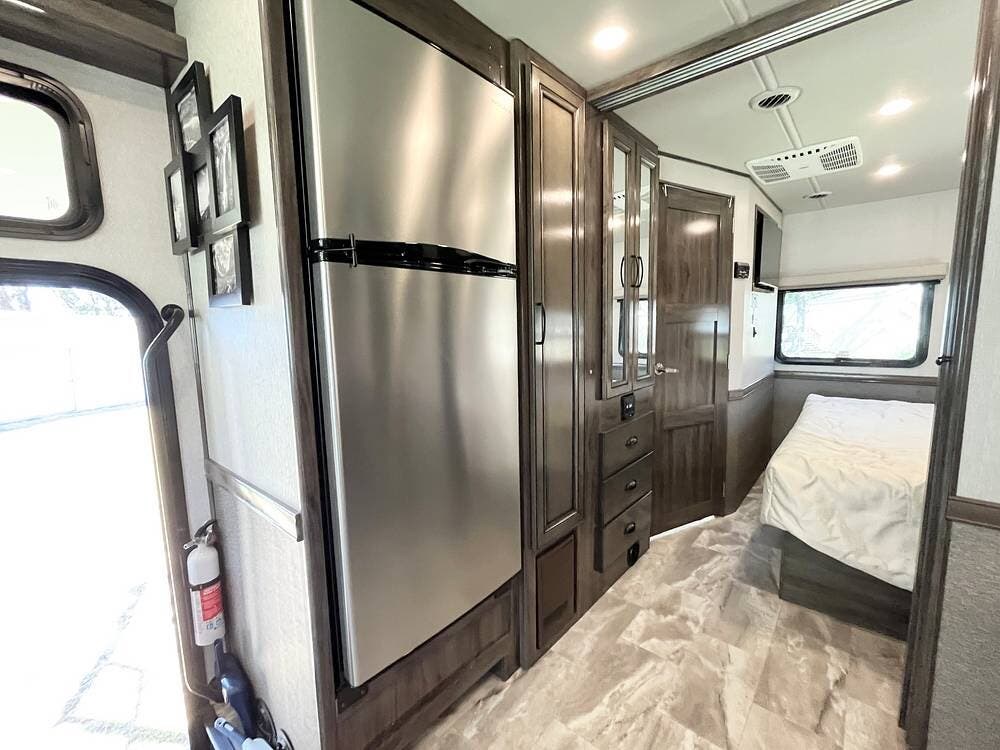 This Admiral is just under 30' overall, making it an efficient traveler and manageable getting in and around, parks, parking lots, and storage. The smart design provides space for a private bedroom with a king bed, for a total sleeping capacity of 8.