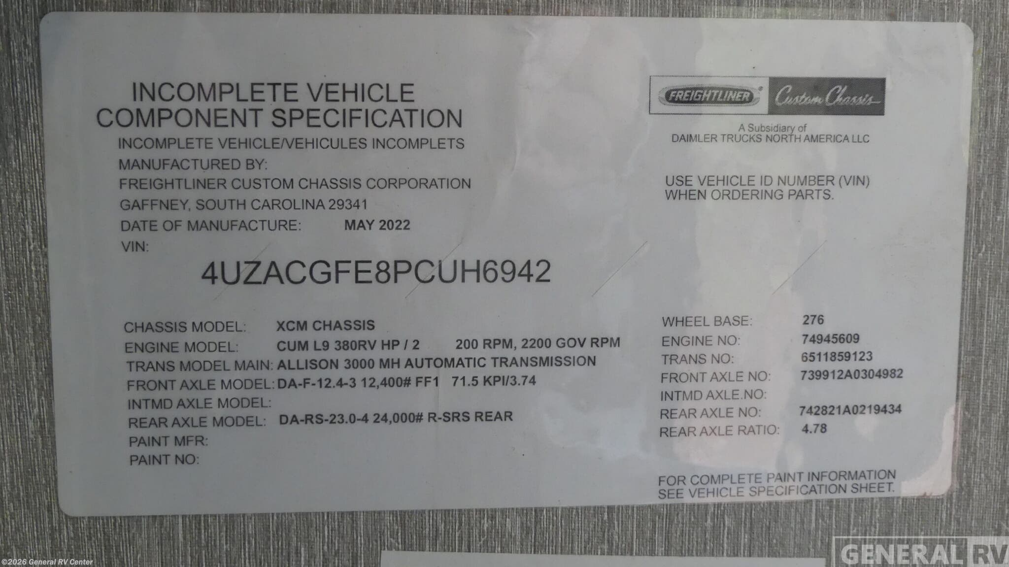 - VIN4UZACGFE8PCUH6942