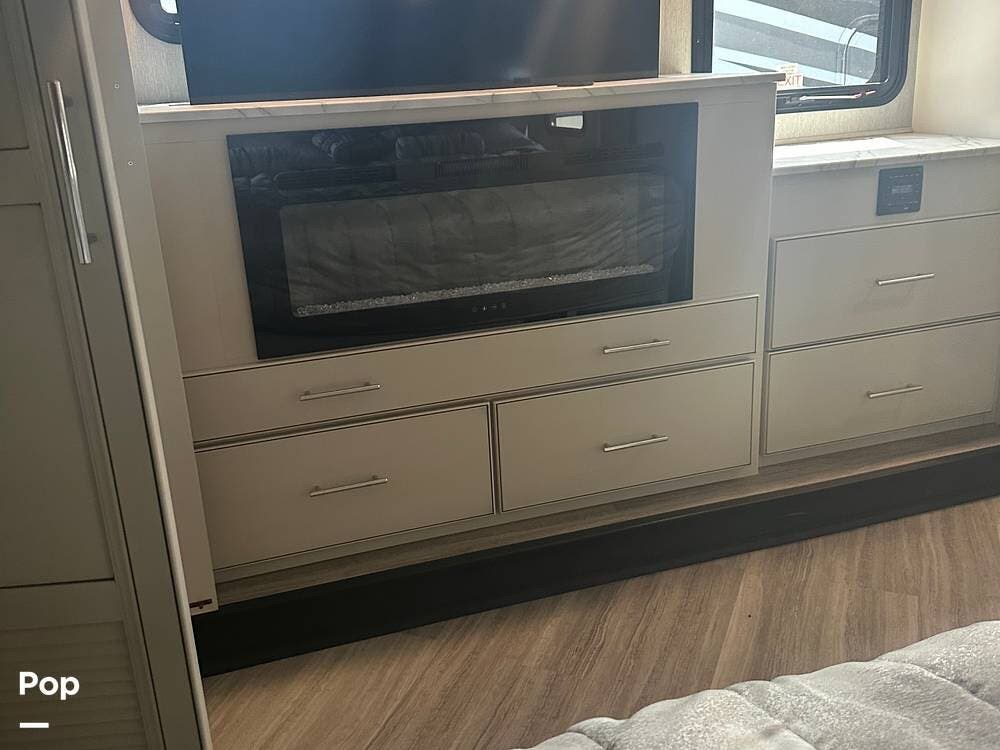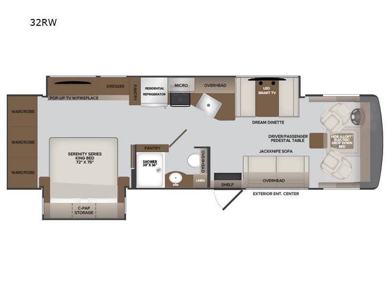 The rear private bedroom features a Serenity Series 72" x 75" king bed slide with CPAP storage above, a large rear wardrobe for hanging clothes, and a pop-up TV with a fireplace below.