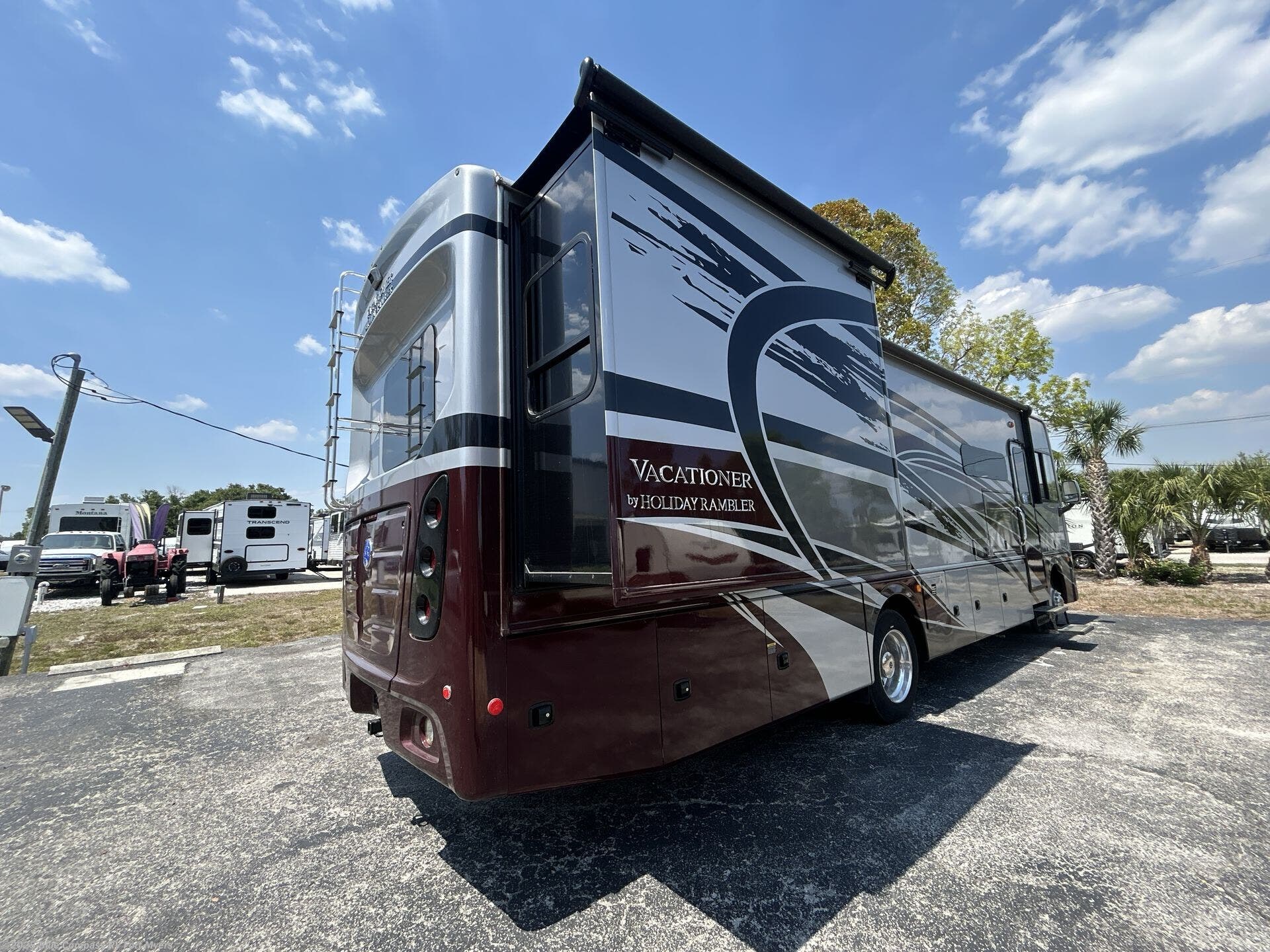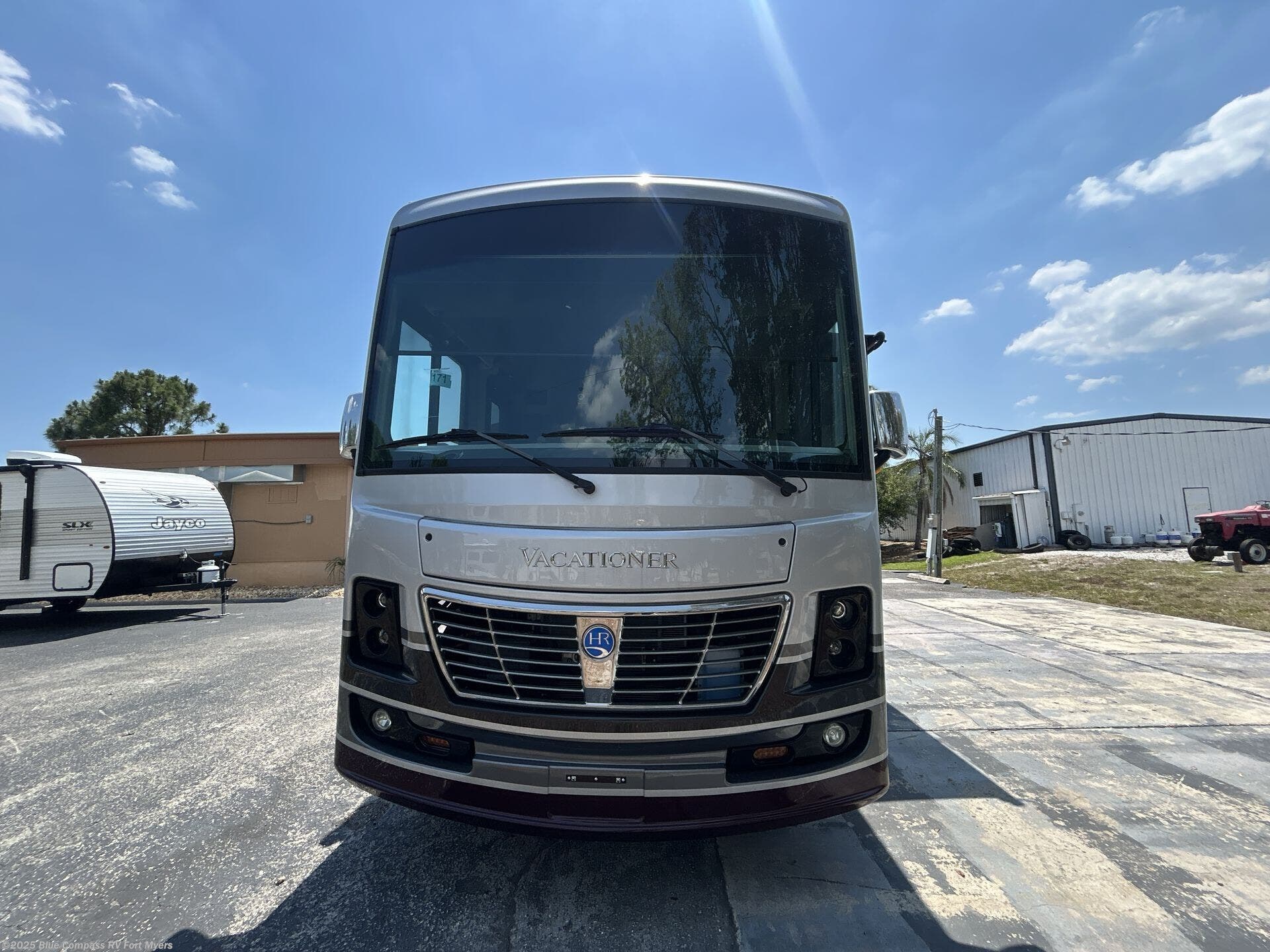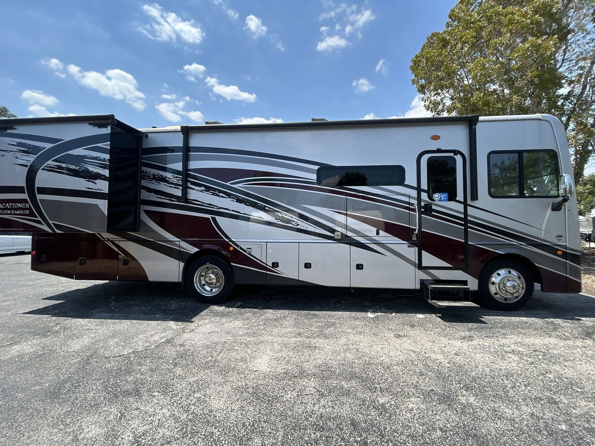 Escape the boring for fun trips in a Vacationer Class A gas motorhome by Holiday Rambler. You can easily make this coach your home-away-from home with features such as dual A/C units, vinyl tile flooring, and stainless steel appliances. The bus-style luggage doors will make for easy unloading, and the four-point fully automatic hydraulic leveling jacks make setting up camp easier than ever. The Vacationer is constructed with a Powerlock System with interlocking floor, walls, and roof, plus premium gel exterior Vetrosina fiberglass skin with no wood substrate for added durability. Each model includes an automotive style dash with dual monitors, a dash stereo with CarPlay and front speakers, and standard traction control for added safety. The list of standard features doesn't stop there. You'll have an environmentally friendly 100W solar panel, an exterior entertainment center, a powerful 7.3L 350 HP engine, and so much more!
