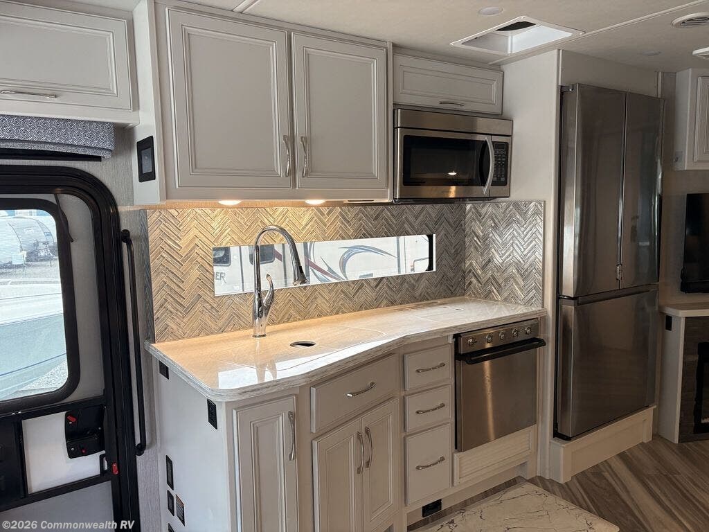 In the rear, a private king-bed suite gives owners a true bedroom retreat, complete with wardrobe storage and TV, so evenings feel more like a condo than a coach. A mid-coach bathroom with shower and vanity makes this floorplan ideal for couples who occasionally travel with guests but still want a quiet, separated space at night.Outside, the powered patio awning and ducted roof A/C create a comfortable outdoor and indoor environment, perfect for tailgating, campfire evenings, or long weekends at the lake!