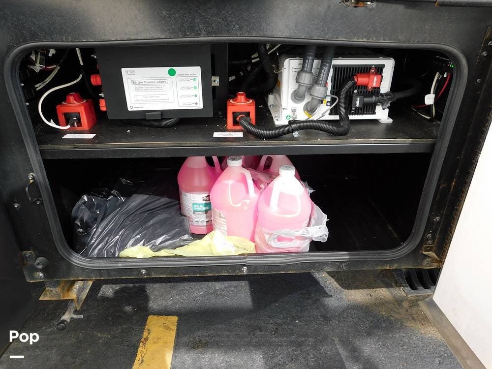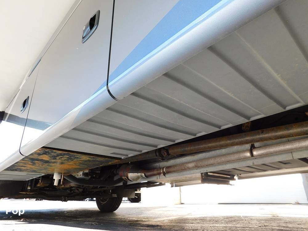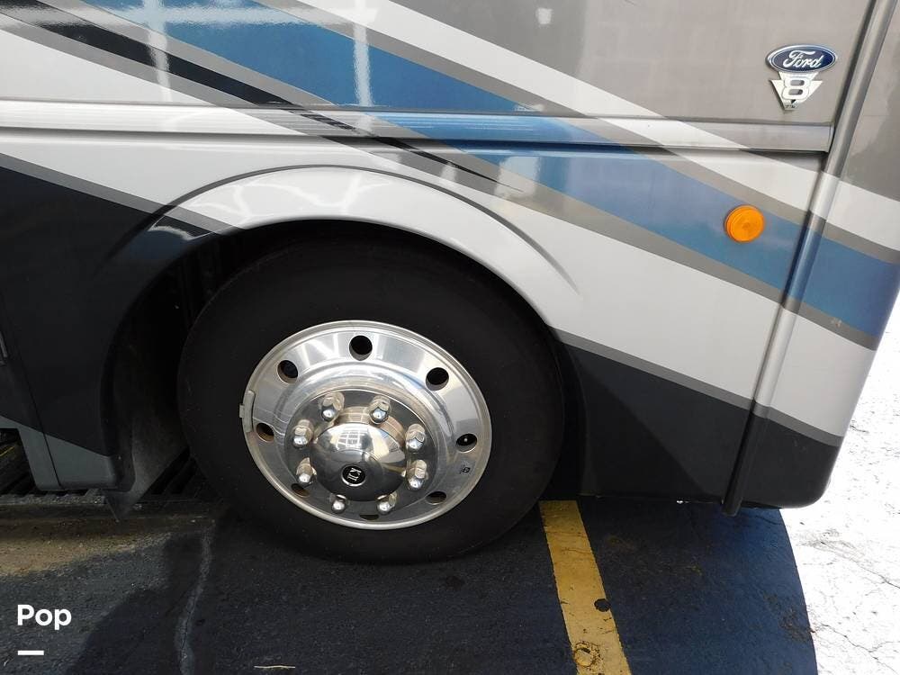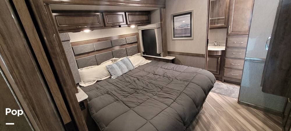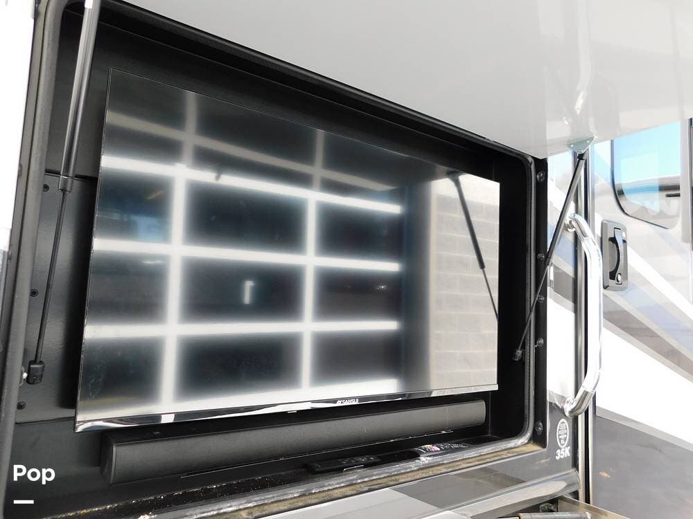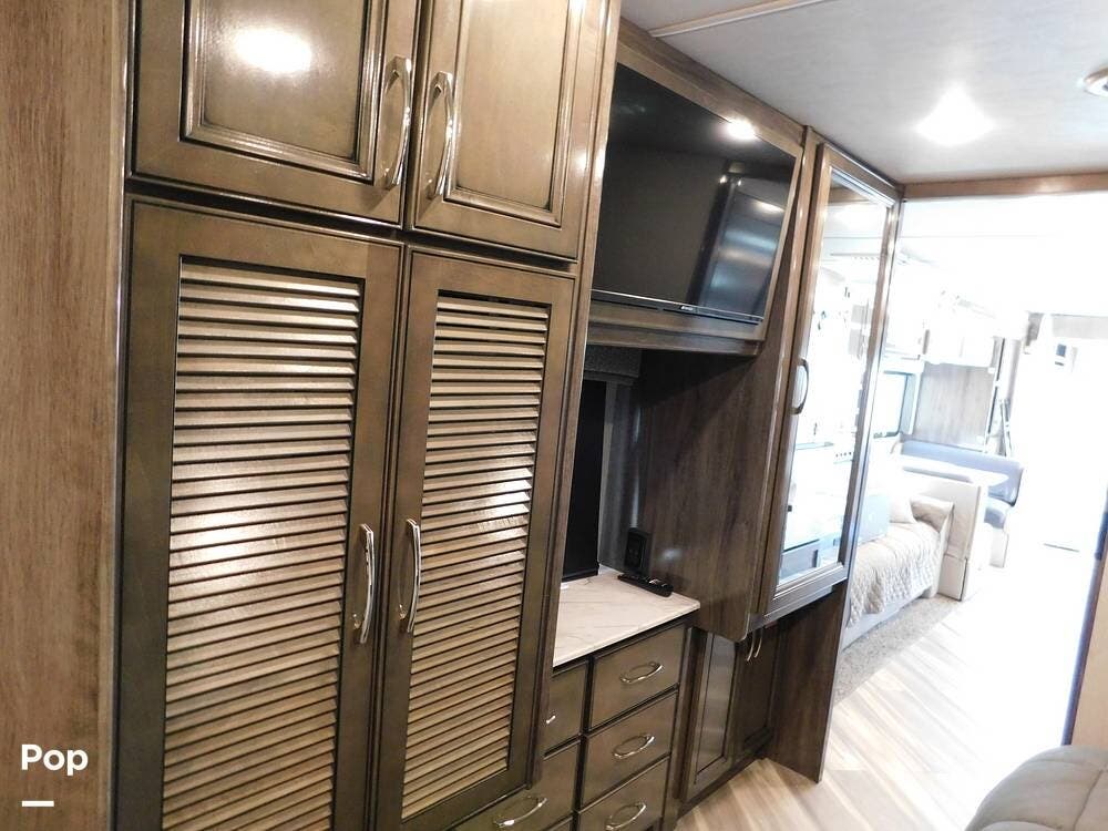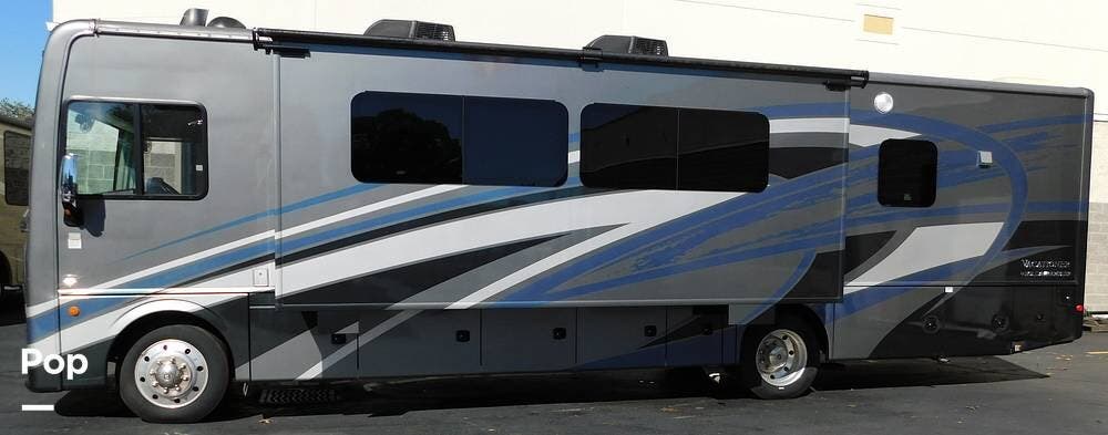 Outside, the Vacationer 35K is equipped with a large power awning, LED patio lighting, exterior TV and speakers for outdoor enjoyment. Generous basement storage compartments accommodate camping gear, sporting equipment, and other travel necessities. The motorhome is powered by a 7.3-liter V8 engine and supported by a reliable suspension system, ensuring smooth and efficient travel across various terrains.