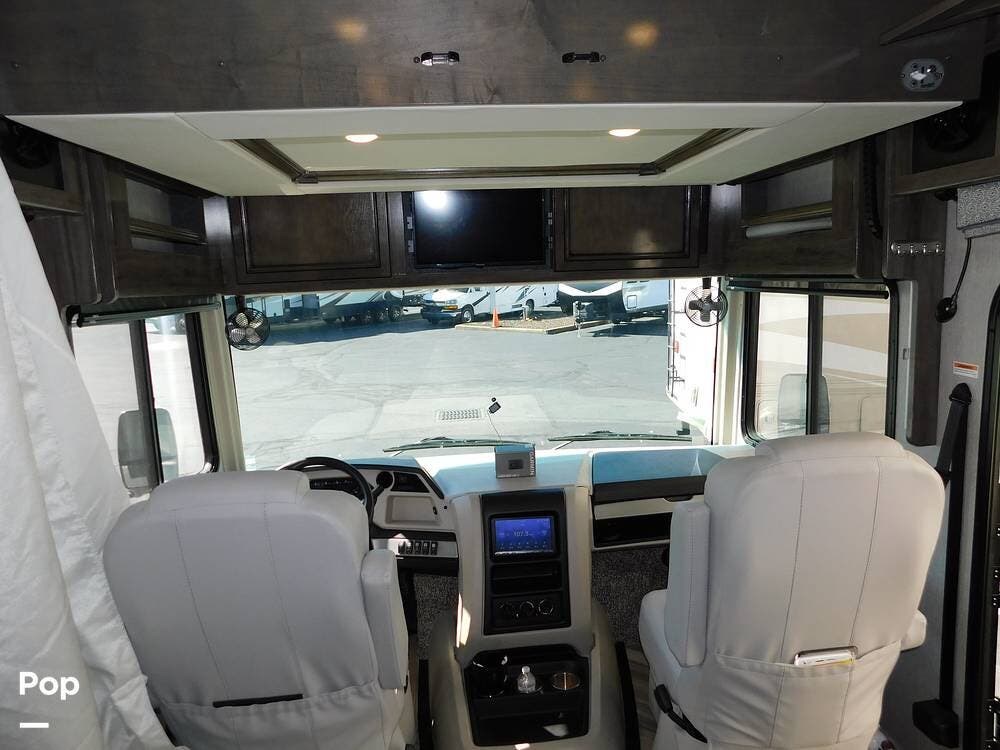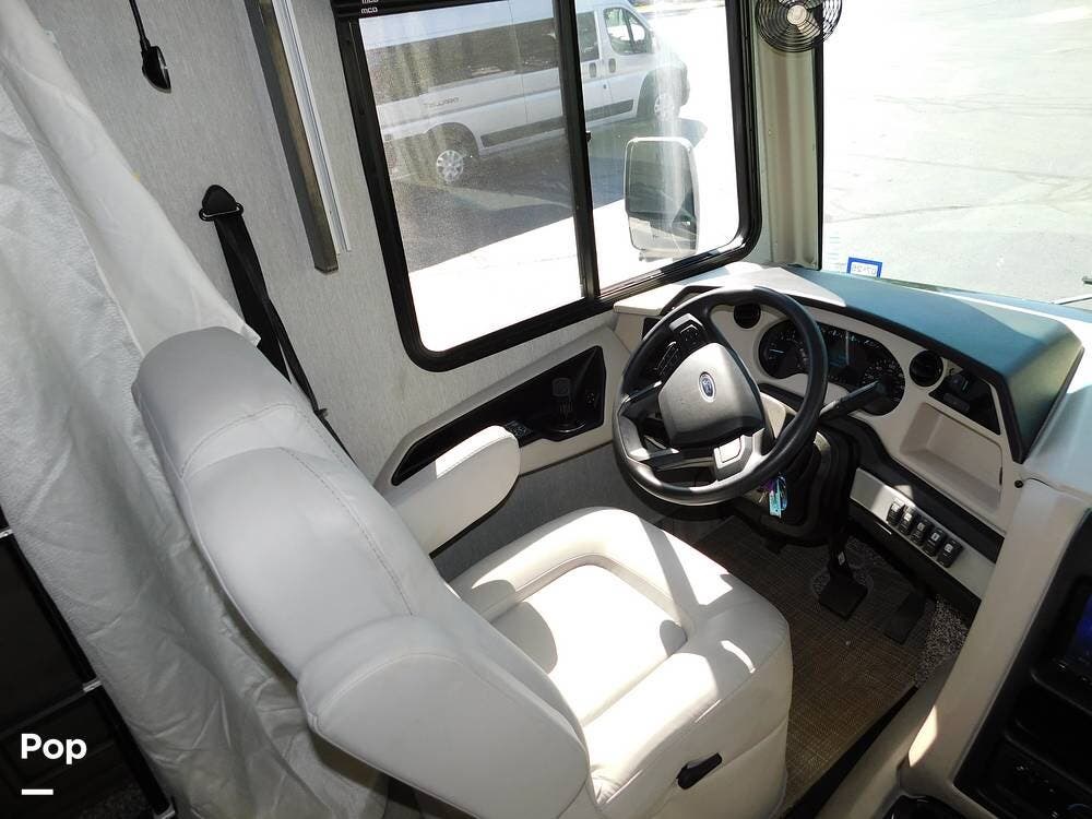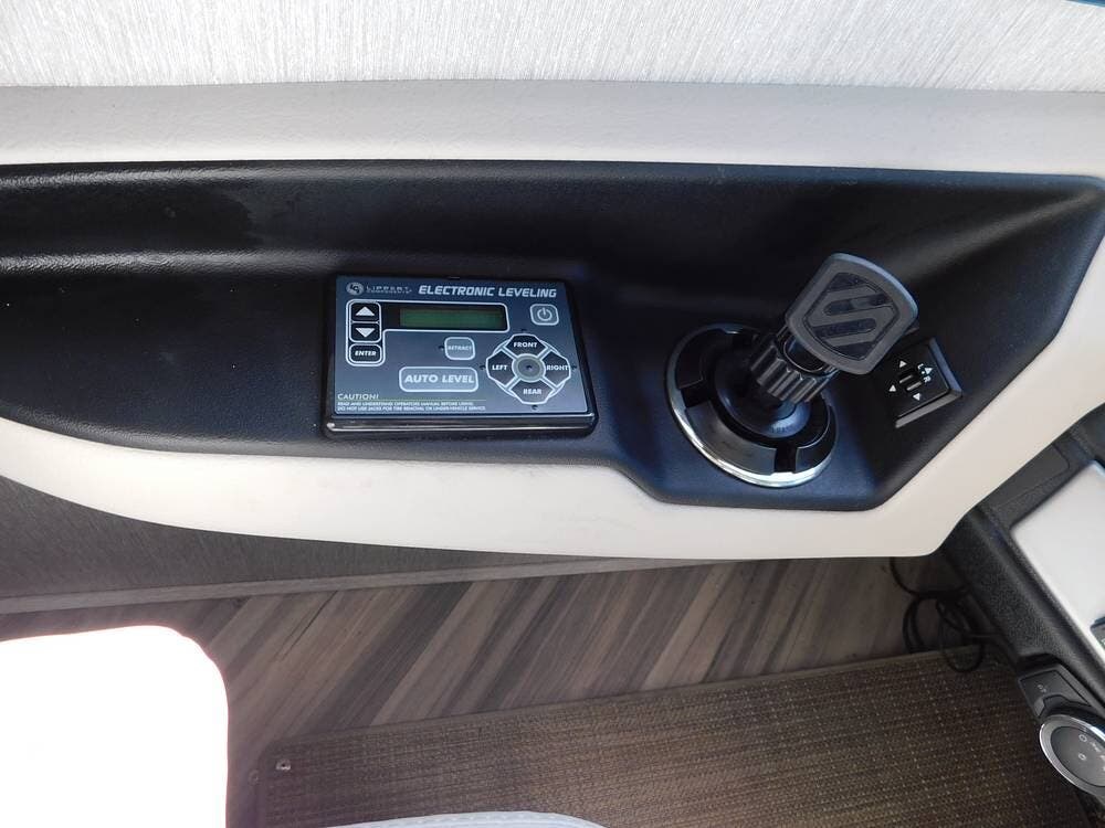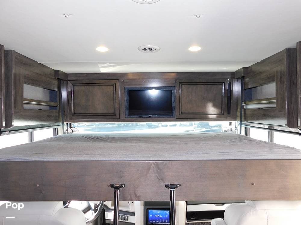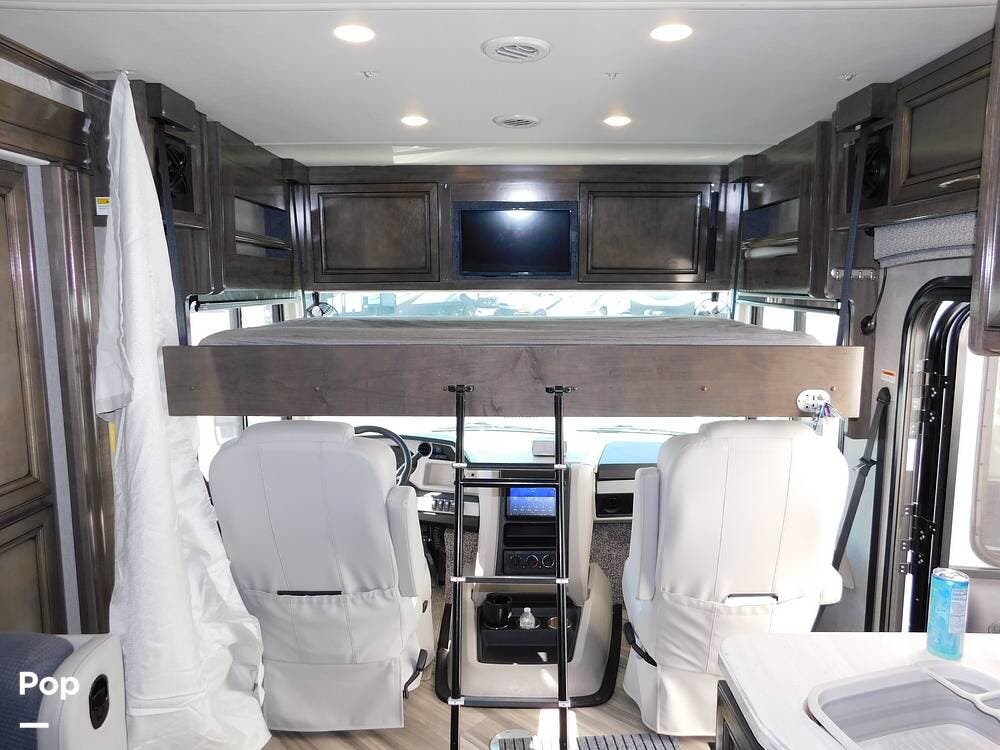 The driver's cockpit features ergonomic seating, an overhead power drop-down bed, a digital dash, and integrated navigation, making handling and trip planning straightforward and comfortable. Safety features such as backup cameras, lane monitoring, and automatic leveling jacks contribute to a stress-free journey.