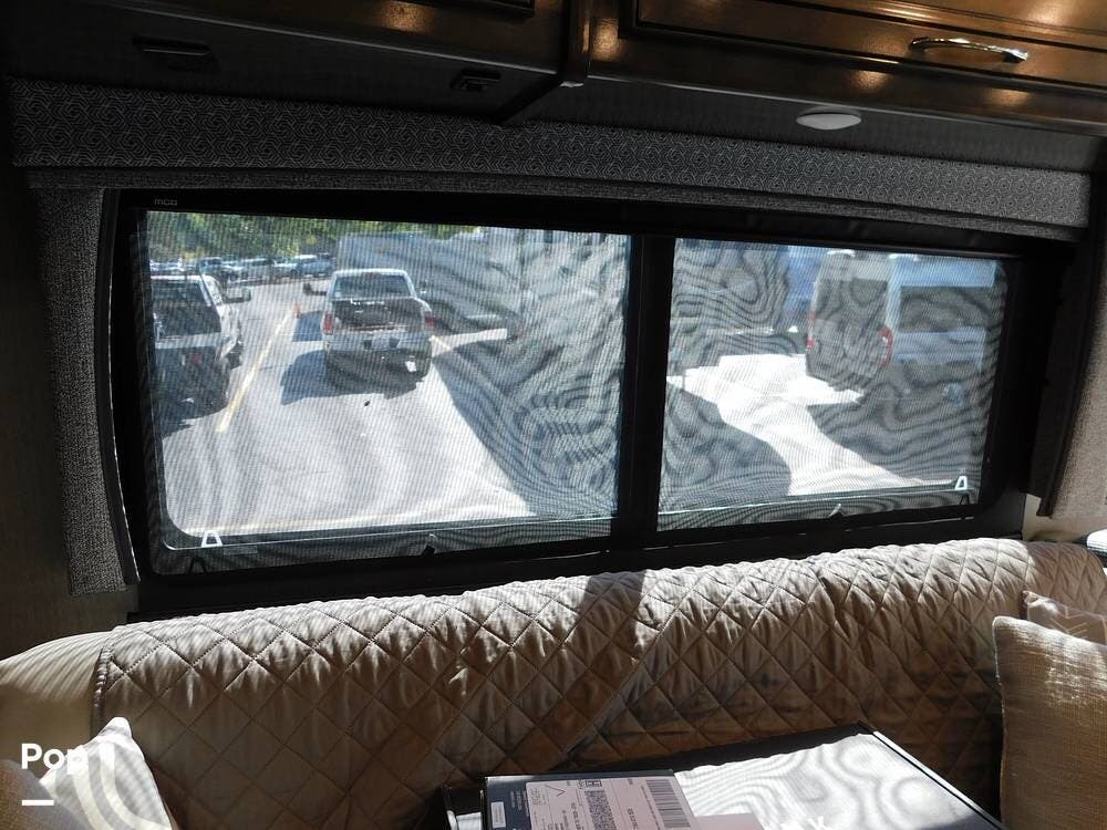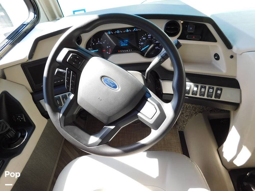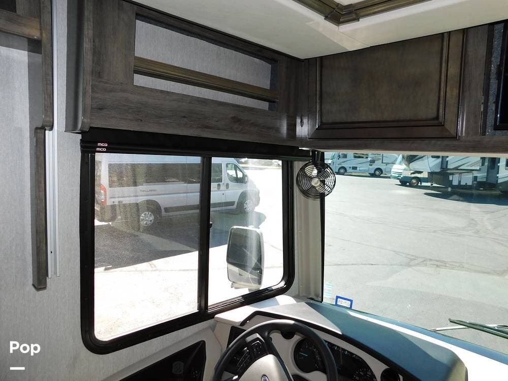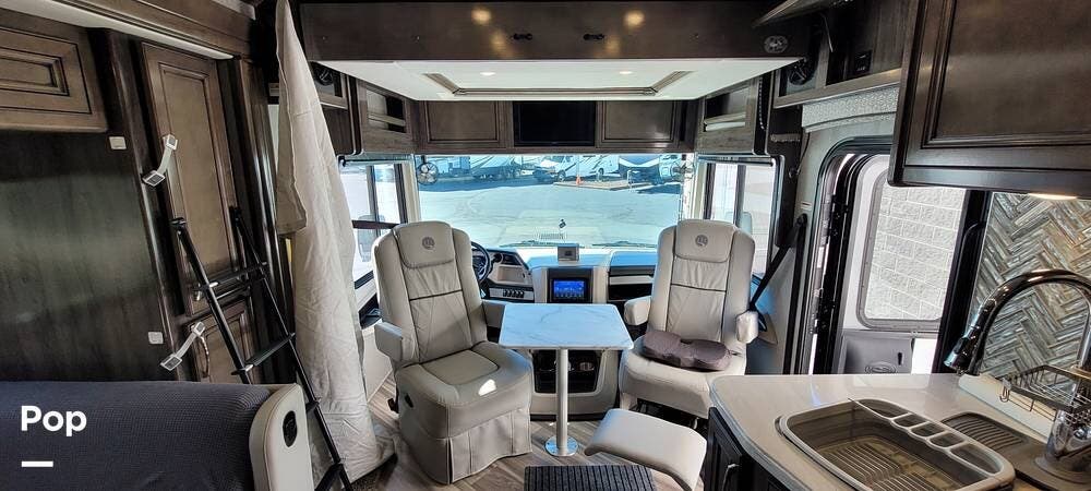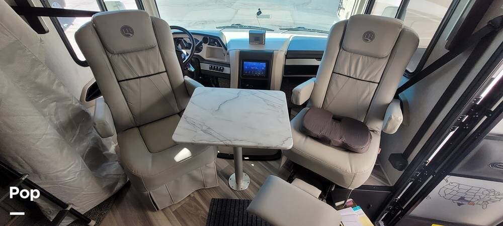 The driver's cockpit features ergonomic seating, an overhead power drop-down bed, a digital dash, and integrated navigation, making handling and trip planning straightforward and comfortable. Safety features such as backup cameras, lane monitoring, and automatic leveling jacks contribute to a stress-free journey.