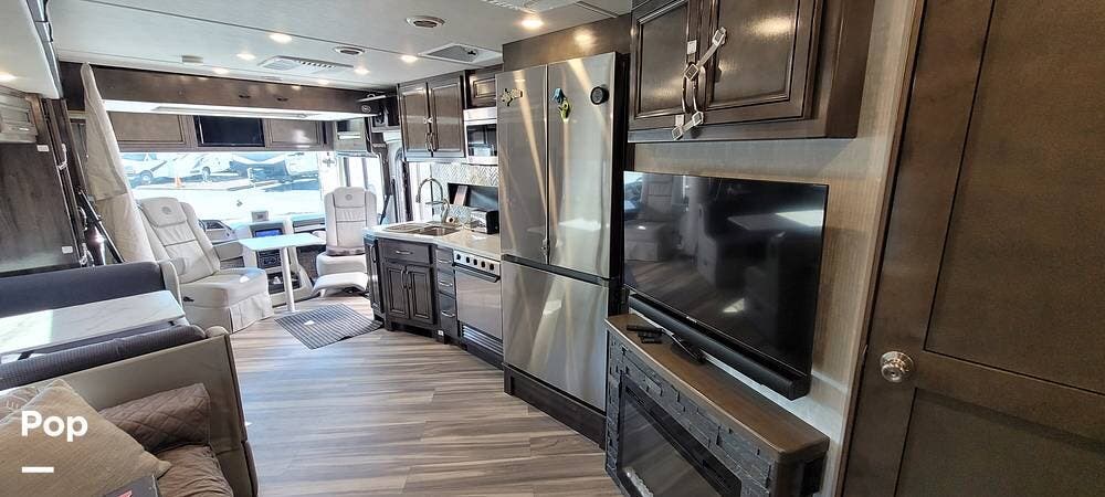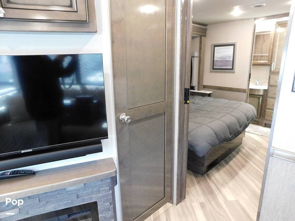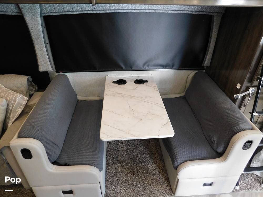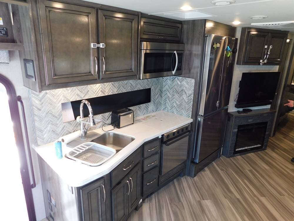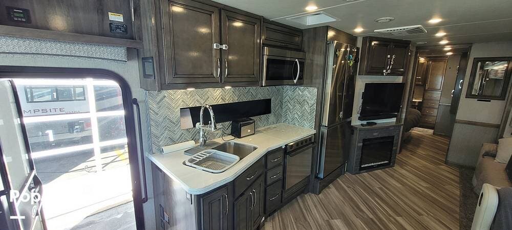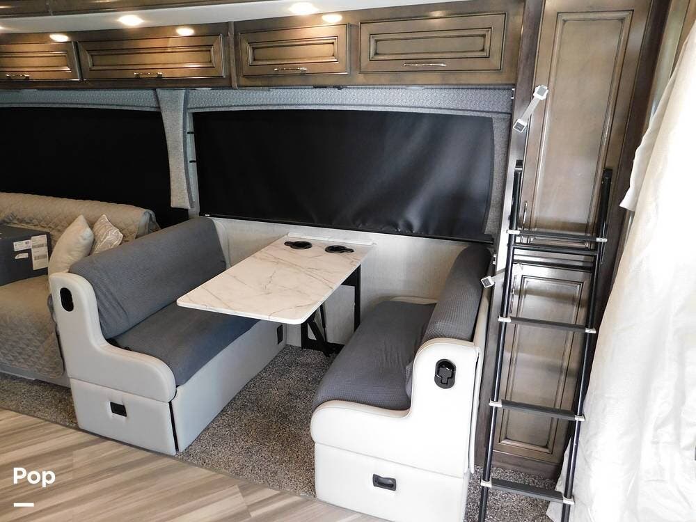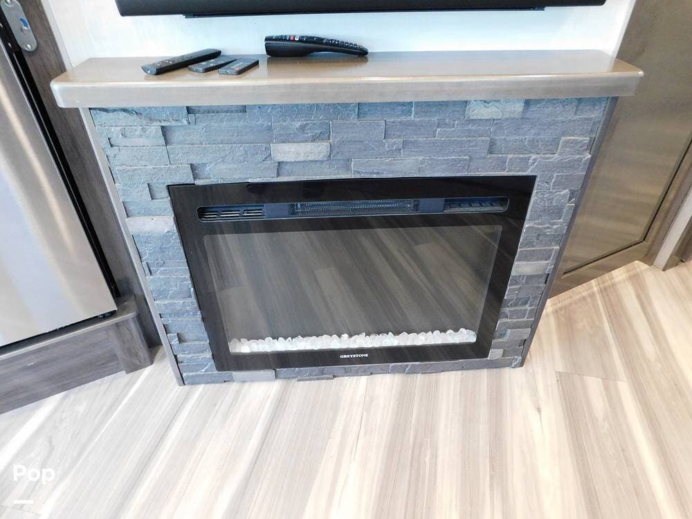 Upon entering the Vacationer 35K, guests are greeted by a stylish and open layout. The living area is designed for relaxation, featuring a plush sleeper sofa and a convertible booth dinette for meals and gatherings. Directly across from the sofa is a fireplace and a large LED TV. Large panoramic windows allow natural light to fill the space, creating an inviting atmosphere and offering scenic views.