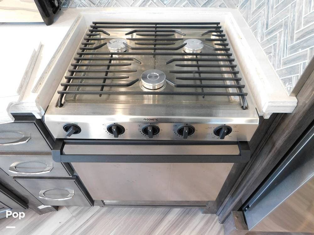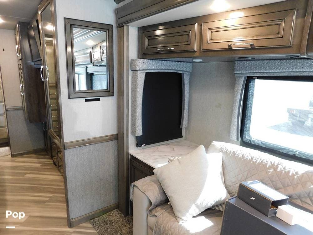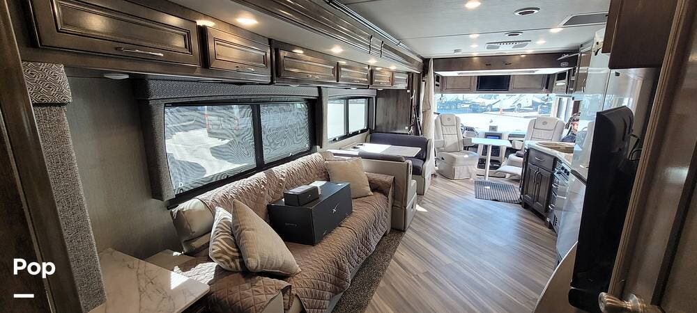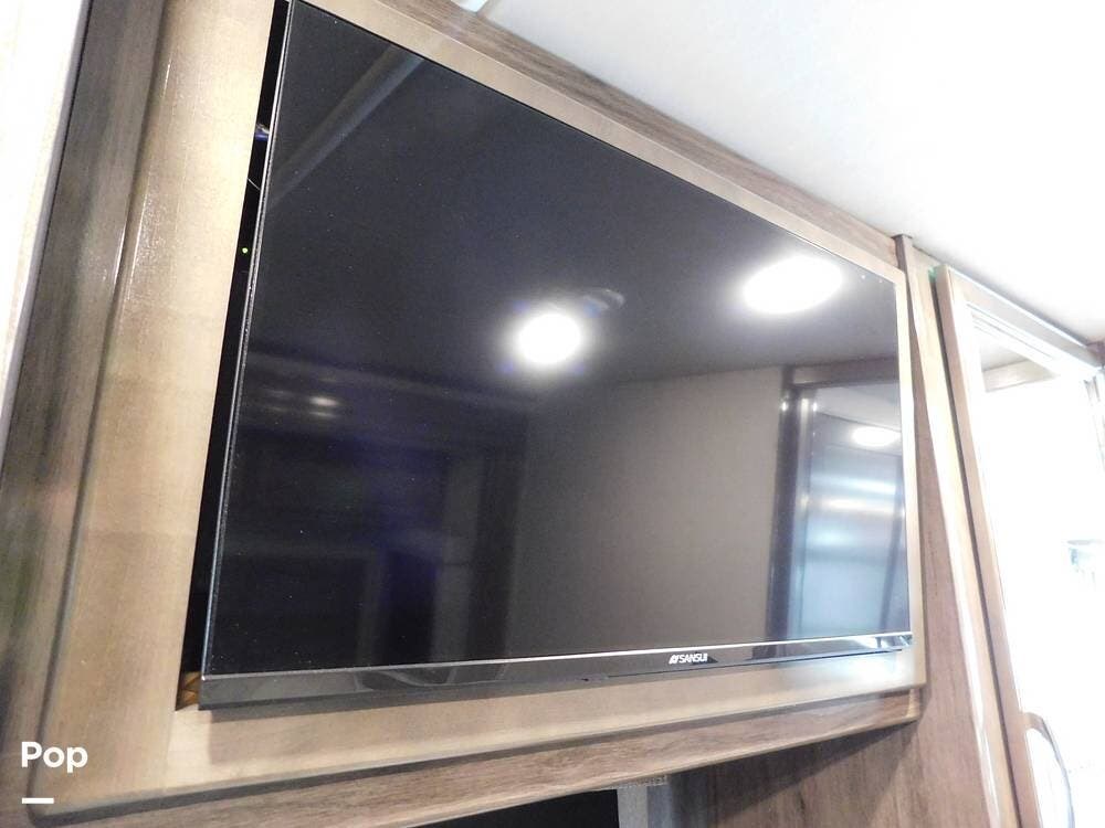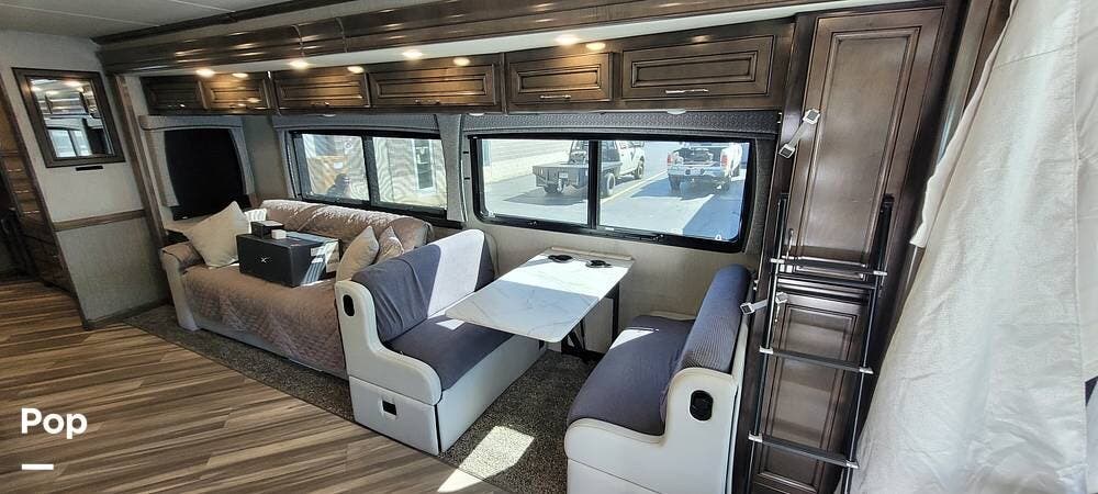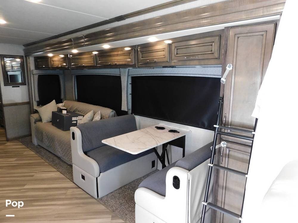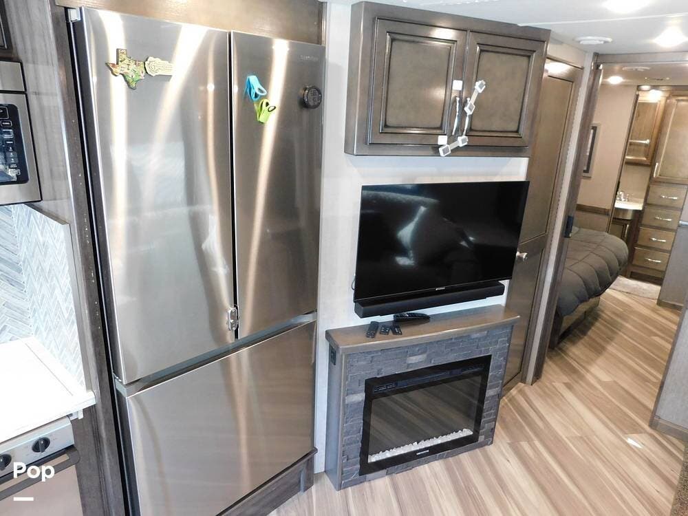 Upon entering the Vacationer 35K, guests are greeted by a stylish and open layout. The living area is designed for relaxation, featuring a plush sleeper sofa and a convertible booth dinette for meals and gatherings. Directly across from the sofa is a fireplace and a large LED TV. Large panoramic windows allow natural light to fill the space, creating an inviting atmosphere and offering scenic views.