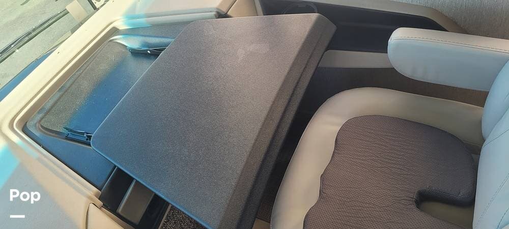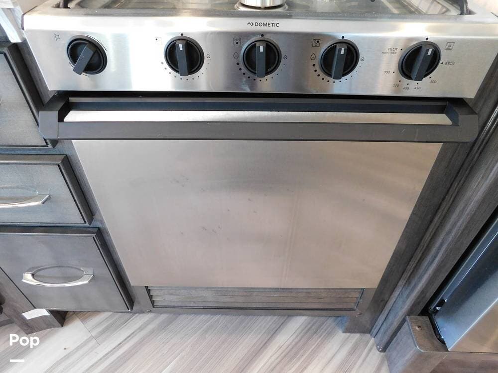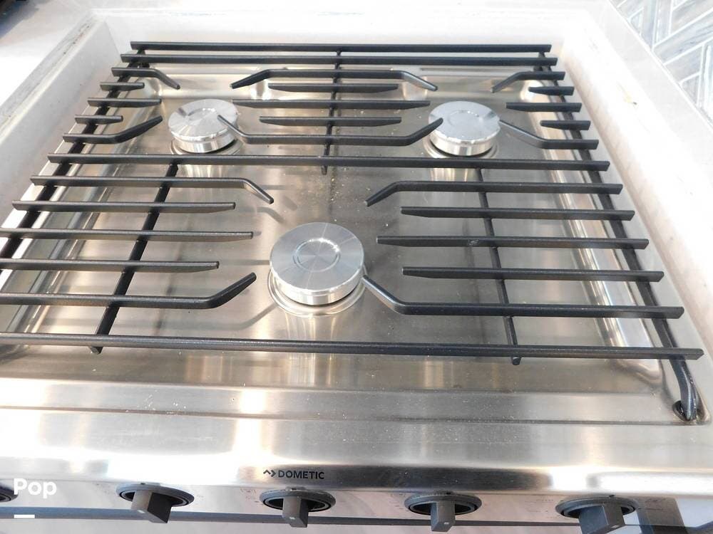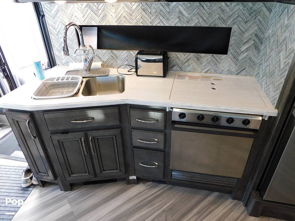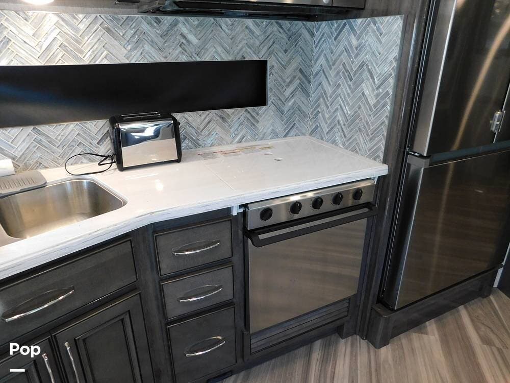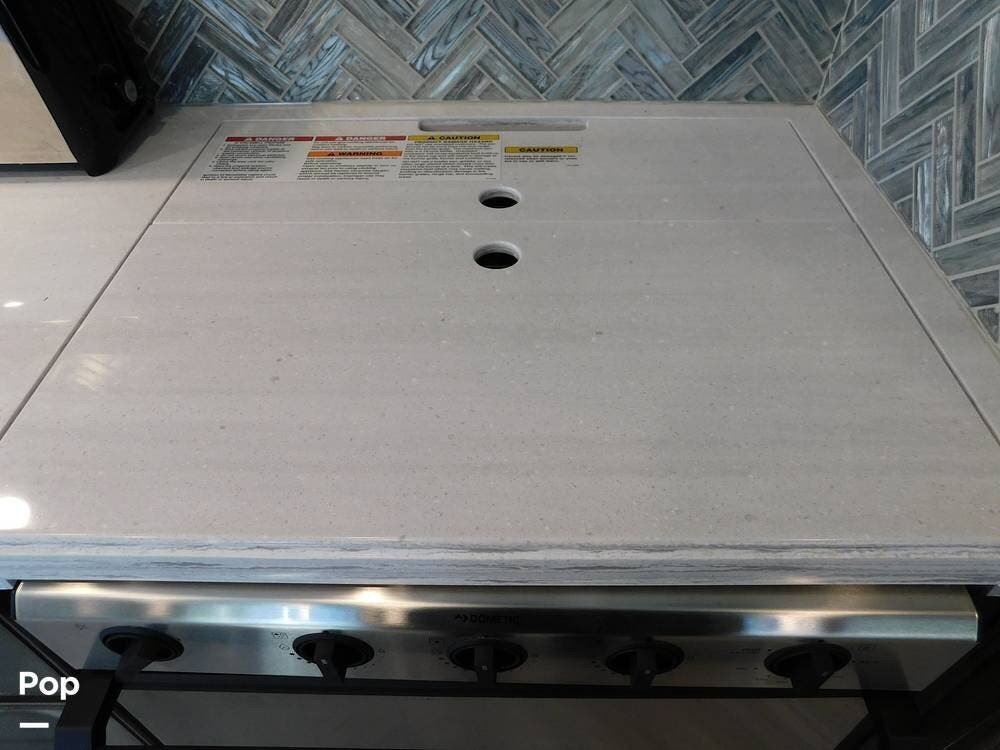 Upon entering the Vacationer 35K, guests are greeted by a stylish and open layout. The living area is designed for relaxation, featuring a plush sleeper sofa and a convertible booth dinette for meals and gatherings. Directly across from the sofa is a fireplace and a large LED TV. Large panoramic windows allow natural light to fill the space, creating an inviting atmosphere and offering scenic views.