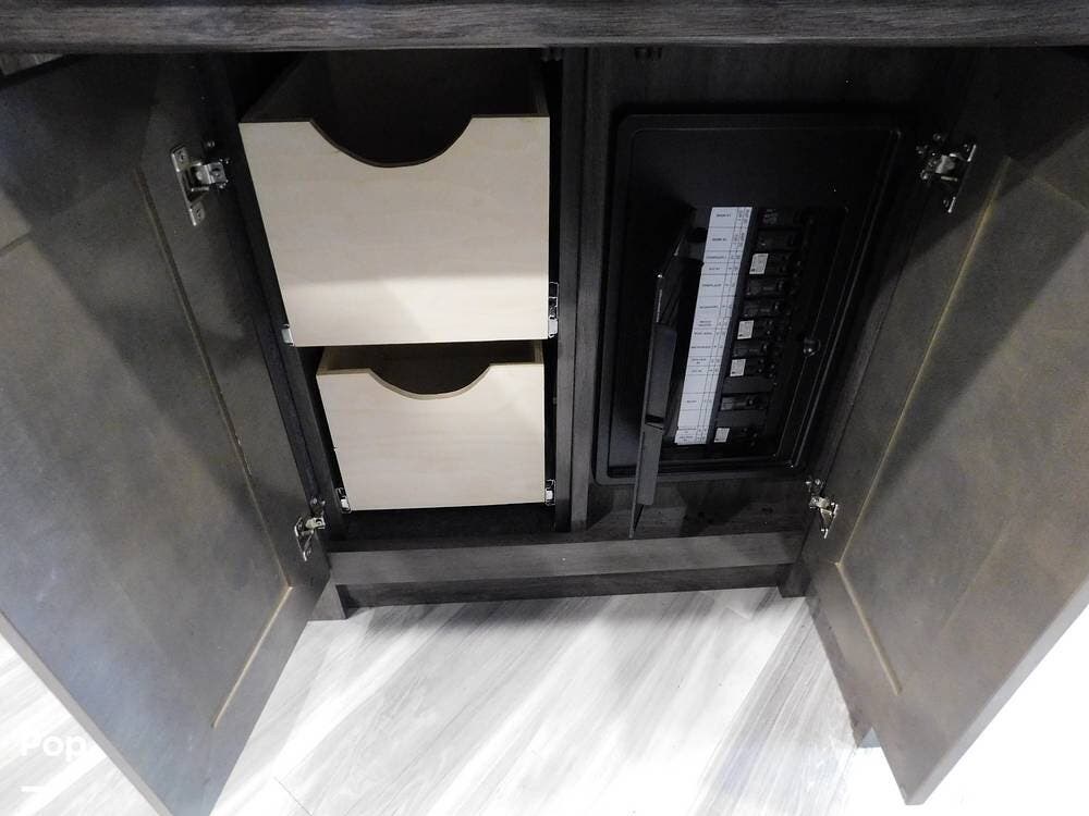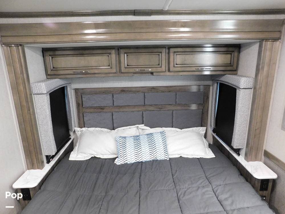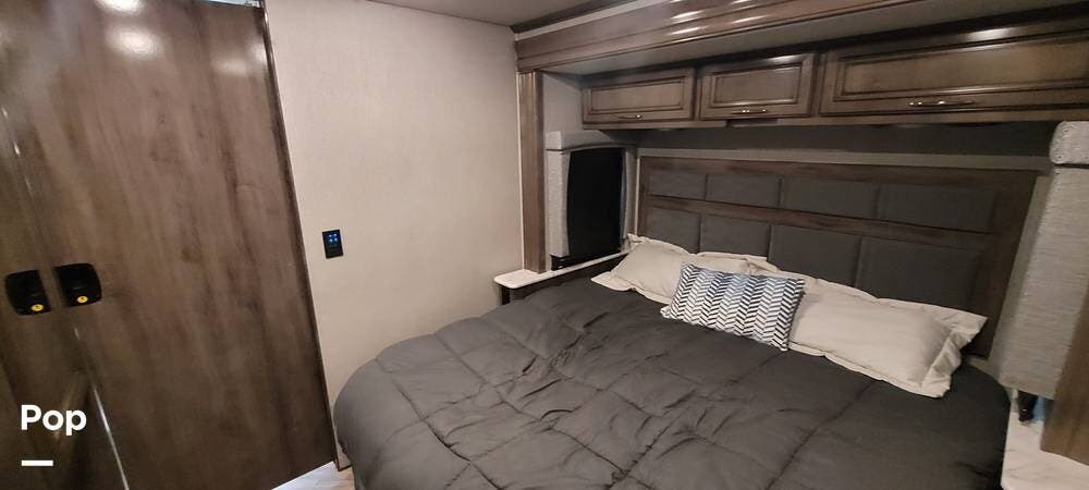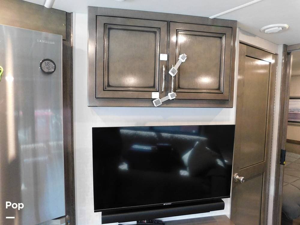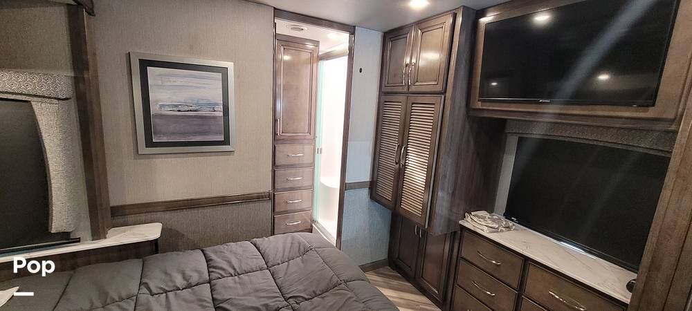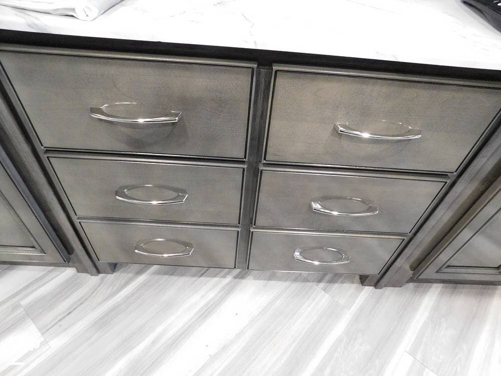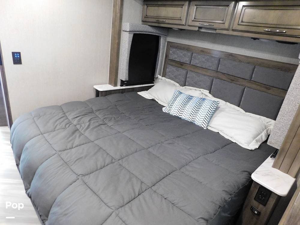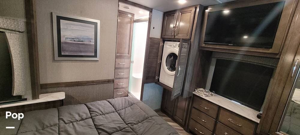The rear bedroom provides a tranquil retreat, complete with a king-size bed outfitted with high-quality bedding and a padded headboard. Overhead cabinets, under-bed storage, and a spacious wardrobe offer plenty of room for clothing and personal items. This one has the optional Combo washer and dryer. Entertainment is provided by a wall-mounted LED TV, making it easy to unwind after a long day of travel. The bedroom is thoughtfully positioned for privacy, separated from the main living area by a sliding door.