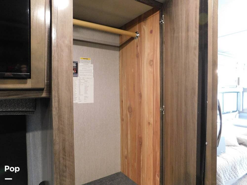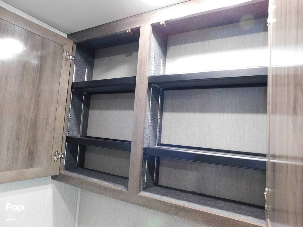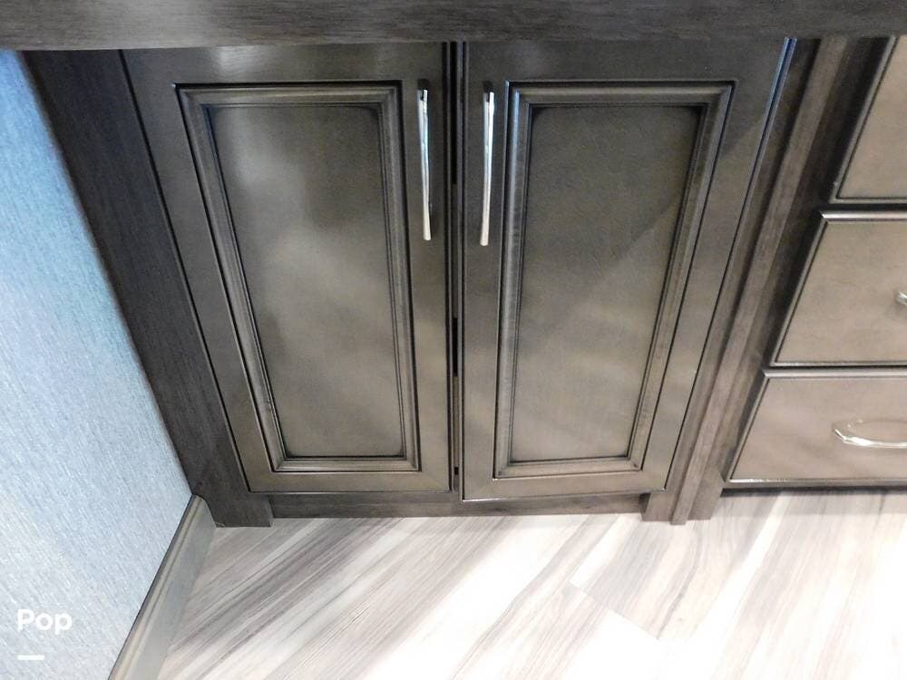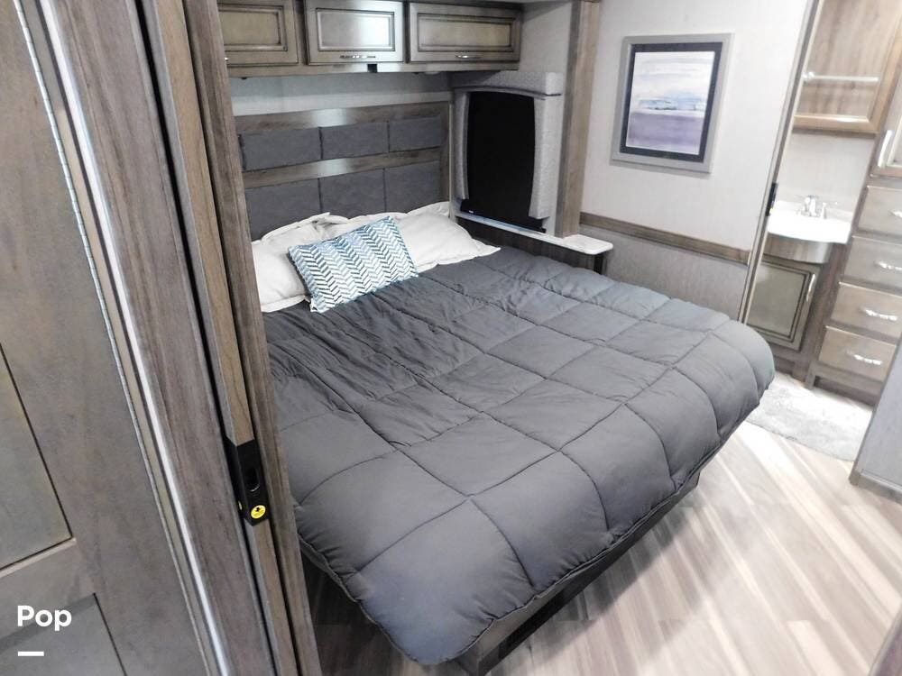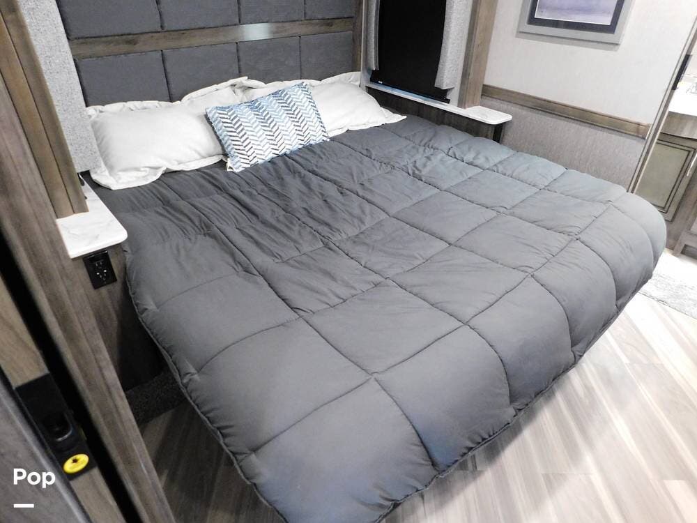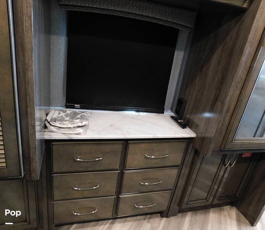 The rear bedroom provides a tranquil retreat, complete with a king-size bed outfitted with high-quality bedding and a padded headboard. Overhead cabinets, under-bed storage, and a spacious wardrobe offer plenty of room for clothing and personal items. This one has the optional Combo washer and dryer. Entertainment is provided by a wall-mounted LED TV, making it easy to unwind after a long day of travel. The bedroom is thoughtfully positioned for privacy, separated from the main living area by a sliding door.