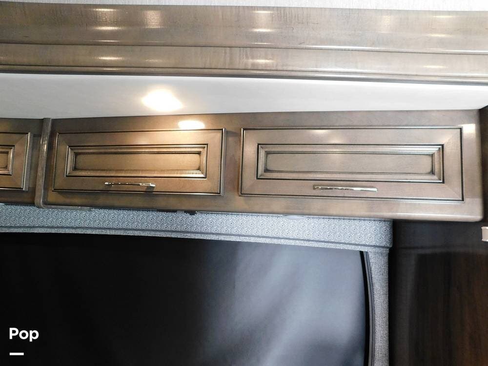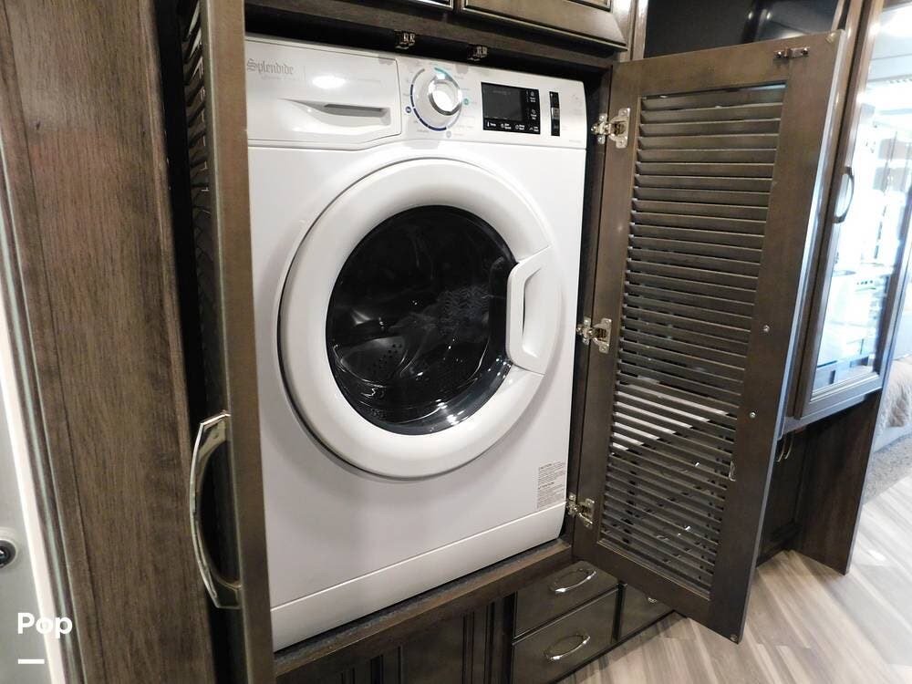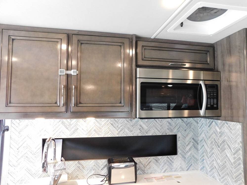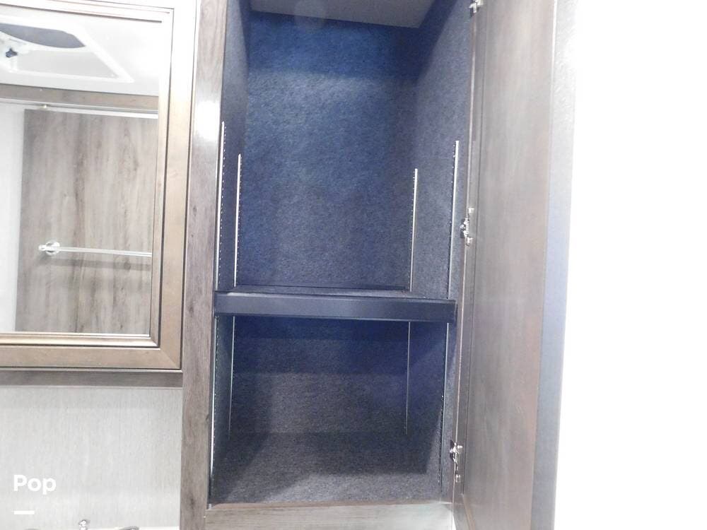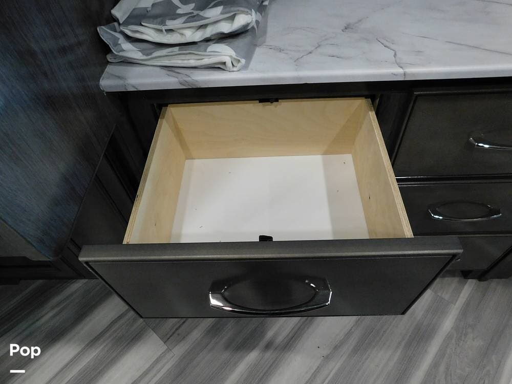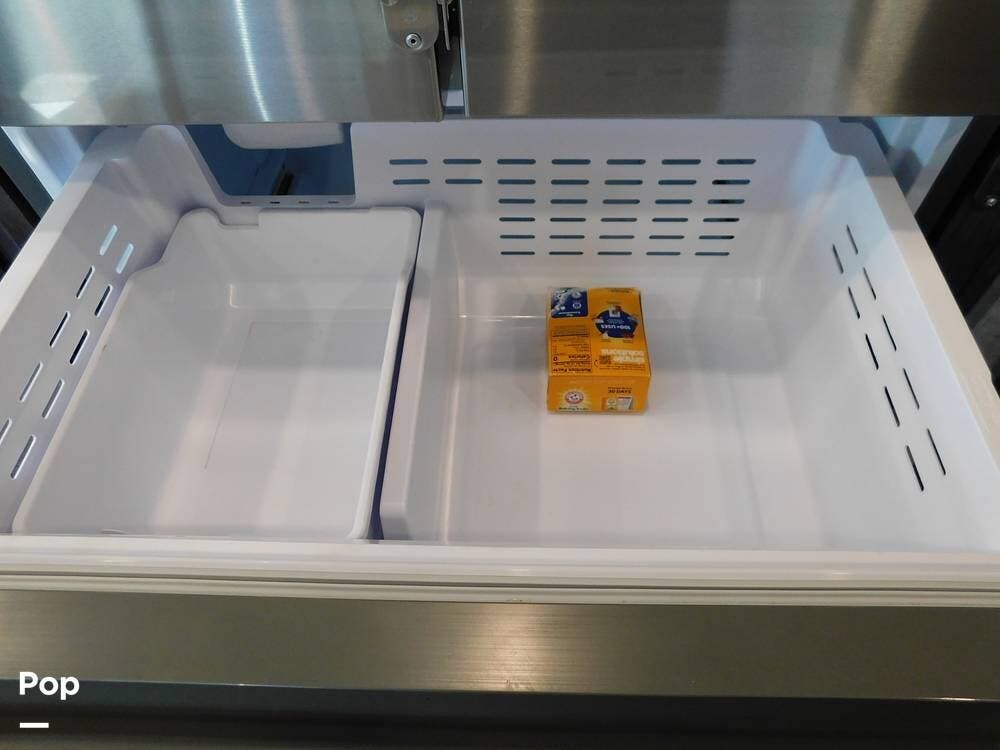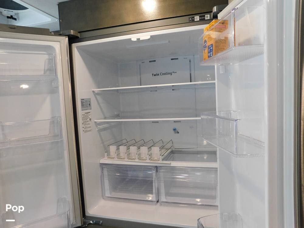 The rear bedroom provides a tranquil retreat, complete with a king-size bed outfitted with high-quality bedding and a padded headboard. Overhead cabinets, under-bed storage, and a spacious wardrobe offer plenty of room for clothing and personal items. This one has the optional Combo washer and dryer. Entertainment is provided by a wall-mounted LED TV, making it easy to unwind after a long day of travel. The bedroom is thoughtfully positioned for privacy, separated from the main living area by a sliding door.
