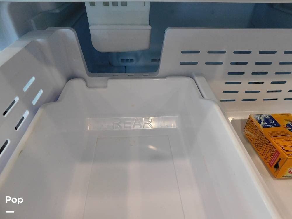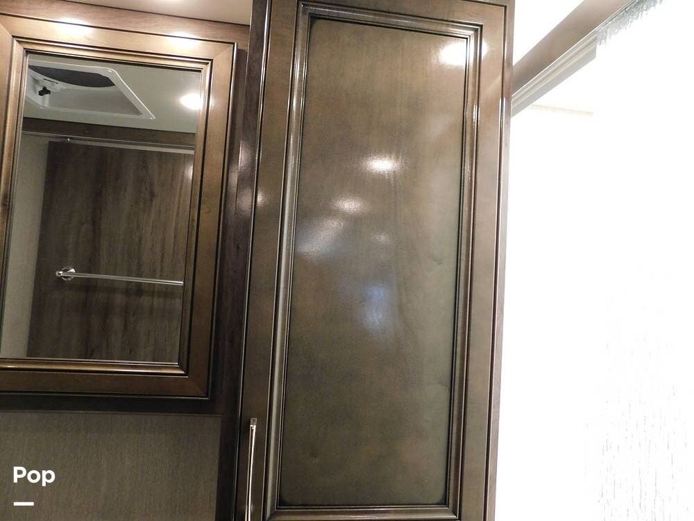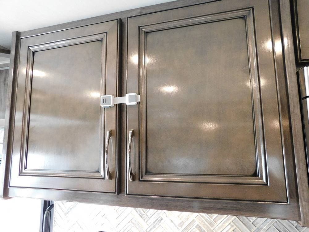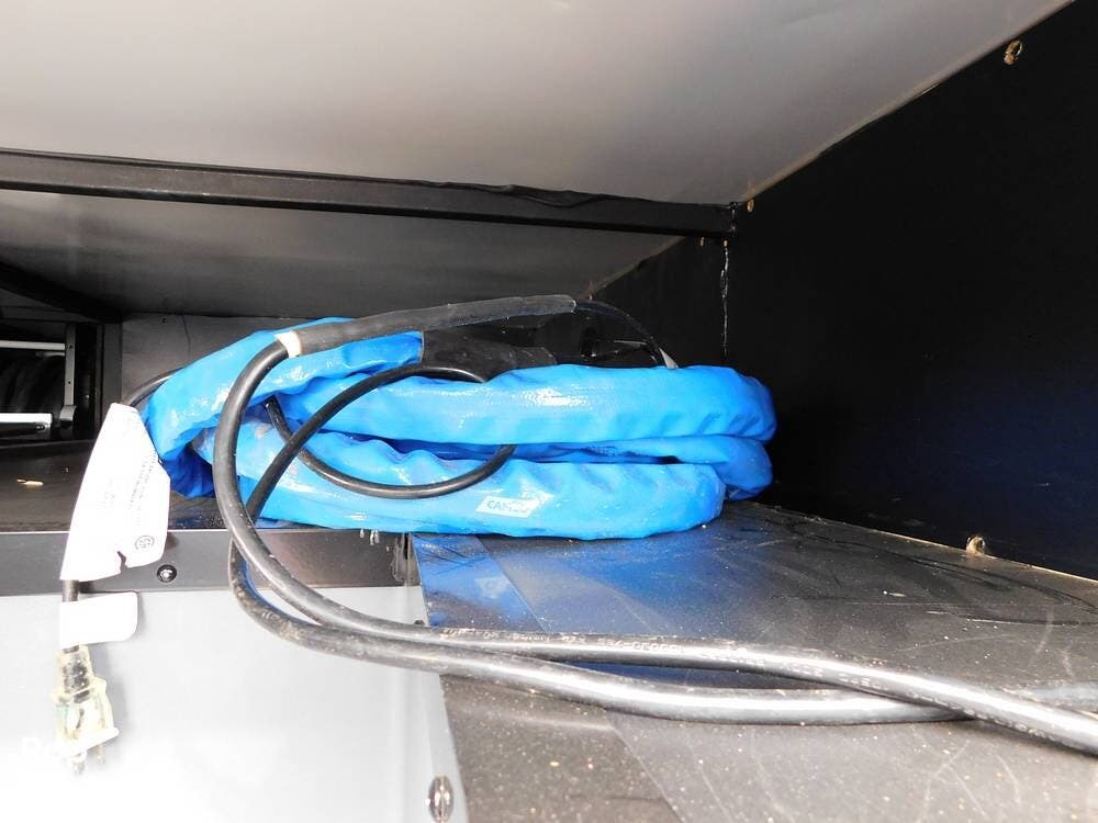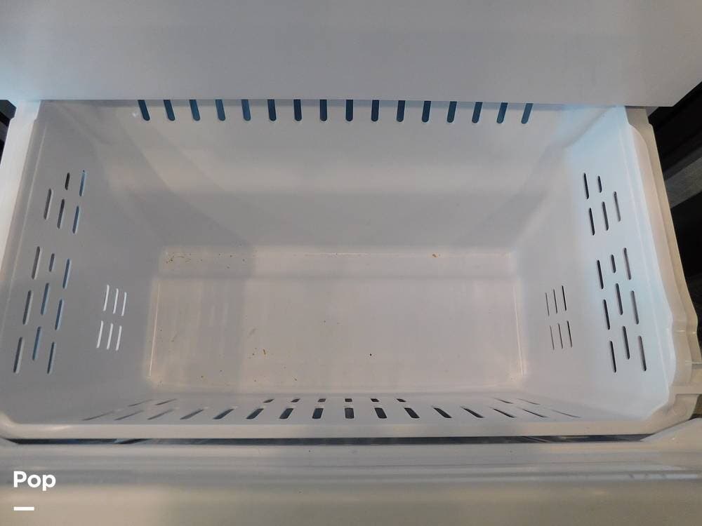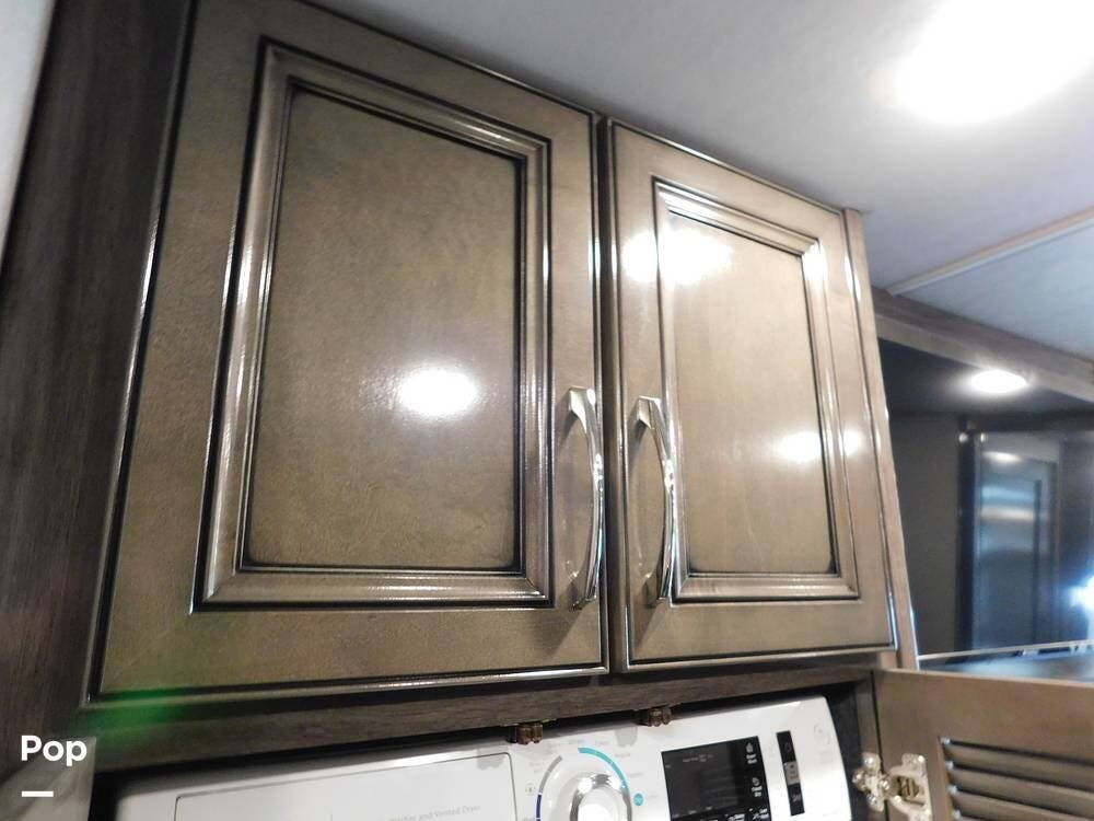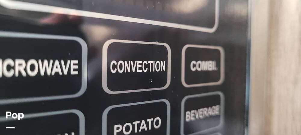The rear bedroom provides a tranquil retreat, complete with a king-size bed outfitted with high-quality bedding and a padded headboard. Overhead cabinets, under-bed storage, and a spacious wardrobe offer plenty of room for clothing and personal items. This one has the optional Combo washer and dryer. Entertainment is provided by a wall-mounted LED TV, making it easy to unwind after a long day of travel. The bedroom is thoughtfully positioned for privacy, separated from the main living area by a sliding door.