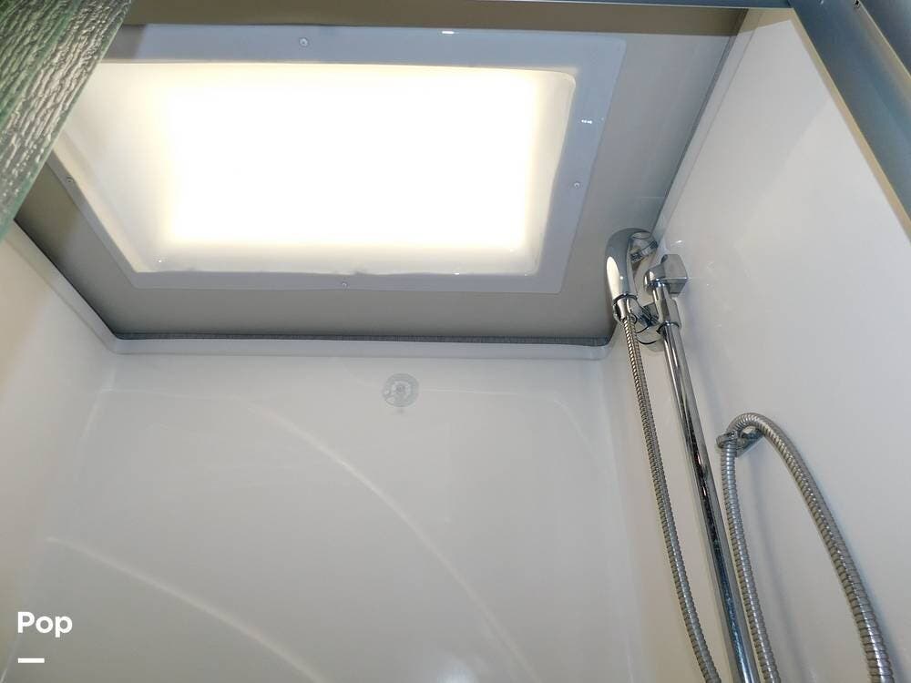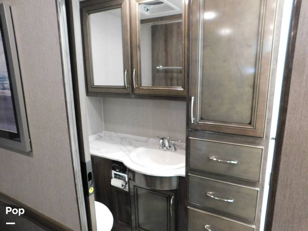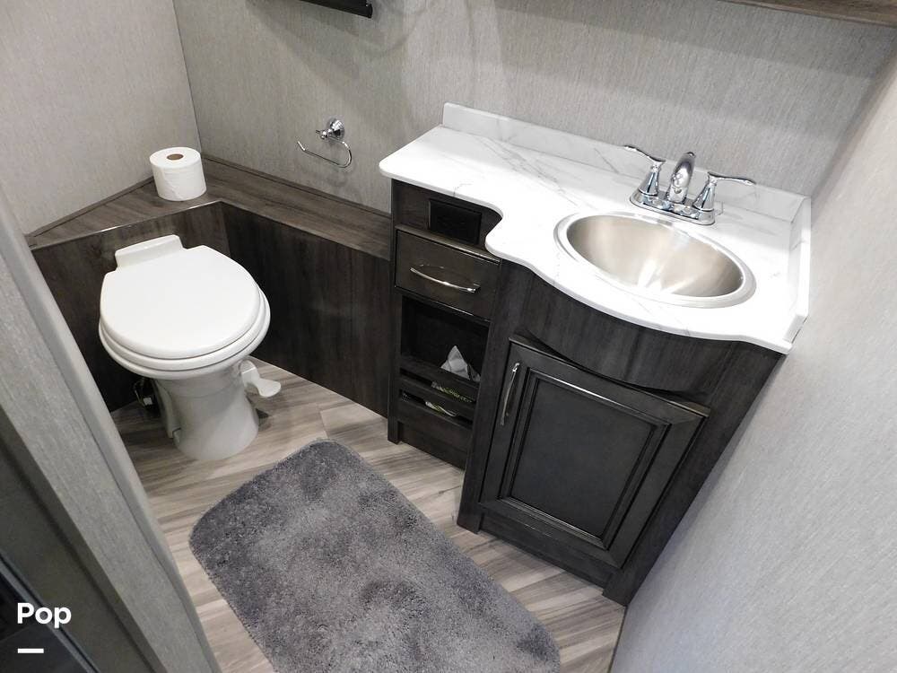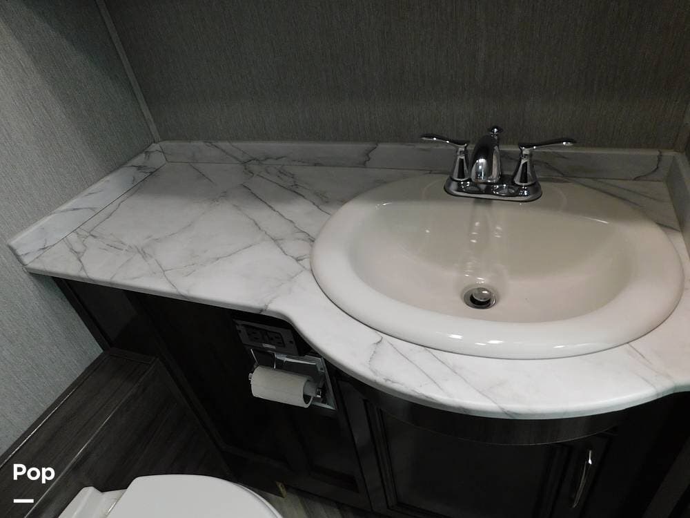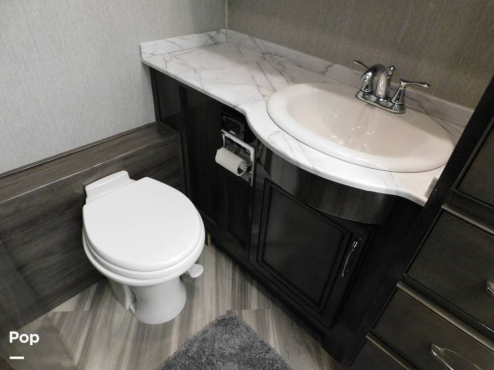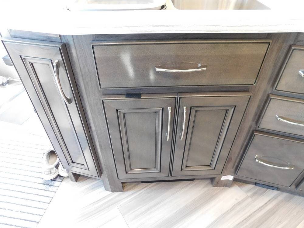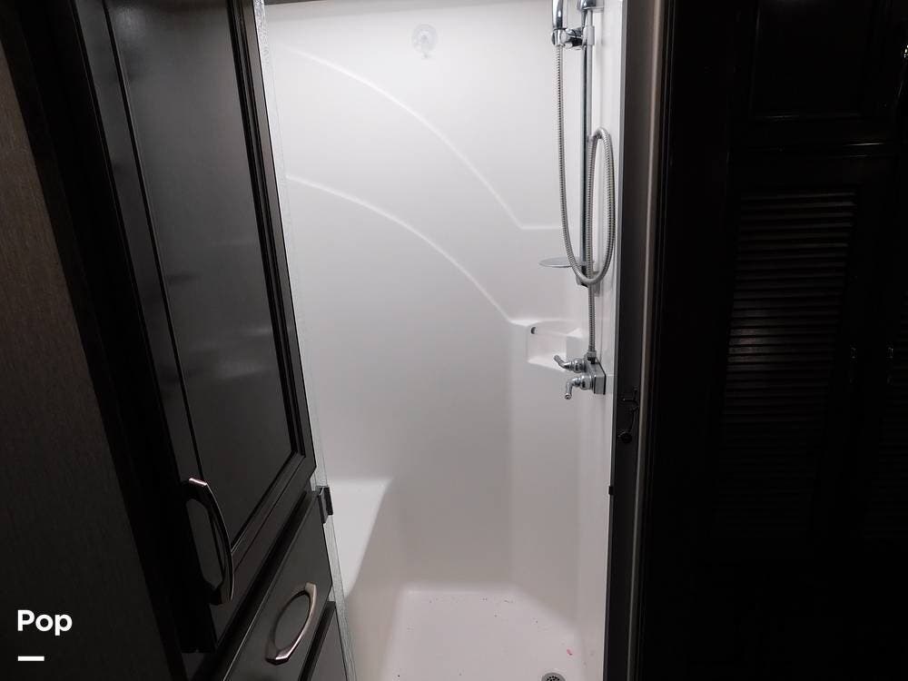 One of the defining features of the 35K floorplan is the bath-and-a-half configuration. The mid-coach half bath is easily accessible for guests, while the rear full bathroom serves the owner's suite. The full bath boasts a large shower with glass doors, a porcelain toilet, a vanity with a solid-surface counter, and ample storage for towels and toiletries. High-end fixtures and a skylight above the shower add an extra touch of luxury.