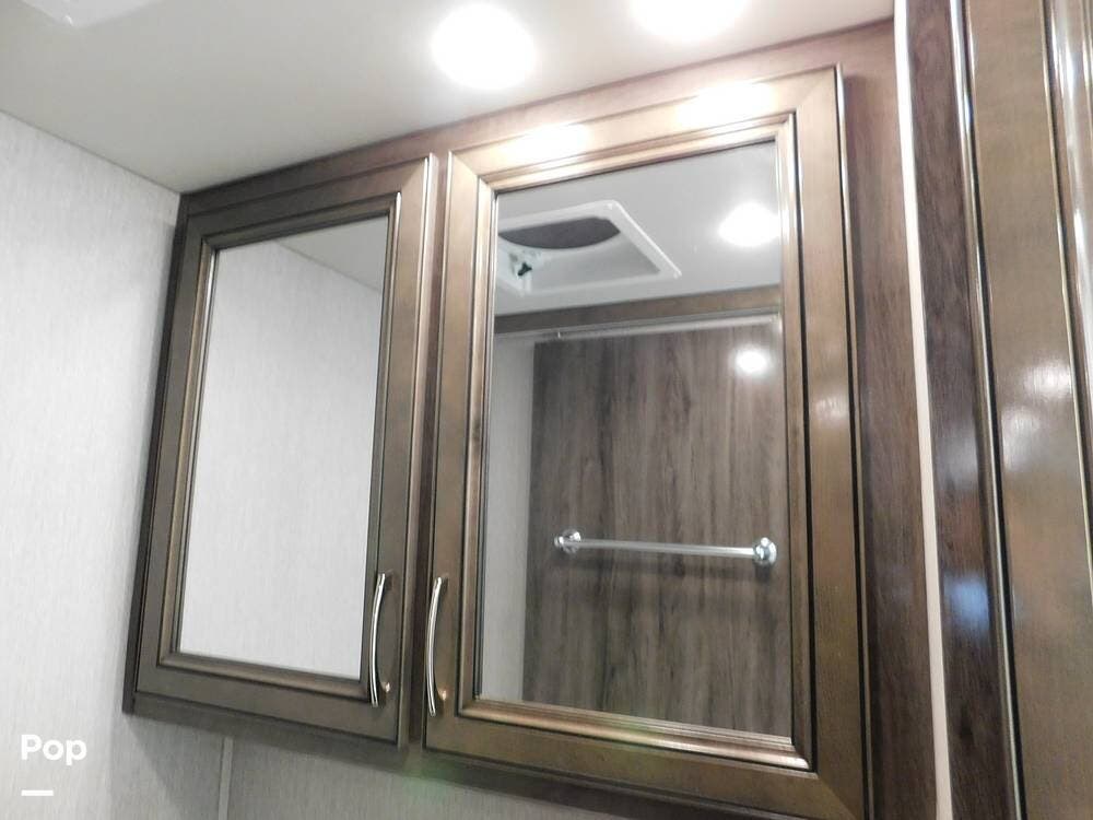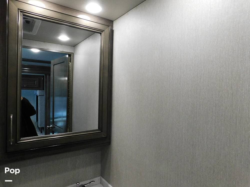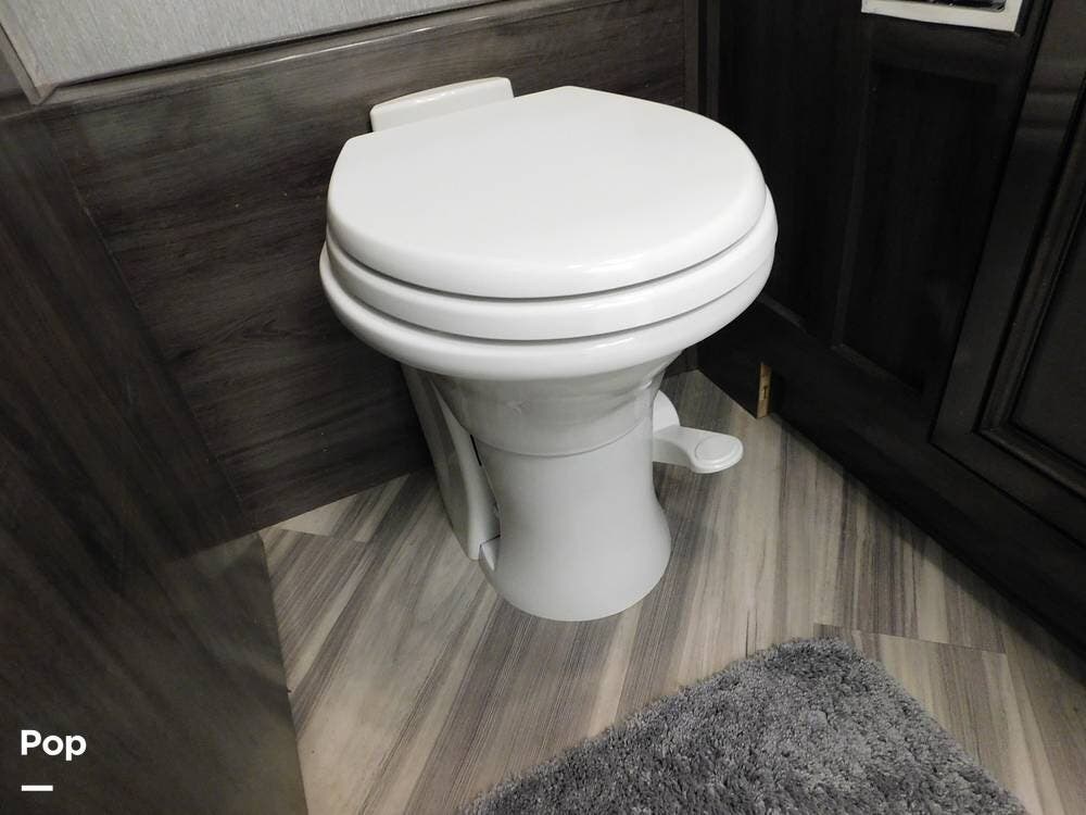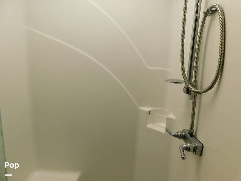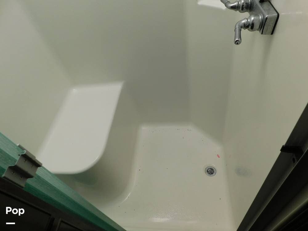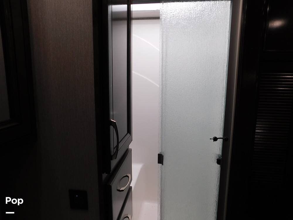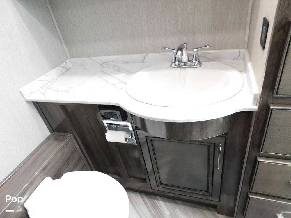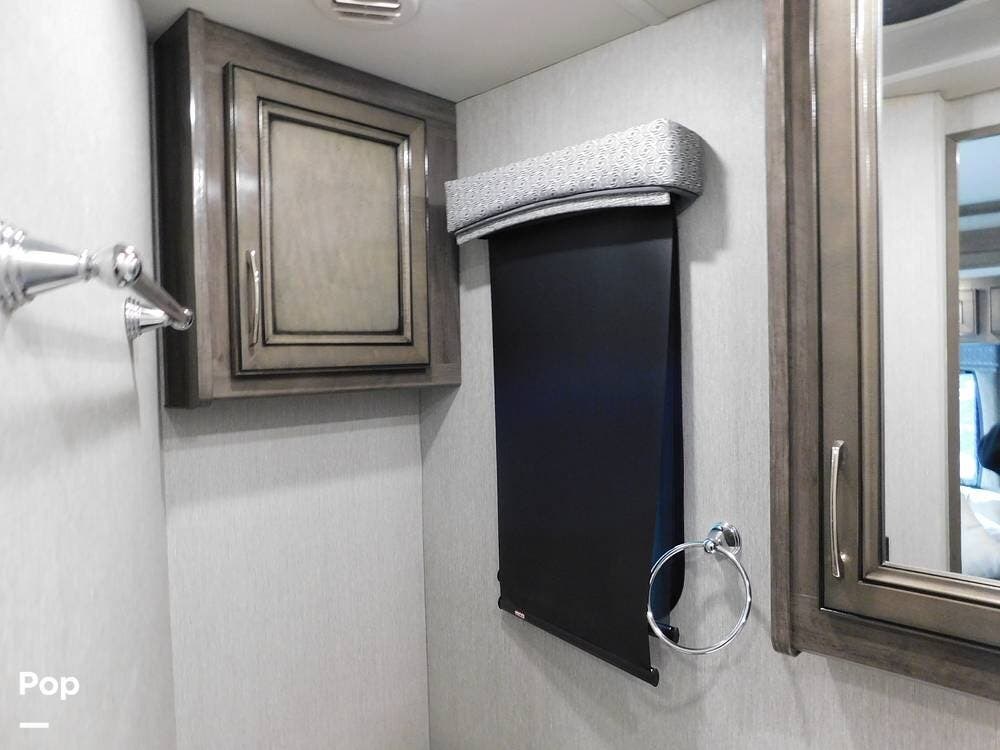 One of the defining features of the 35K floorplan is the bath-and-a-half configuration. The mid-coach half bath is easily accessible for guests, while the rear full bathroom serves the owner's suite. The full bath boasts a large shower with glass doors, a porcelain toilet, a vanity with a solid-surface counter, and ample storage for towels and toiletries. High-end fixtures and a skylight above the shower add an extra touch of luxury.