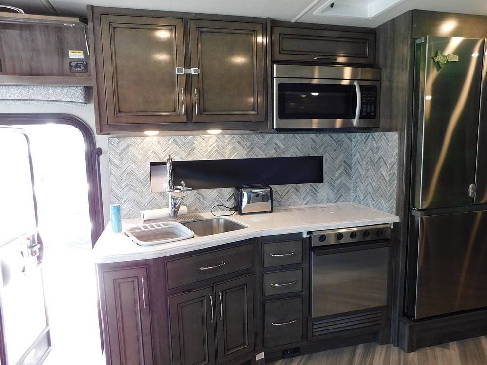 The main living area seamlessly transitions into a fully equipped kitchen, which includes solid-surface countertops, a residential-size refrigerator, a convection microwave, a three-burner cooktop, and an oven. Ample cabinetry and pantry space make it easy to store groceries and kitchen essentials, while a stainless steel double sink provides convenience for meal prep and cleanup.