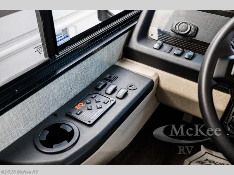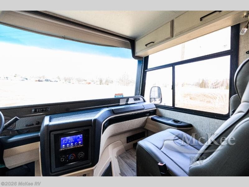 With any Alante Class A gas motorhome by Jayco, the mandatory Customer Value package provides JRide technology with a computer-balanced driveshaft ensuring smooth and efficient power transfer to the wheels, the Bilstein steering stabilizer, and SACHS shock absorbers offering independent adjustments to the road conditions, plus a one-piece, seamless, crowned fiberglass roof, and an exterior entertainment center to watch shows and movies. The automatic hydraulic leveling jacks, the 120 in. panoramic windshield, the 190W solar panel, the entrance door with industry's largest travel-view window, and the electric-powered entrance step will make traveling that much easier. And the interior equipment includes a Sony infortainment center with Apple CarPlay and Android Auto, a backup and side-view cameras for easy parking, and a 6-way power driver seat for comfortable and safe driving, plus a power front privacy shade with manual side privacy shades, LED-lit hardwood fascia and countertops, a pop-up charging station in the kitchen and a USB port and wireless charging in the nightstands.