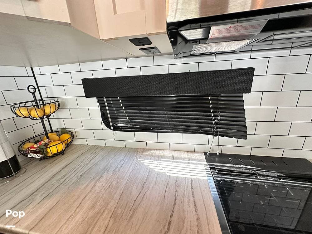 On the exterior, you have all the normal utility hookups plus a very nice kitchen with a small refrigerator, countertop, and extra storage, including an electric full patio shade and lots of storage.