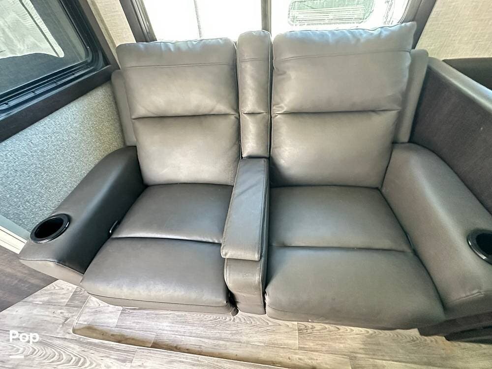 Across from the door is a full bathroom with a vanity, toilet, shower, and sink. Across from the door are stadium-style recliners, with a full view of a large screen TV and a fireplace.