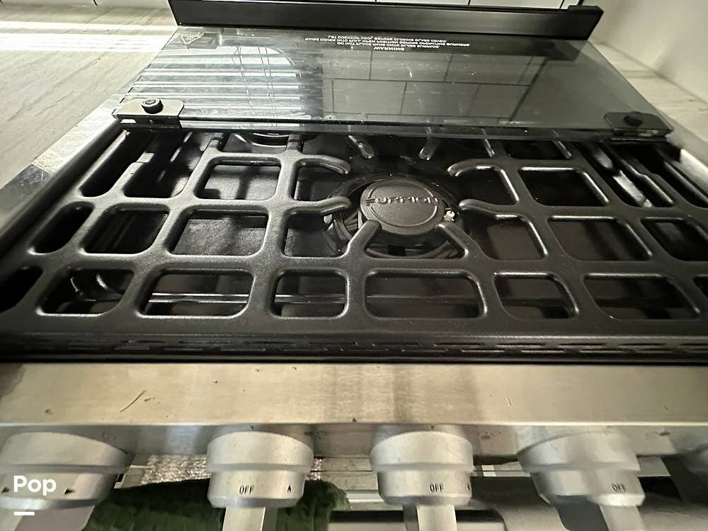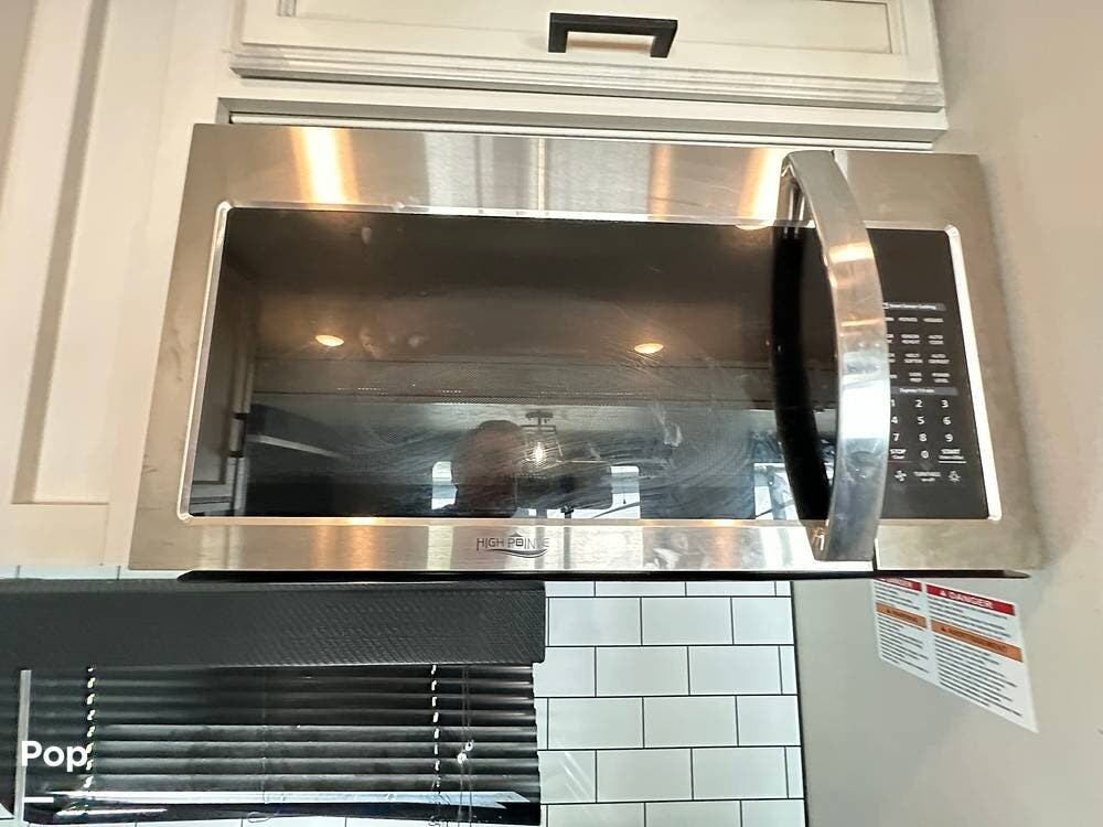 To the right, you have a full kitchen with a convection microwave, refrigerator/freezer, three-burner stovetop with oven, and double sink with spacious storage and countertop.