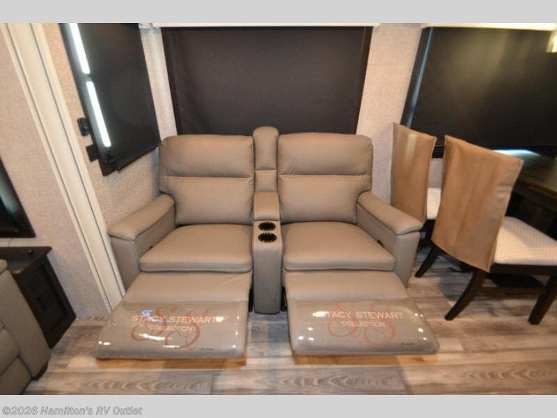 You're going to feel right at home in this fifth wheel! The kitchen island makes your meal prepping easier and you can enjoy your meals at the free standing table and chairs. There is plenty of storage space throughout between the overhead cabinets, the entry wardrobe, the kitchen pantry, and the wardrobe/linen closet in the front private bedroom. The bedroom also has a queen bed with wardrobes and nightstands on either side to set your glass of water or phone. After a fun day of exploring, you can freshen up in the full bathroom with the shower and then relax in the rear living area on either the tri-fold sofa or the theater seating across from the entertainment center which has an optional fireplace to add for even more comfort!