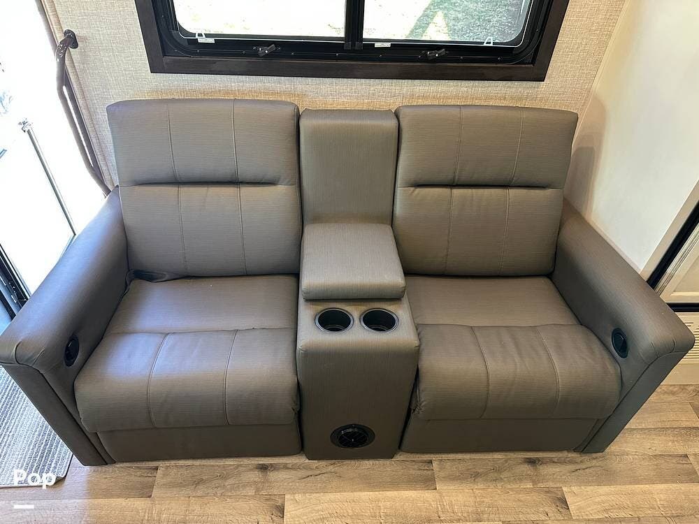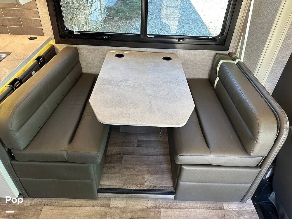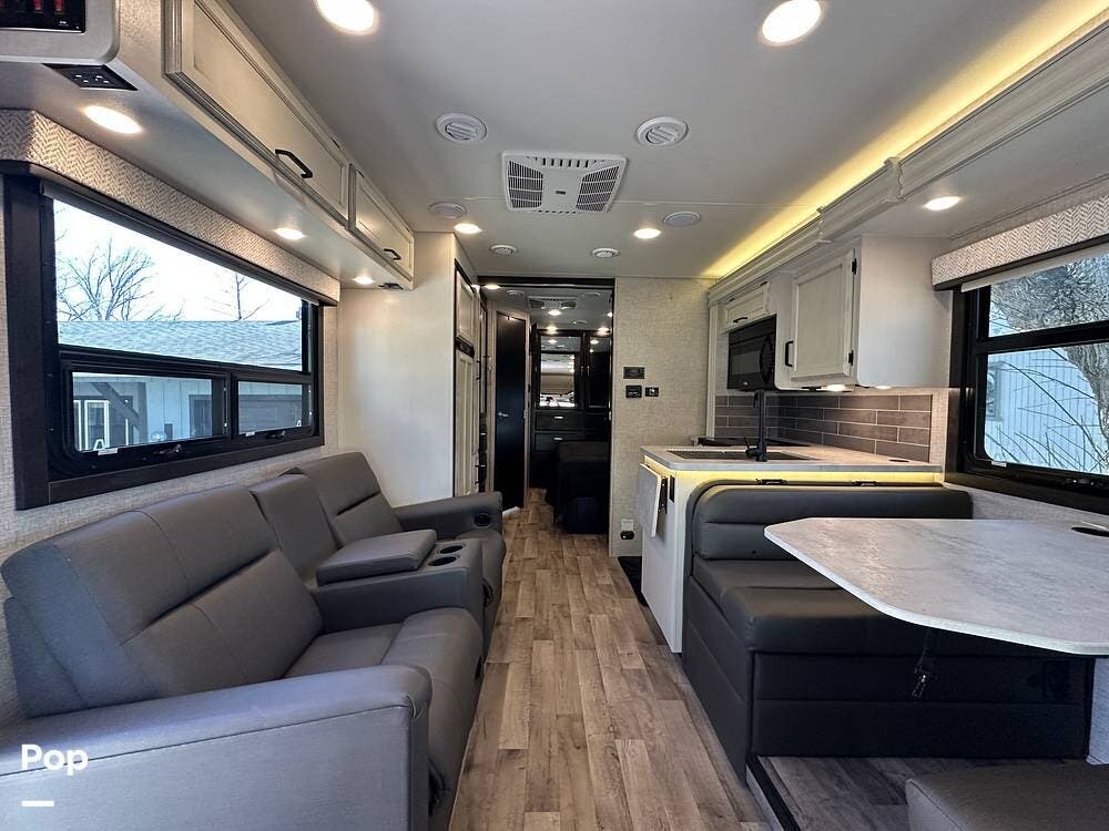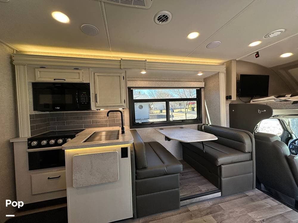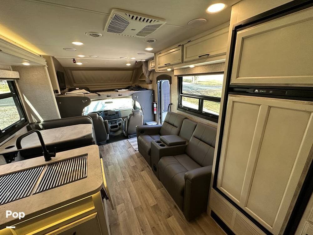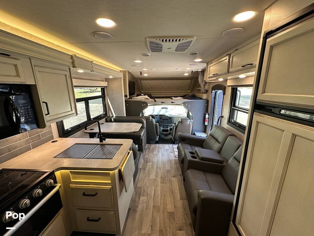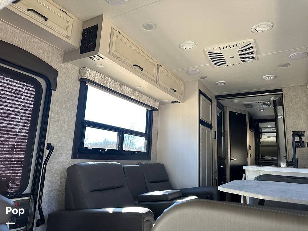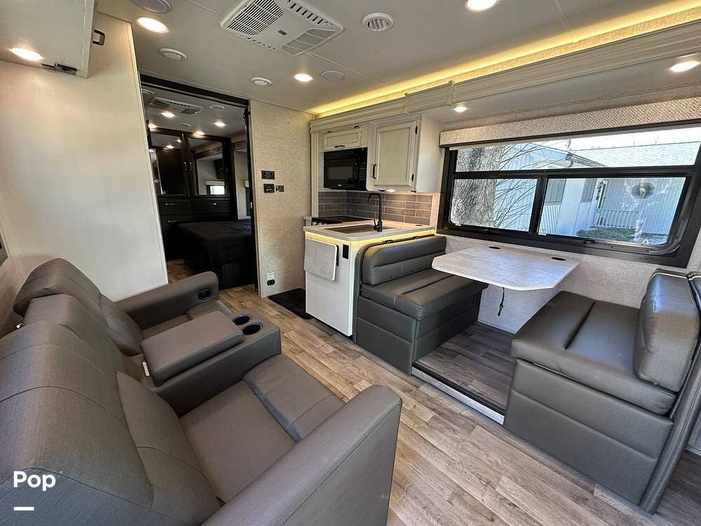 It also features the theater sofa, offering a more comfortable and modern seating option for relaxing at the end of the day. The 27U floor plan delivers a smart balance of living space and drivability, giving you room to spread out without sacrificing ease of handling. It is large enough to be comfortable for extended trips, yet manageable for first-time buyers stepping into a Class C.