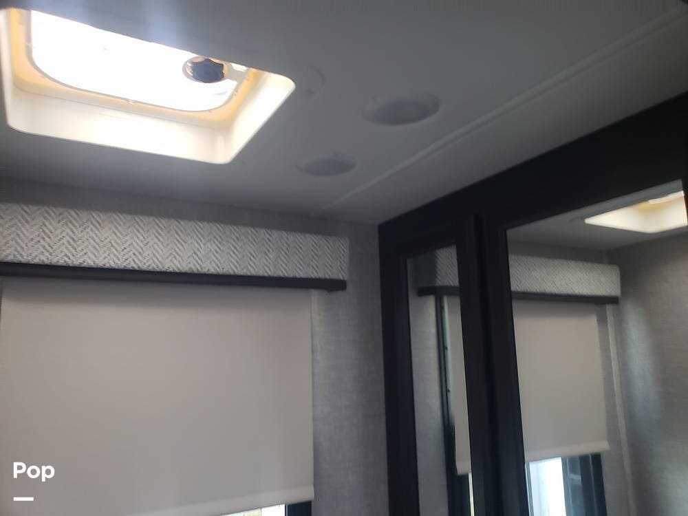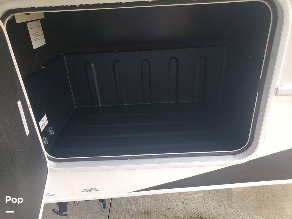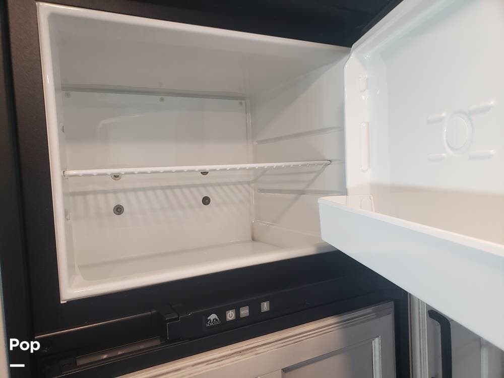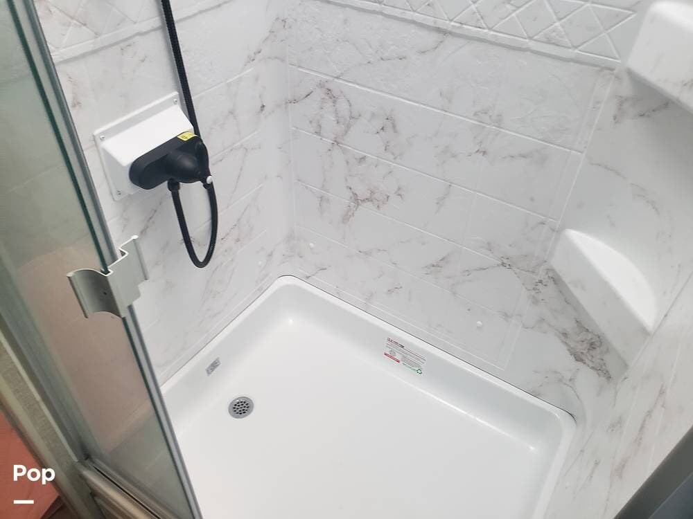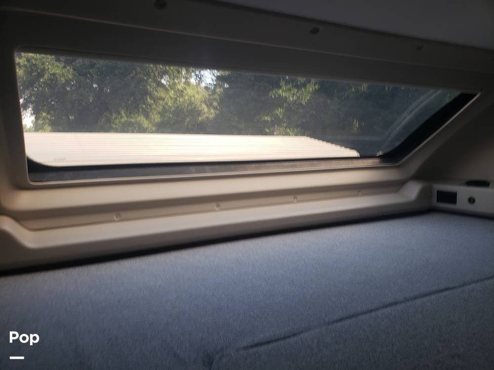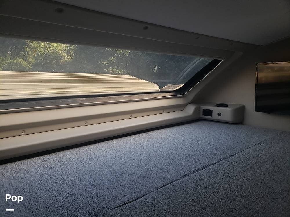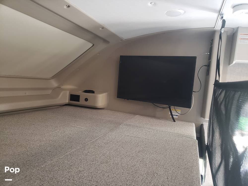 As you enter the cabin, you'll notice the overhead bunk to the right, which features a flat-screen TV, an electric front window shade, and can support up to 750 pounds.