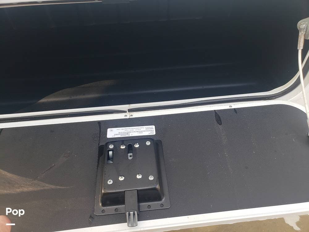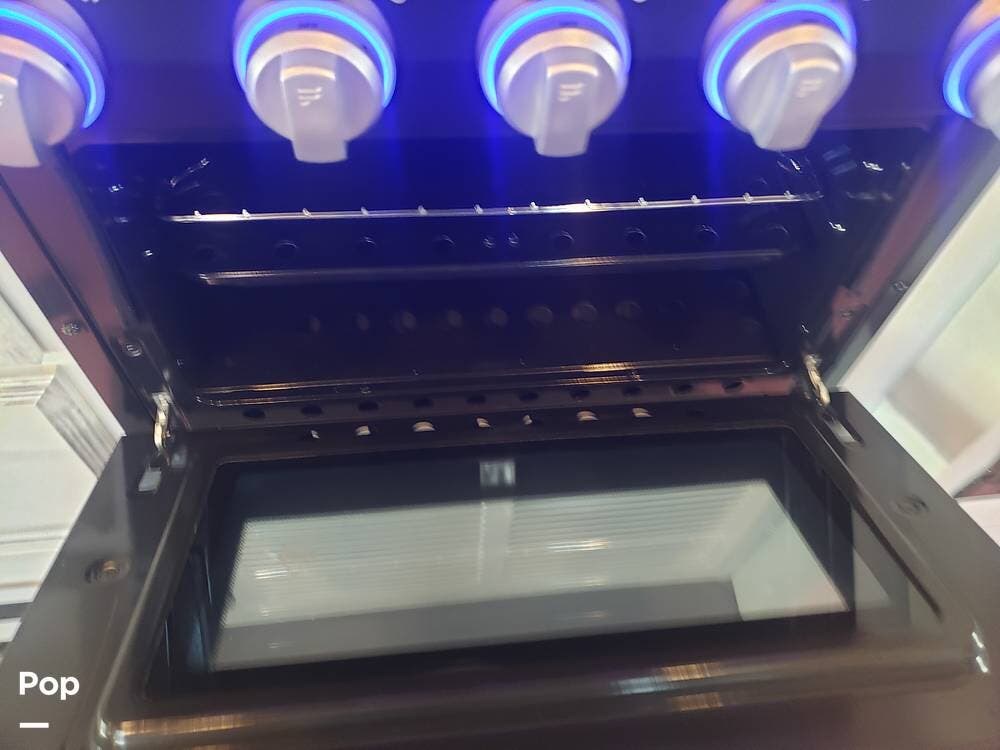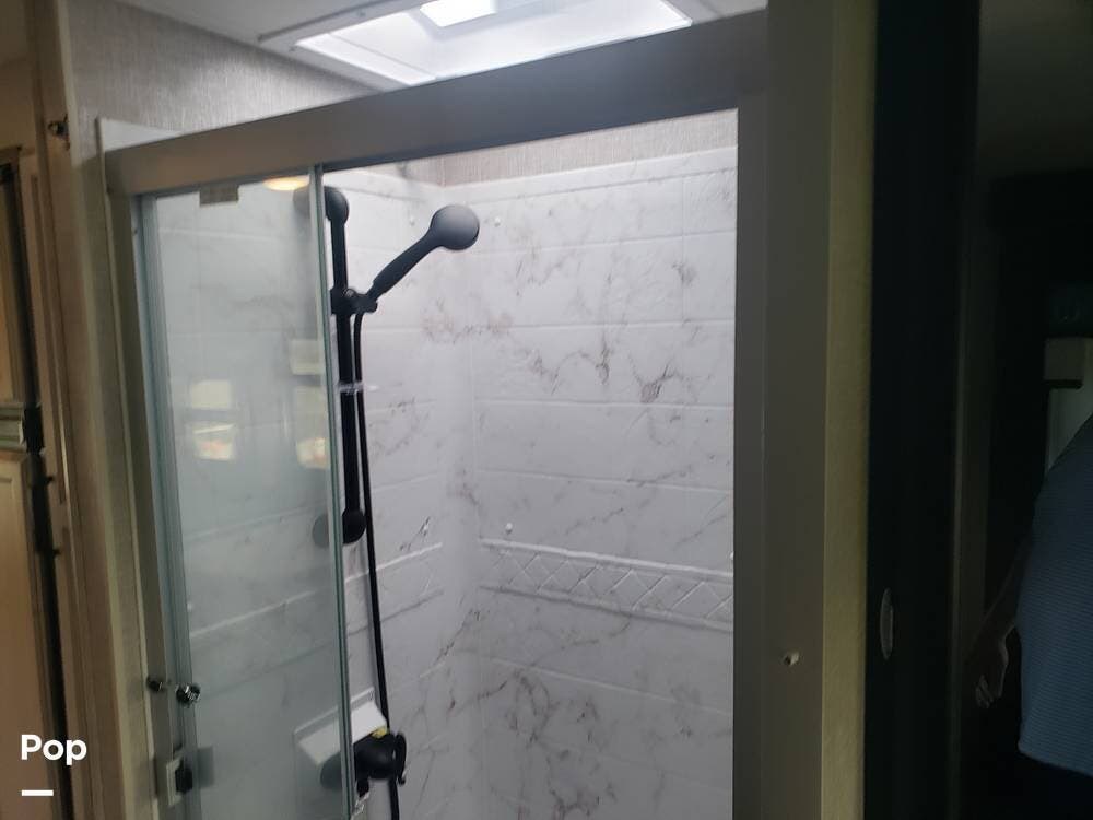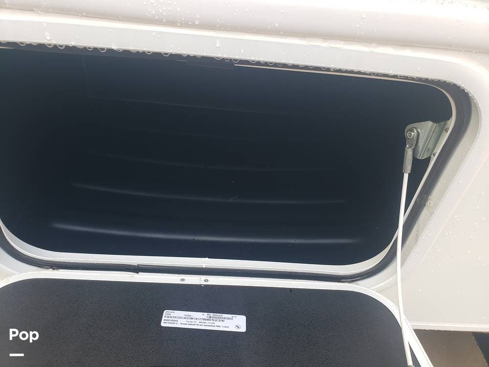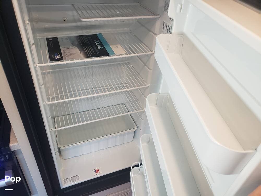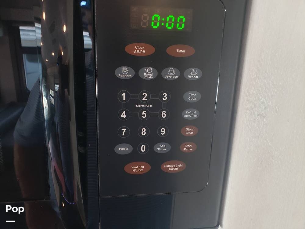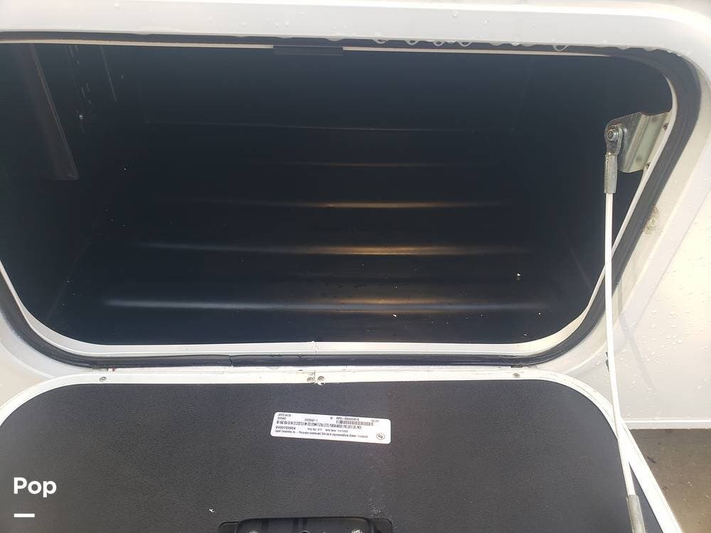 As you enter the cabin, you'll notice the overhead bunk to the right, which features a flat-screen TV, an electric front window shade, and can support up to 750 pounds.