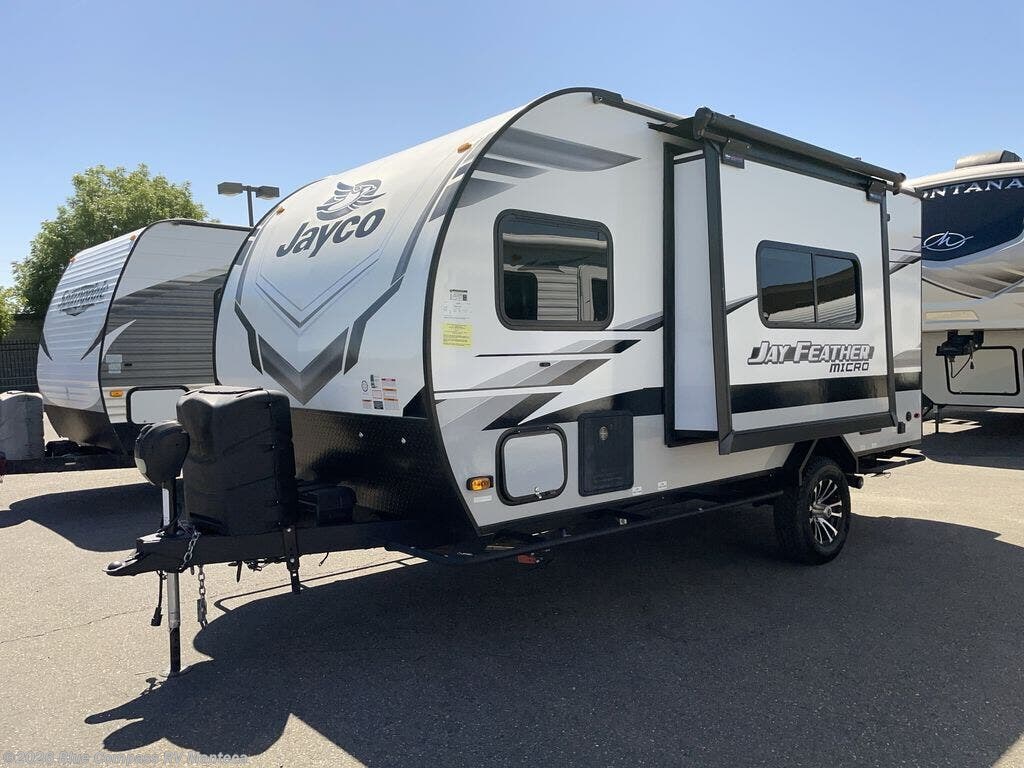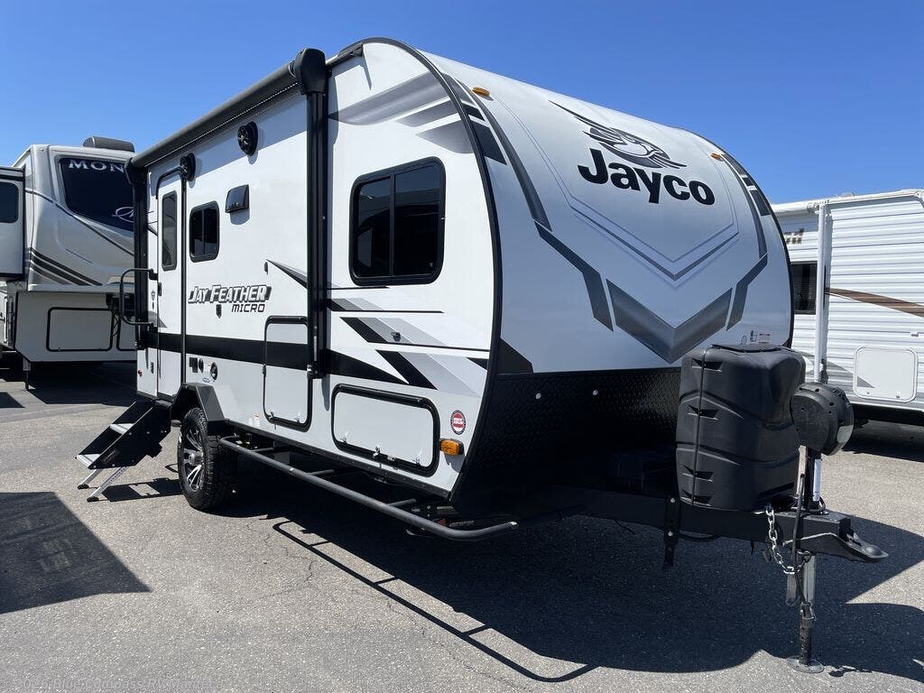 The Jay Feather Micro travel trailers by Jayco are for those looking for lightweight camping, while not sacrificing comfort and convenience. The modern retro graphics package is sure to be eye-catching, and the newly designed interiors will have you feeling right at home. Each model features an American-made frame with an integrated A-frame, Goodyear off-road tires, plus a new Rock Solid stabilizer system for a more stable camping experience. Some of the interior comforts you will enjoy are the residential vinyl flooring with cold crack resistance, screwed and glued cabinetry, and LED lighting. Adventure is waiting for you with a Jay Feather Micro travel trailer. Choose your favorite floorplan today!