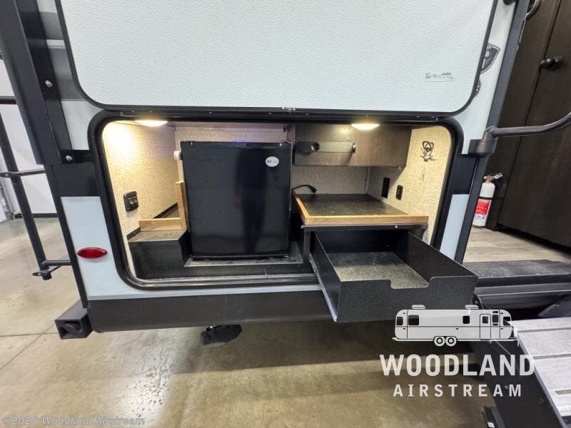 Whether you are a couple or a larger group, this trailer offers a spacious main living and kitchen area as well as rear bathroom for privacy. You will also find linen storage and ample counter space for toiletries. The space savings door even gives you more floor space in both the bathroom and the main area. The single slide holds the U-shaped dinette and refrigerator for even more floor space, the L-shaped kitchen area allows the cook their own space to make meals, and the walk-in pantry is perfect for extra goodies on those longer camping trips. The front bedroom provides privacy as well with its own space saving door, and you can sleep like a queen at night. You can choose a few options if you like such as theater seats in place of the dinette, the Solar Power package, 120V heated tanks pads, and/or an 6 cu. ft. gas/electric refrigerator.