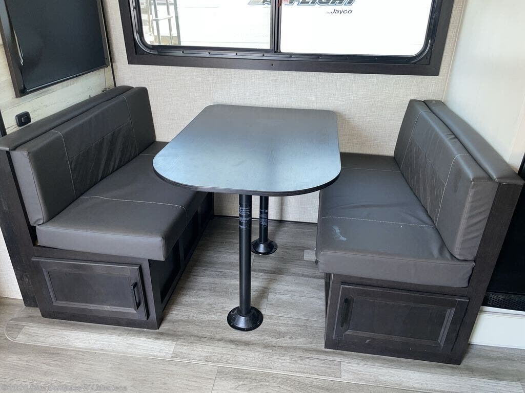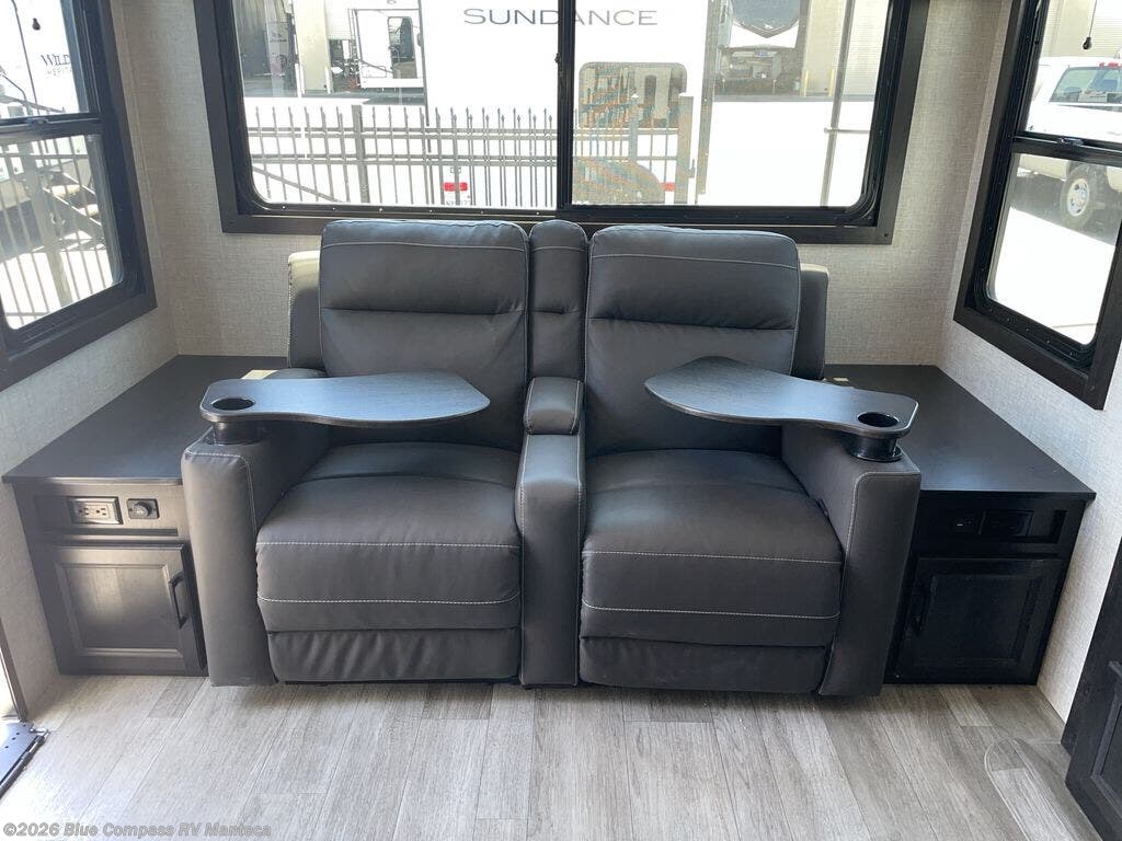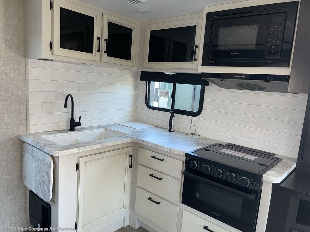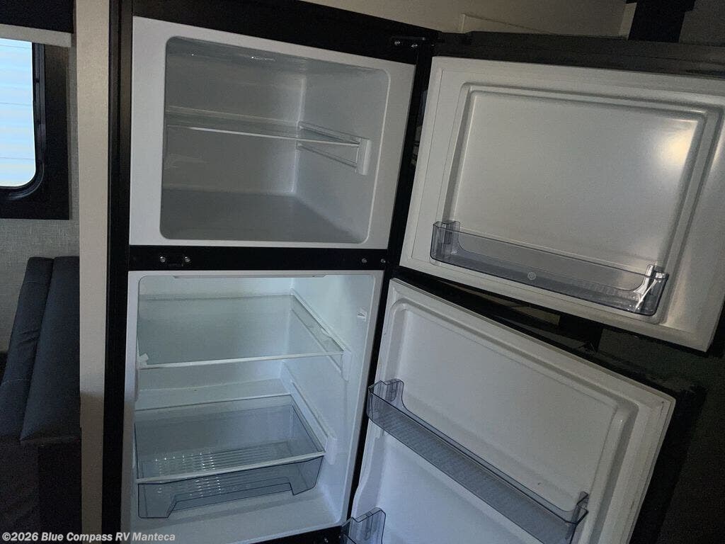 You will experience a smooth flow of traffic in and out of this travel trailer with dual entry doors! The front private bedroom has one of these entrances and a 60" x 75" queen bed with wardrobes on either side to keep your clothes looking nice. The full bathroom has a shower for you to freshen up in each morning and a linen closet to keep your towels close. You will appreciate all of the countertop space to prepare your meal and cook it on the three burner cooktop then enjoy it at the booth dinette. If there happen to be any leftovers then you can store them inside the 8 cu. ft. refrigerator. The rear theater seating comes with lights and trays to set your bowl of popcorn or you can choose to switch it out for the optional tri-fold sofa so an extra guest could stay the night.