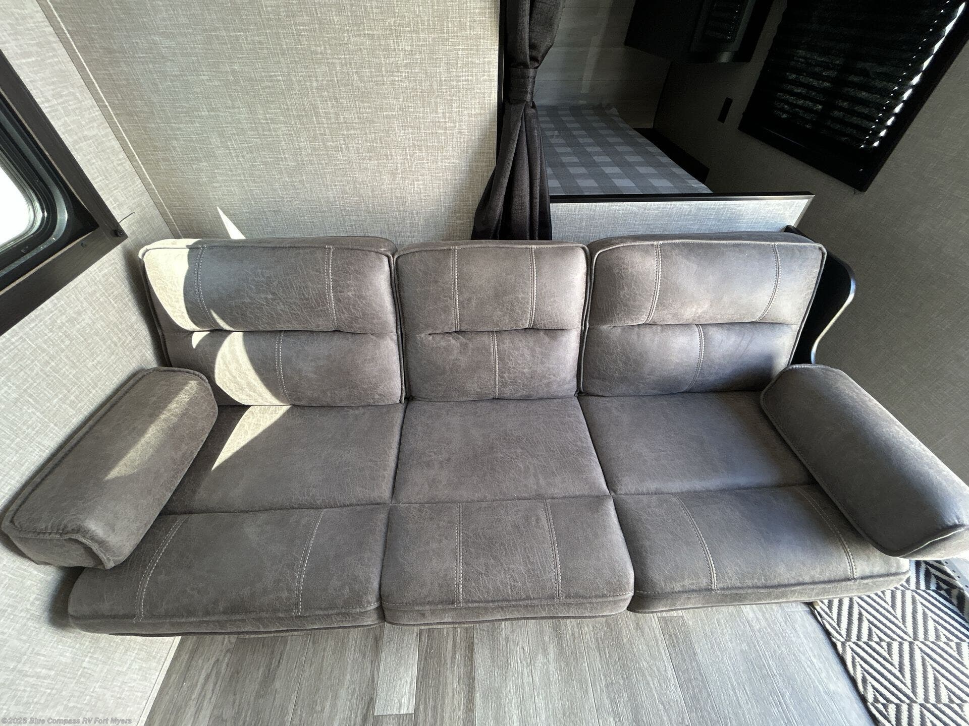 This easy to setup trailer offers a semi-private bedroom up front with a queen bed, semi-private double size bunks in the rear thanks to the curtains, and a private toilet and tub/shower room. The bathroom sink is just outside the door allowing two people to get ready for bed at once. The galley kitchen offers full amenities, and two can dine at the booth dinette and some can relax on the jack-knife sofa. Both furnishings offer extra sleeping space. And you might like to add the Chil N' Stor option which adds a fridge and counter space along the exterior to serve meals outside and store extra beverages.