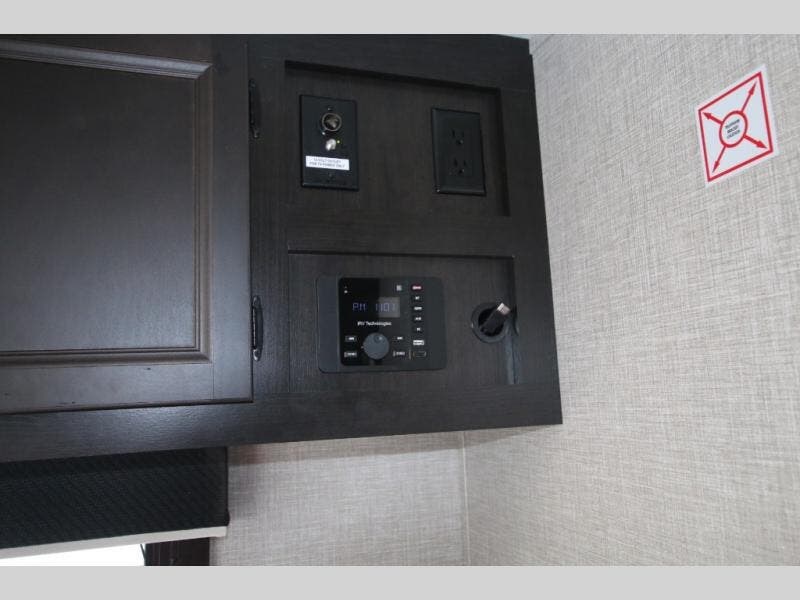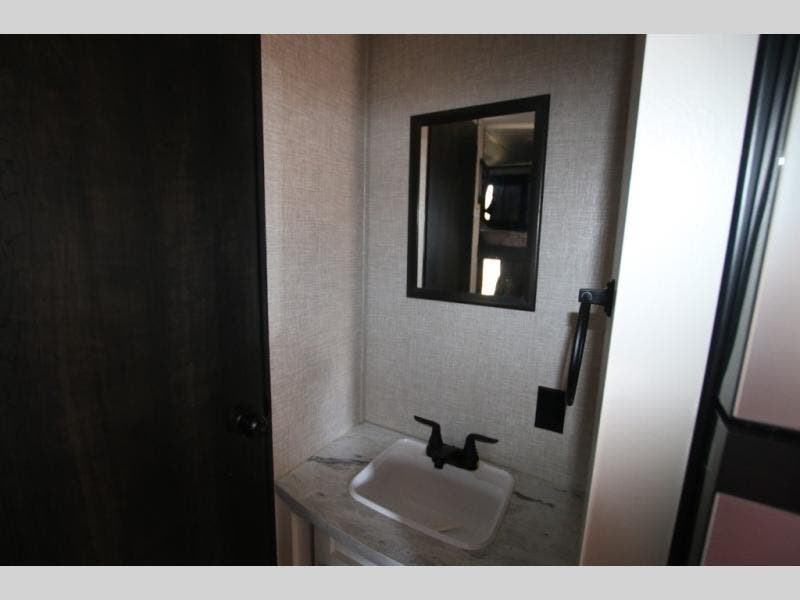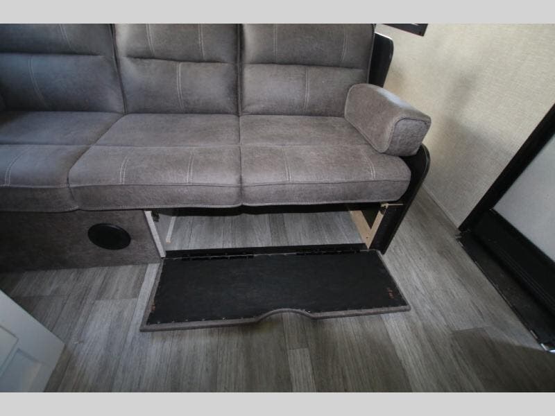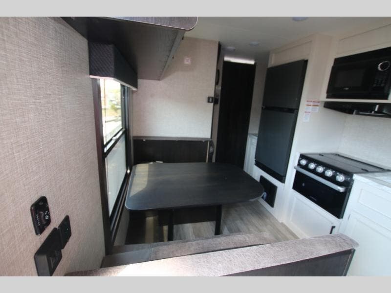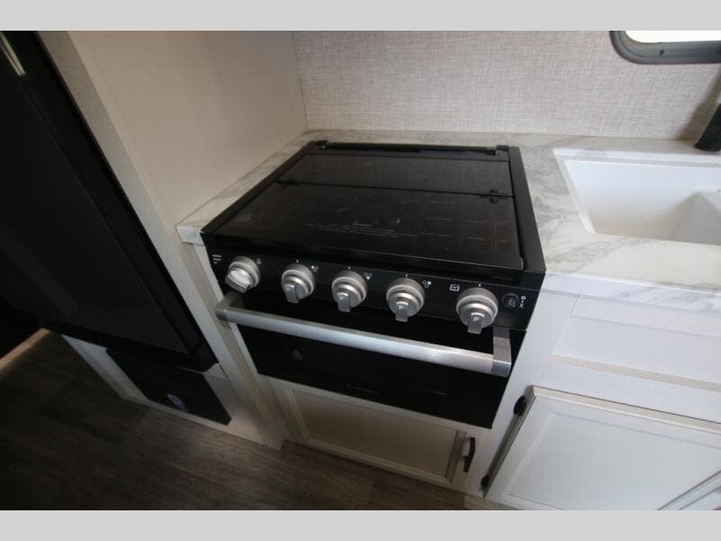 This easy to setup trailer offers a semi-private bedroom up front with a queen bed, semi-private double size bunks in the rear thanks to the curtains, and a private toilet and tub/shower room. The bathroom sink is just outside the door allowing two people to get ready for bed at once. The galley kitchen offers full amenities, and two can dine at the booth dinette and some can relax on the jack-knife sofa. Both furnishings offer extra sleeping space. And you might like to add the Chil N' Stor option which adds a fridge and counter space along the exterior to serve meals outside and store extra beverages.