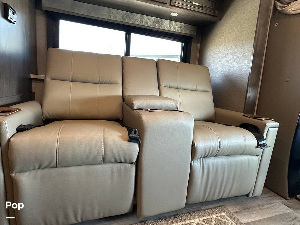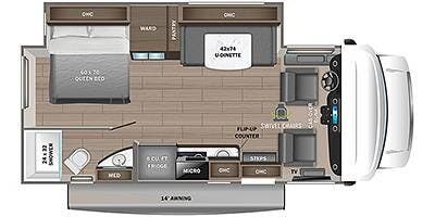 The 2023 Jayco Melbourne 24L is a full-wall slide model that makes this 24' RV feel much larger than it is. It has an open floor plan that extends from behind the driver & passenger seats all the way back to the rear walk-around queen bed, with a nice-sized corner bath. This unit also features the optional reclining theatre seating in place of the standard dinette.