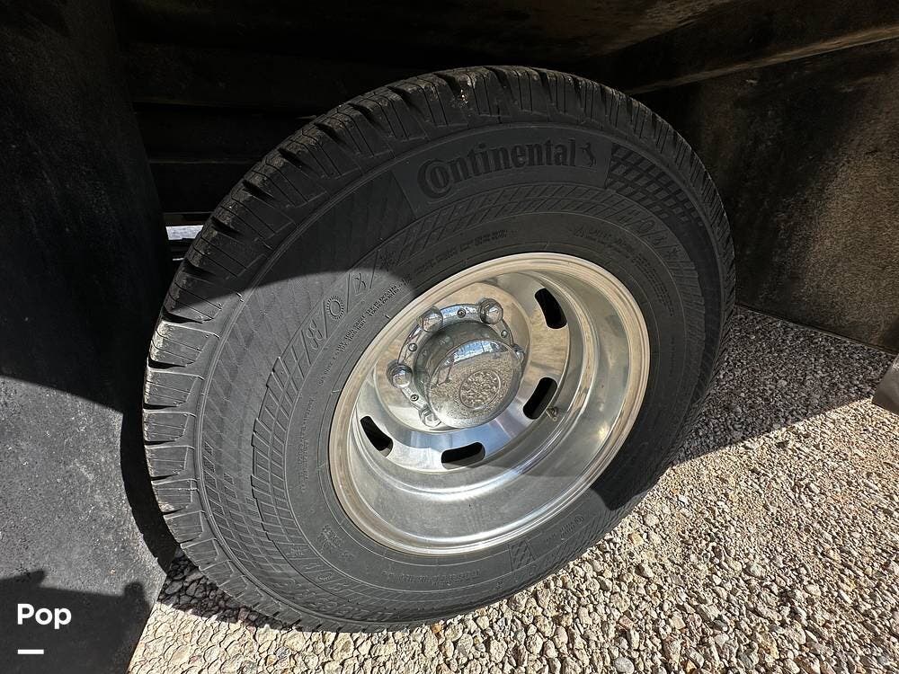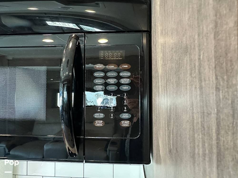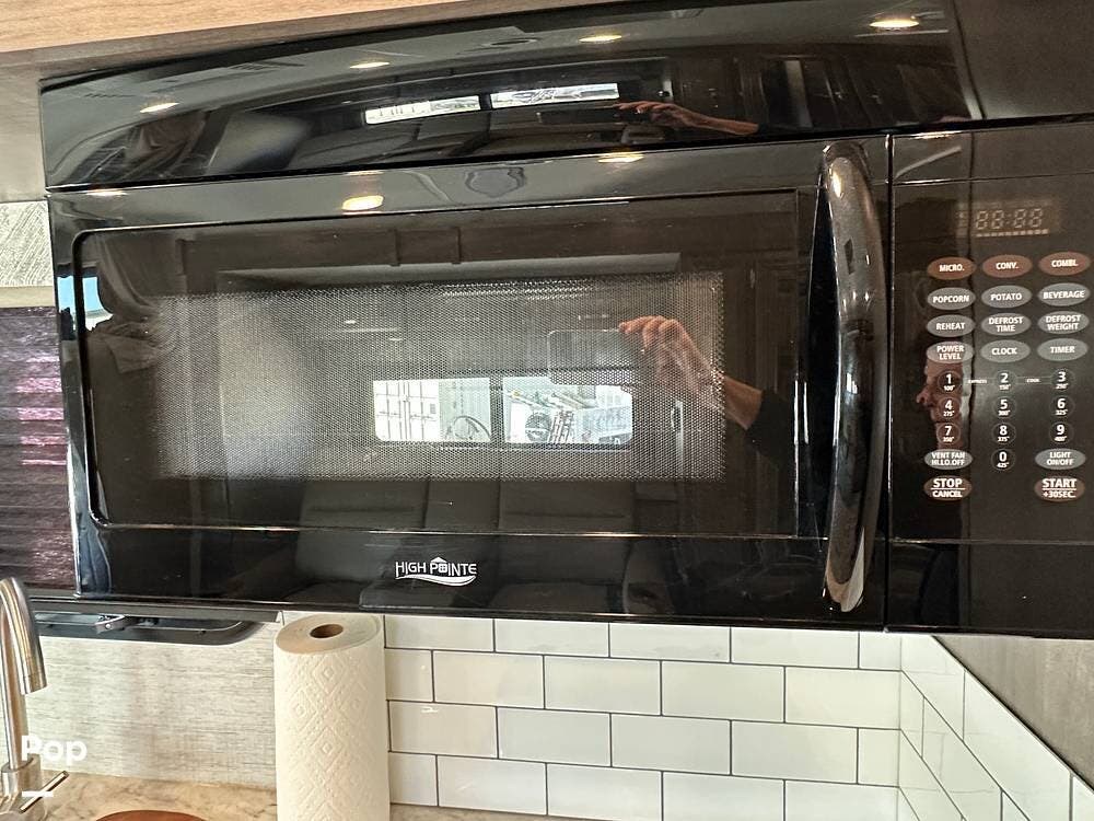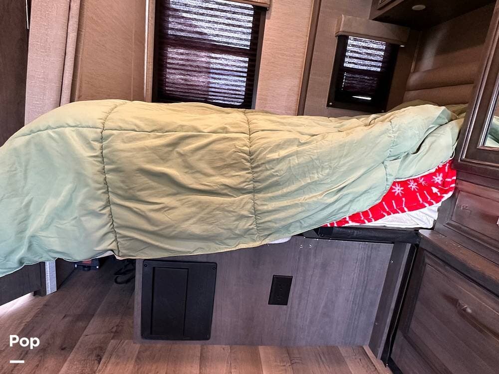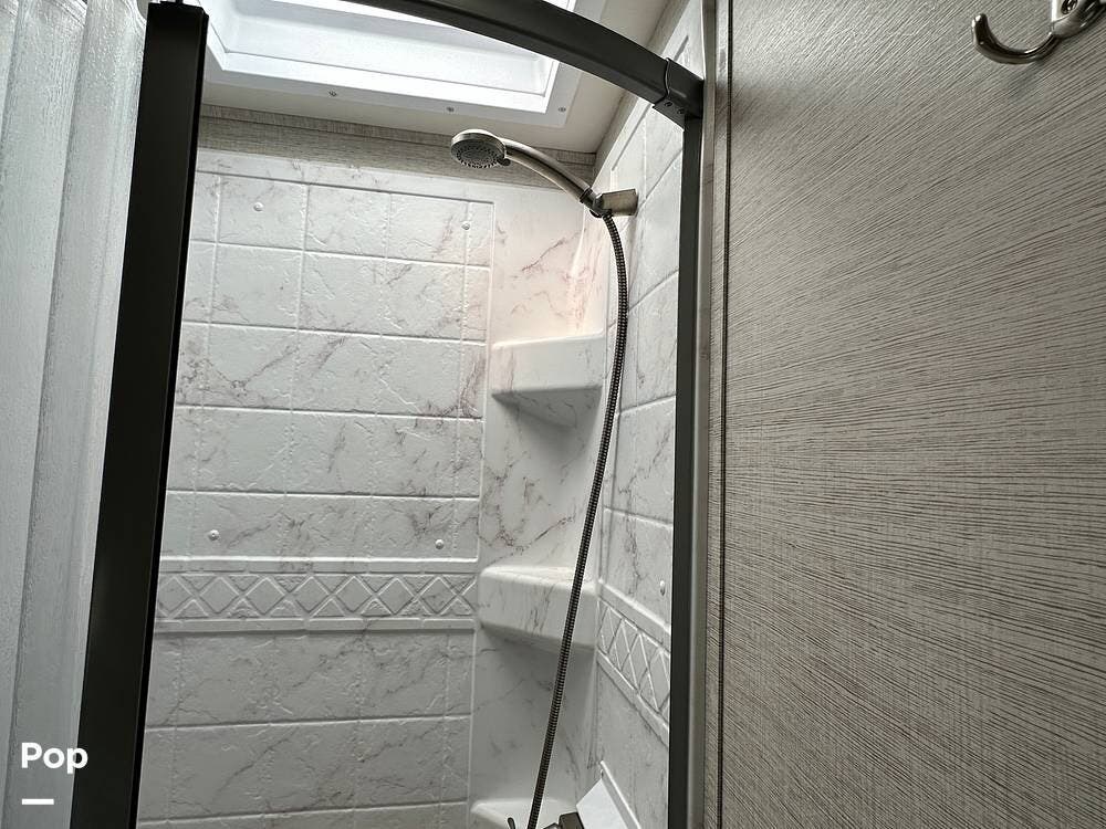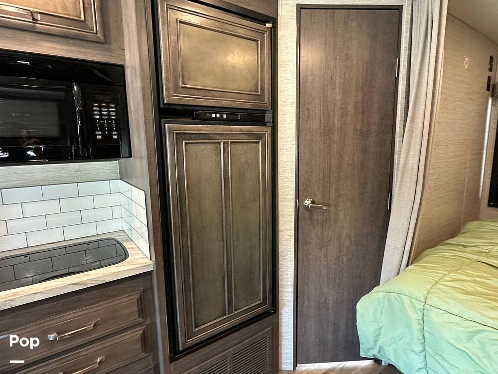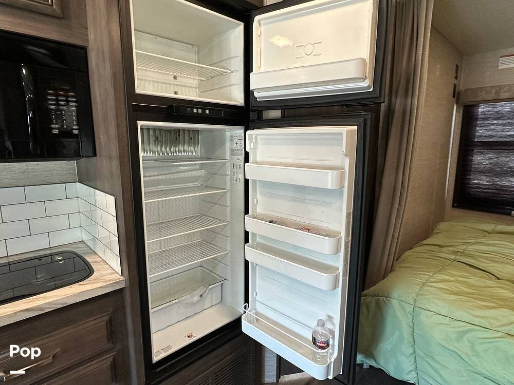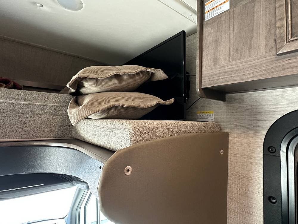 Other interior features include an over-cab bunk for two with a weight capacity of 750 lbs, an 8cf fridge/freezer, a 2-burner cooktop, and a convection microwave. This unit is heated by a 30,000 BTU ducted furnace and cooled by a 13,500 BTU AC unit.
