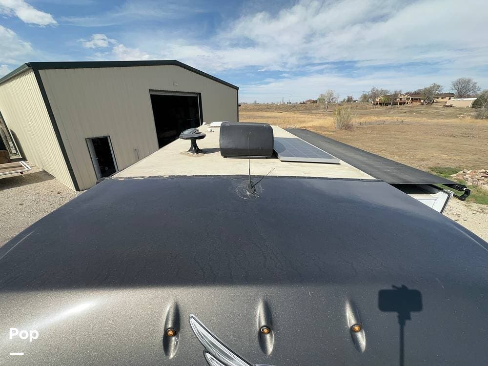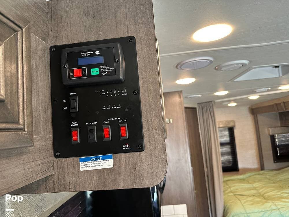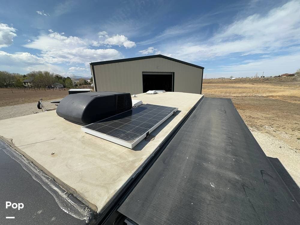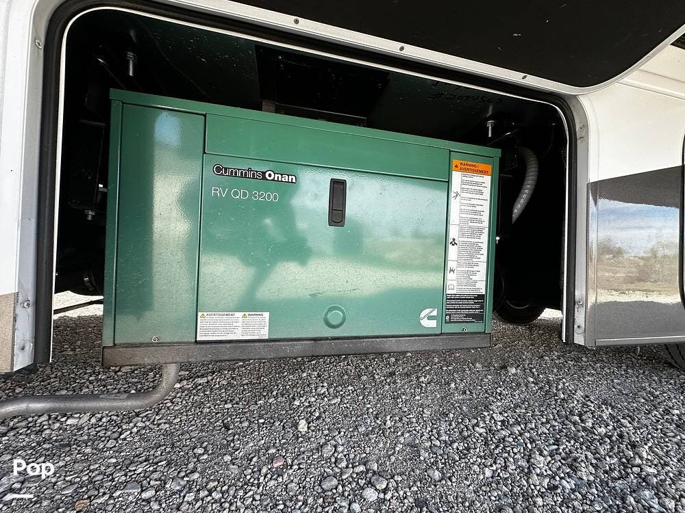 Off-grid features include a roof-mounted solar panel and an Onan QD 3.2kW generator. There are electronic stabilizer jacks, frameless windows, and a 5,000 lb tow capacity.